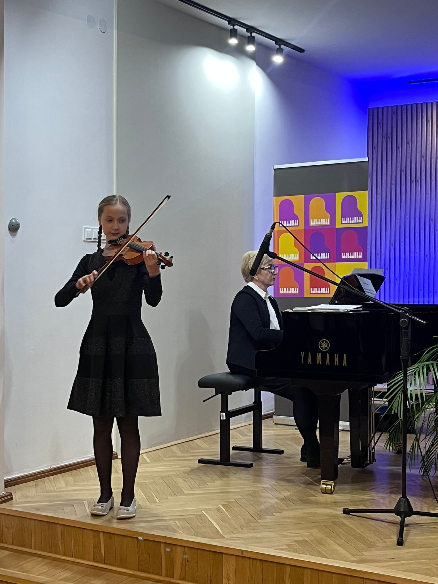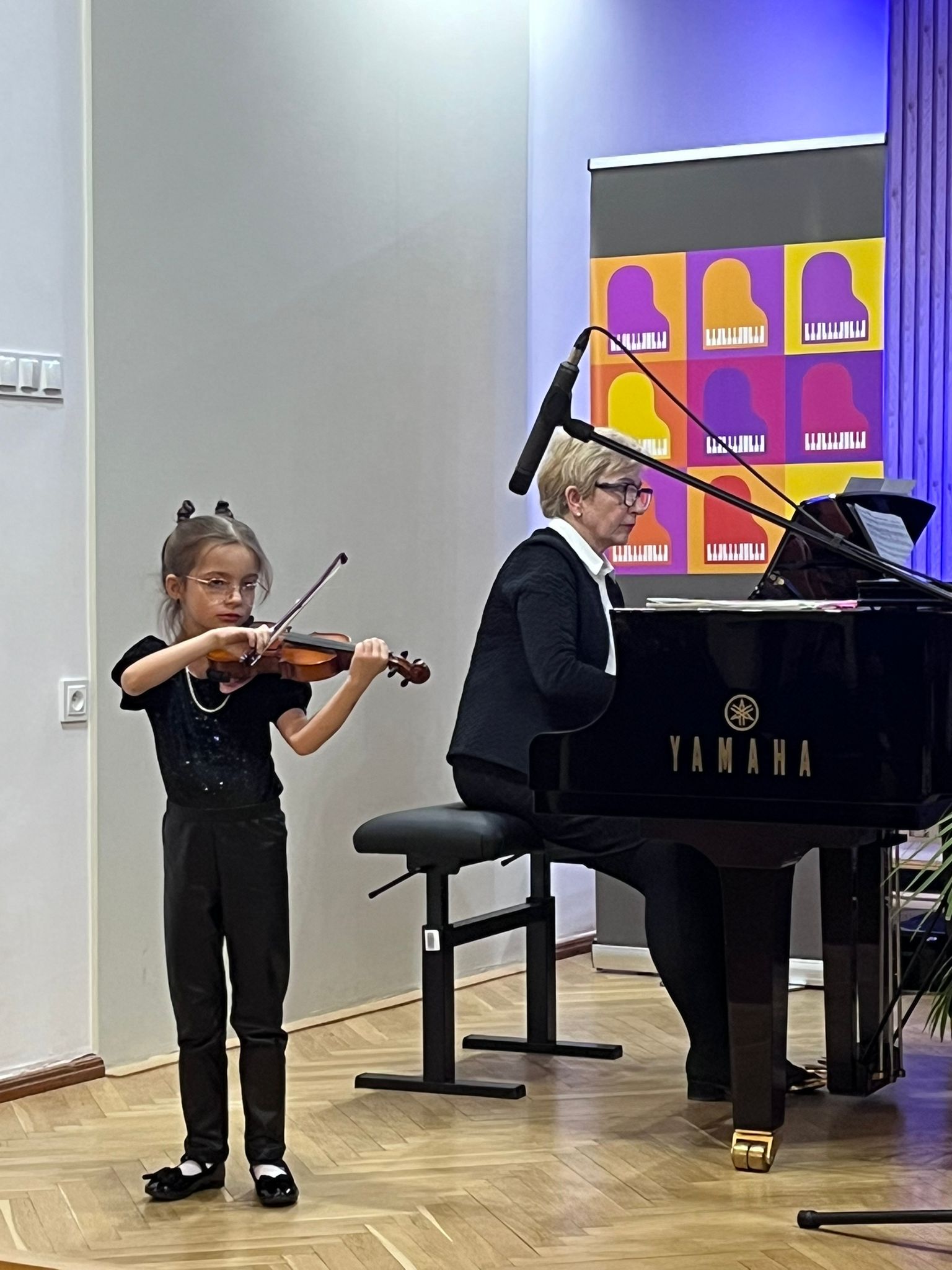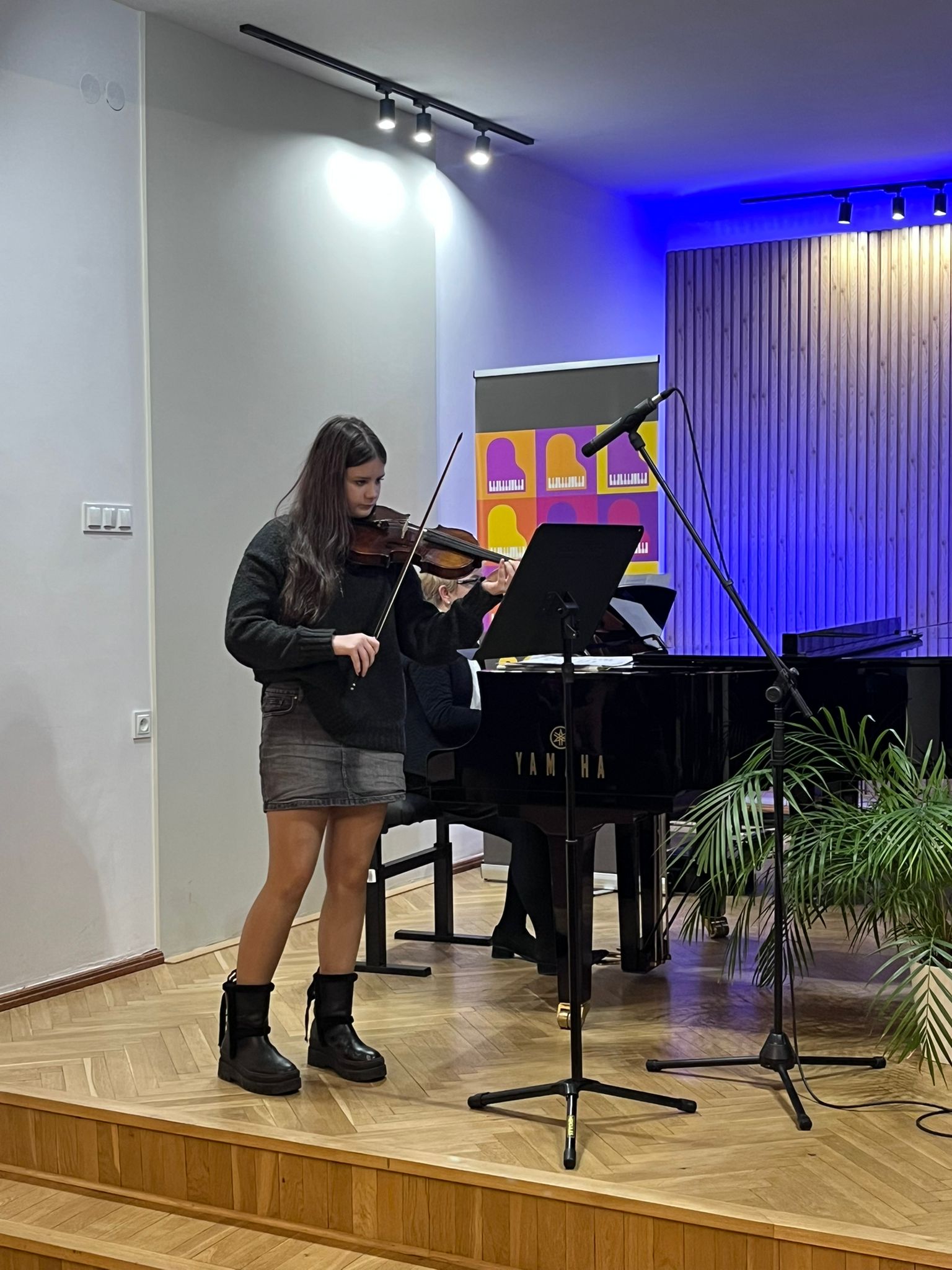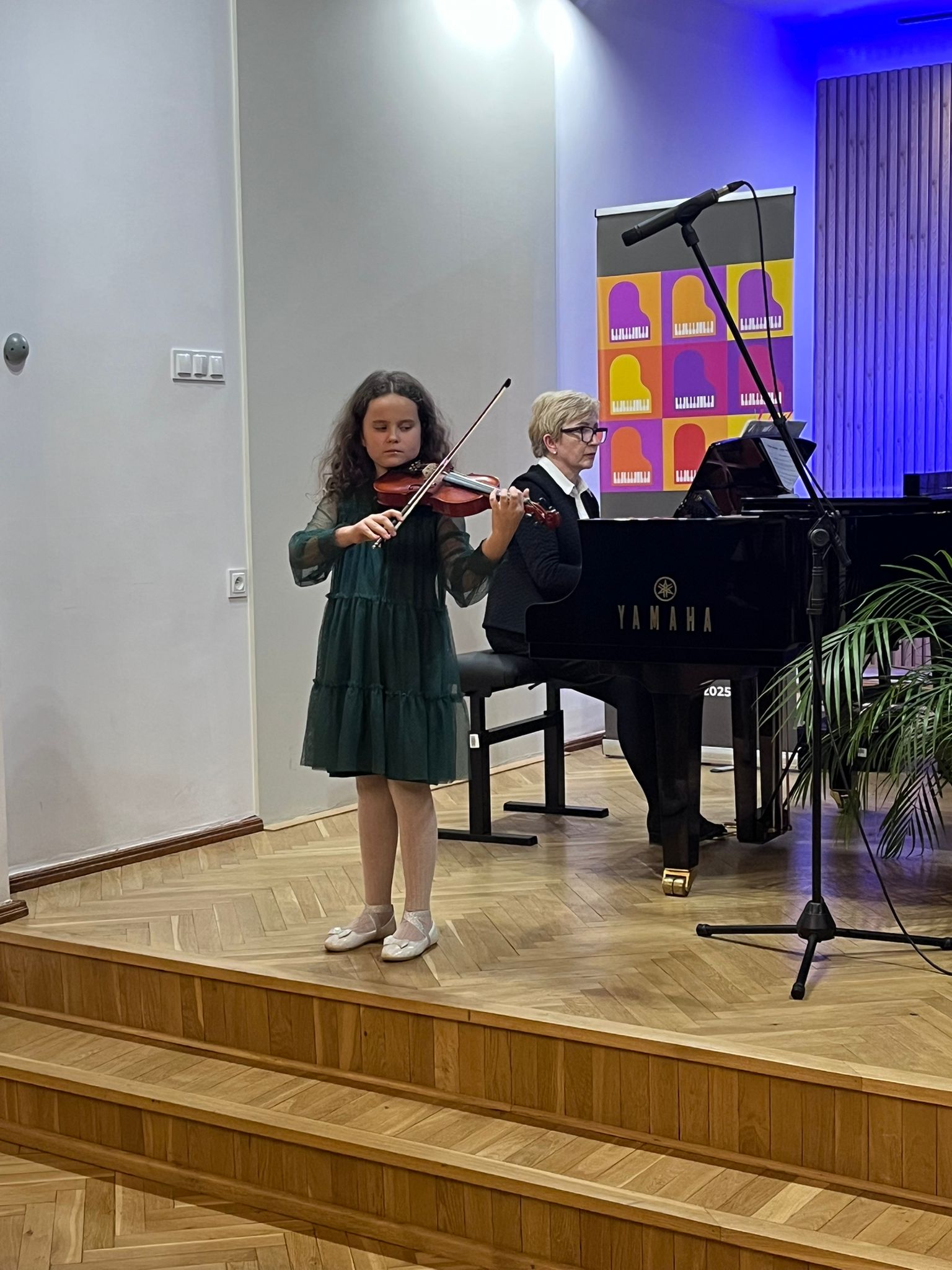 W poniedziałek 1 grudnia 2025 r. podczas koncertu swoje umiejętności prezentowali uczniowie z klasy skrzypiec pani Krystyny Ślęzak.