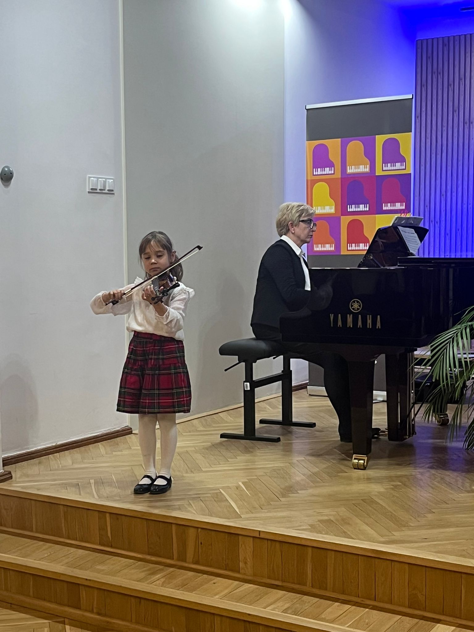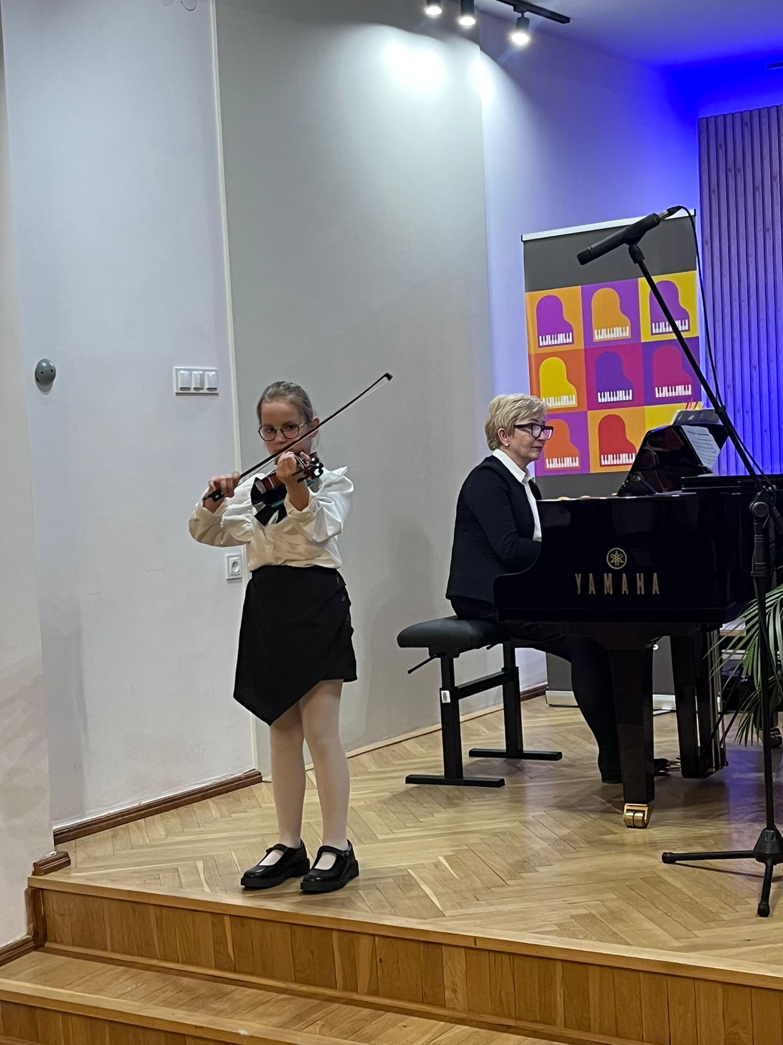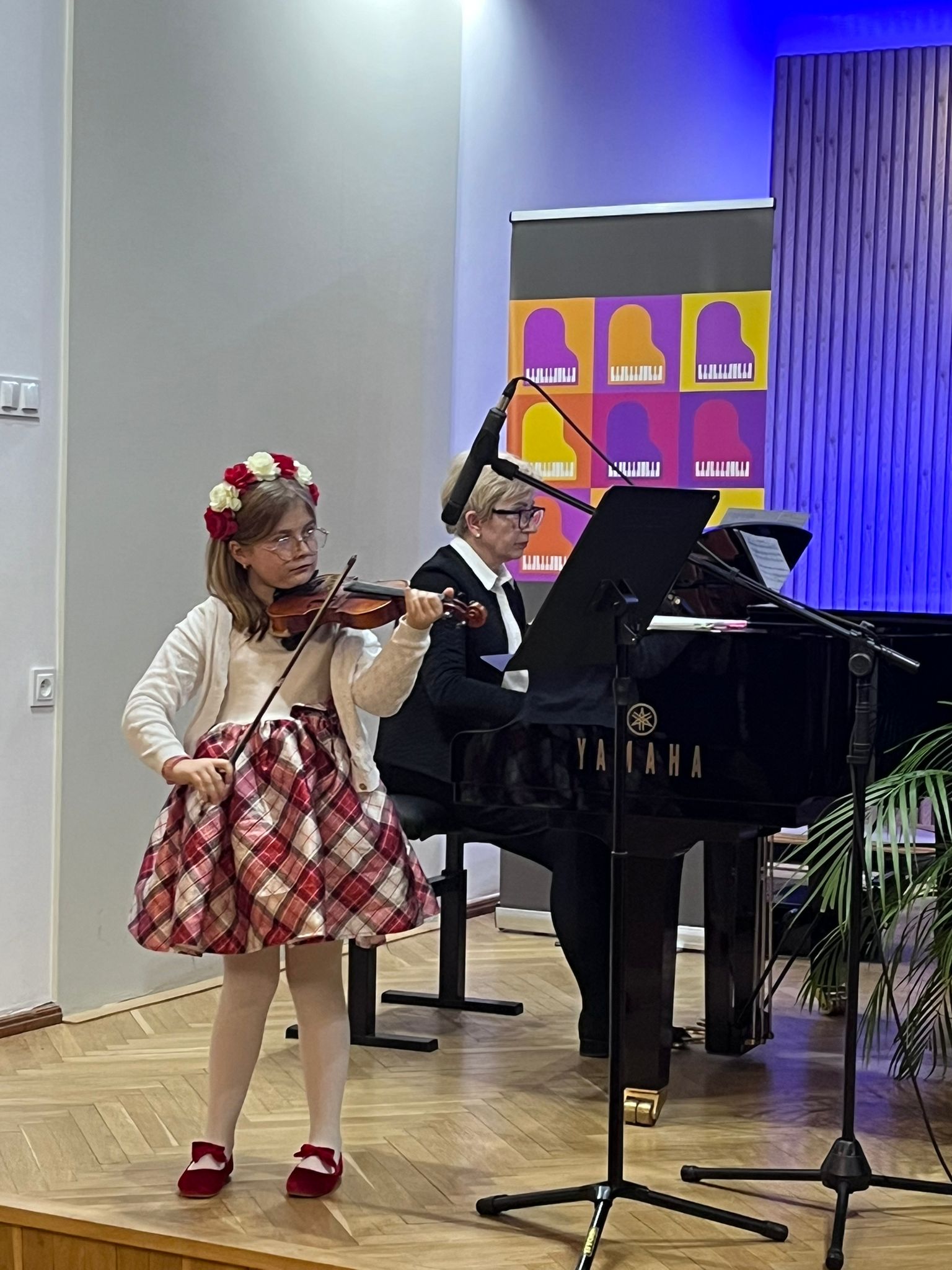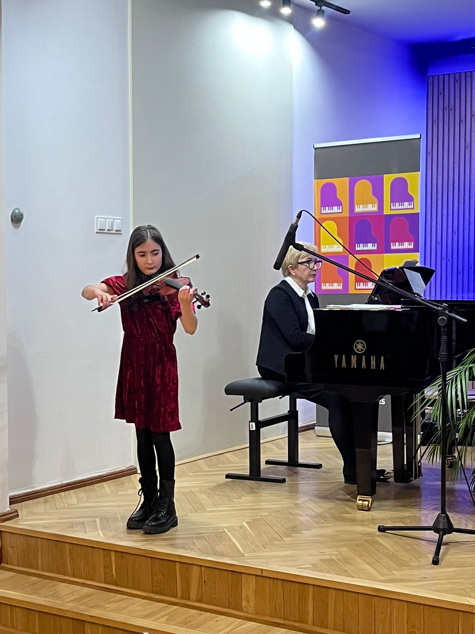 W poniedziałek 1 grudnia 2025 r. podczas koncertu swoje umiejętności prezentowali uczniowie z klasy skrzypiec pani Krystyny Ślęzak.
