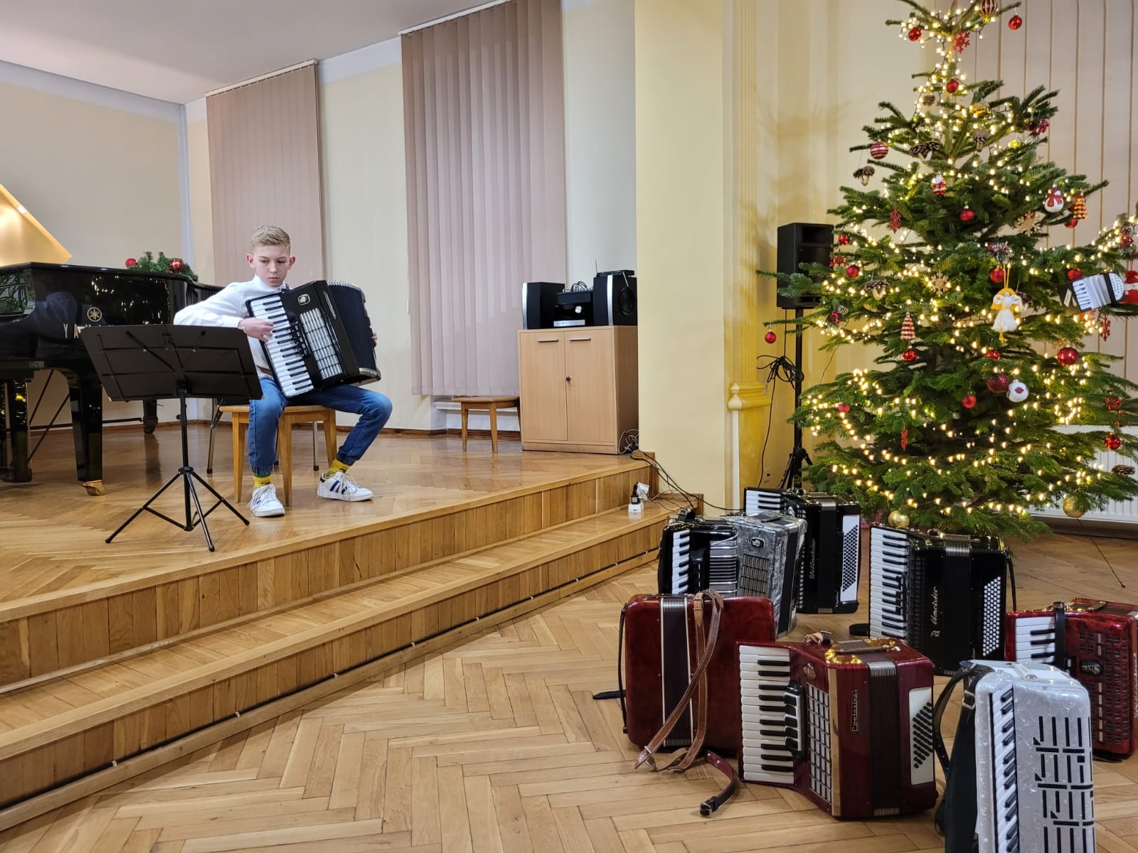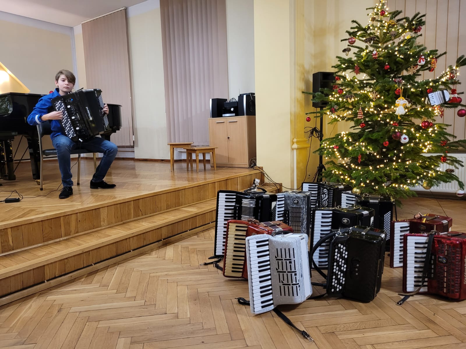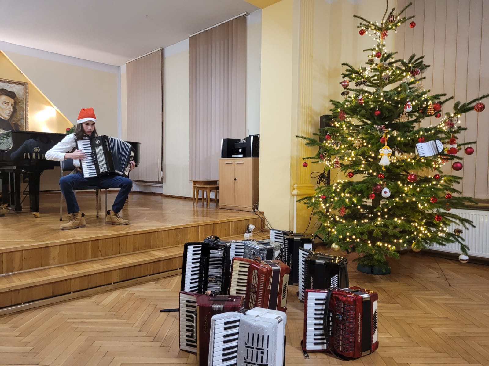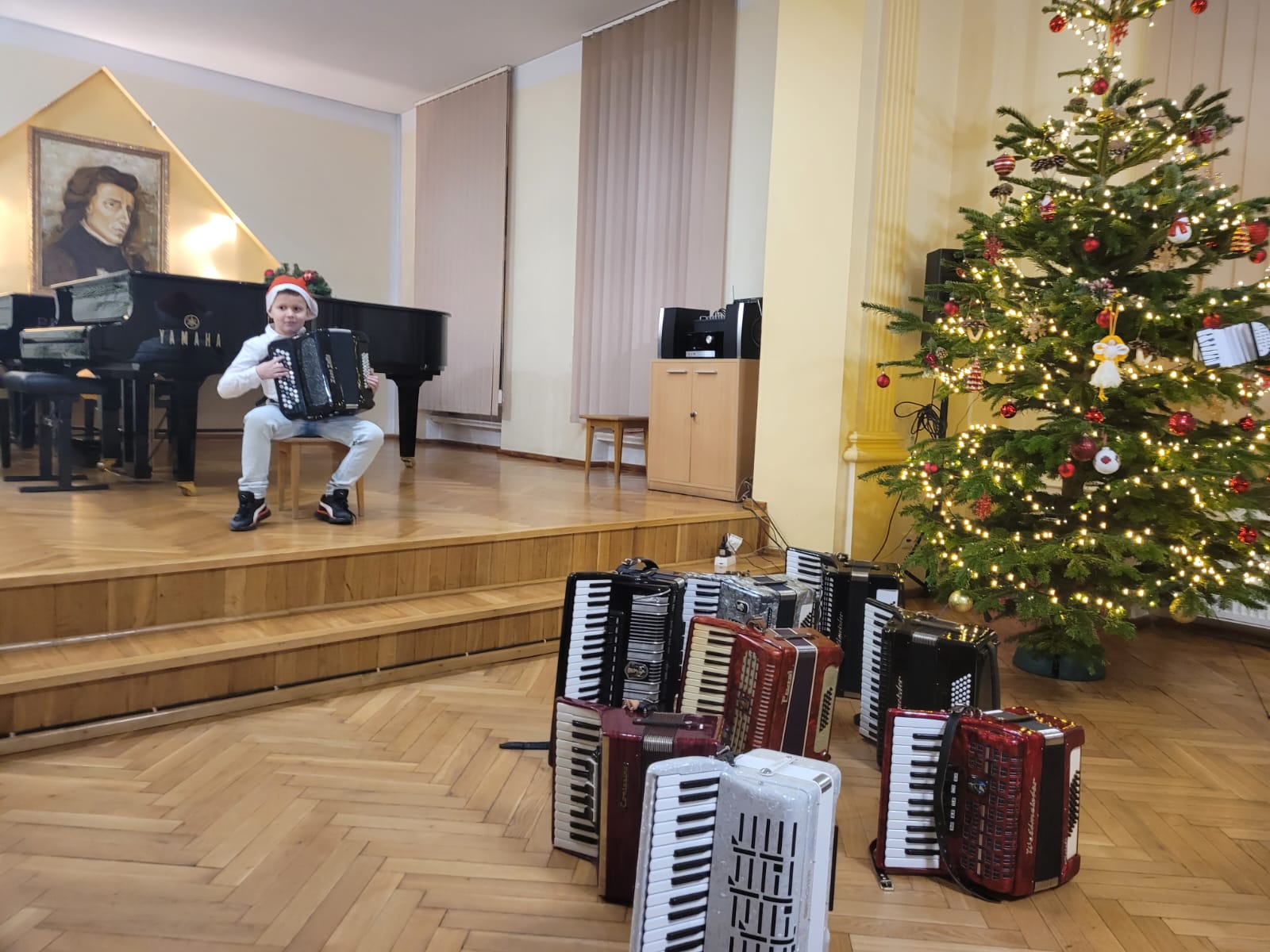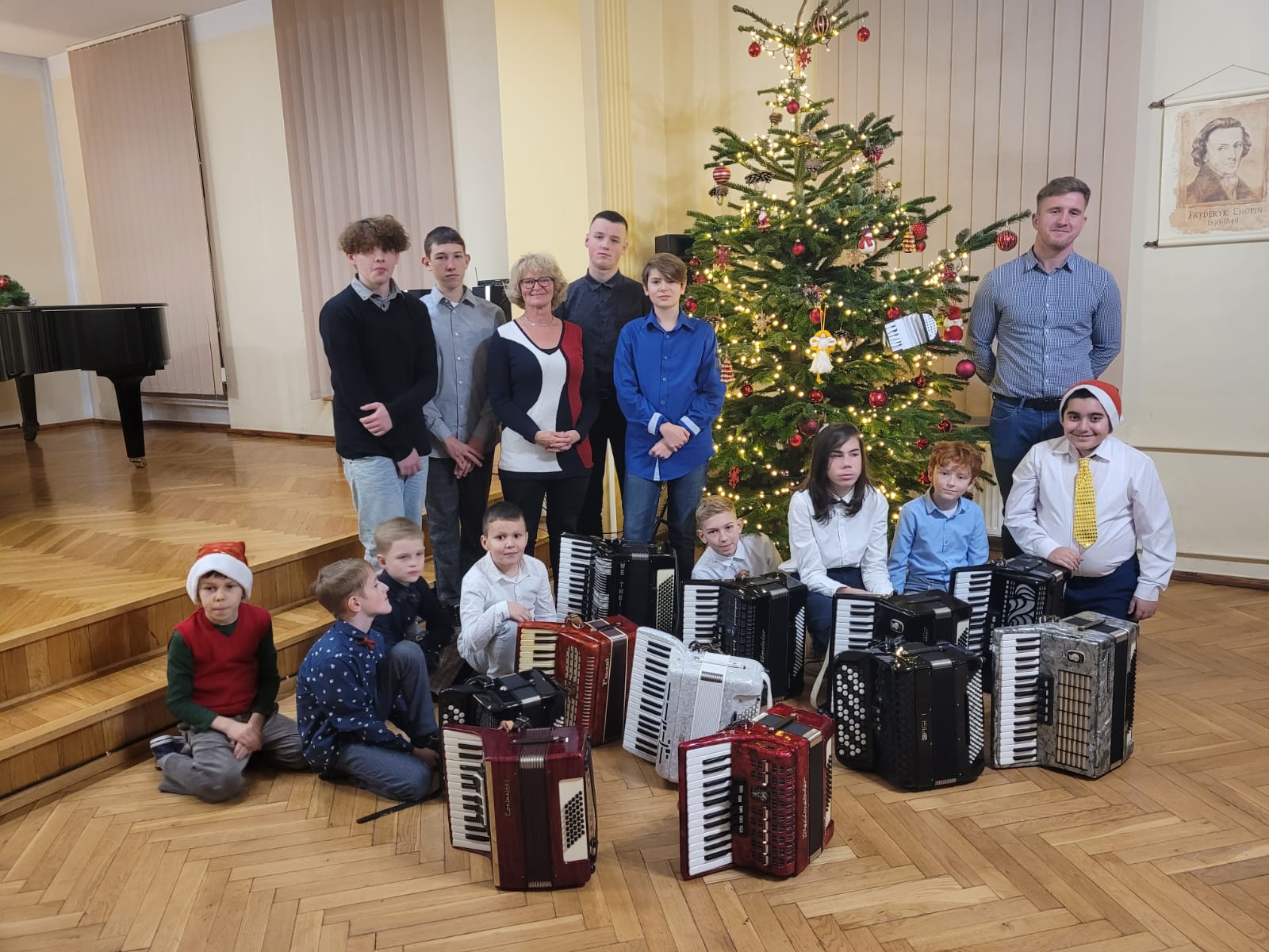 W związku ze zbliżającymi się świętami Bożego Narodzenia uczniowie klasy akordeonu przygotowują szereg kolęd aby w gronie rodzinnym zgodnie z tradycją móc wspólnie uczcić muzycznie ten czas. Na koncercie dnia 13. XII uczniowie wystąpili solo, w duecie oraz w akordeonowym unisonie złożonym ze wszystkich uczniów wykonujących kolędę „Pójdźmy wszyscy do stajenki”. Oprócz uczniów wystąpił nasz absolwent Oskar Gałęski wykonując dwie kolędy na akordeonie elektronicznym prezentując nowe możliwości brzmieniowe tego instrumentu.Przygotowując się do świątecznej atmosfery rodzice uczniów z inicjatywy mamy Tymka Machosia zorganizowali słodki poczęstunek oraz drobne świąteczne prezenty dla każdego ucznia. Na choince natomiast zawisły wspaniałe ozdoby wykonane przez naszych uczniów: Mikołaj , Aniołek i Akordeon ! Spotkanie przebiegło w miłej atmosferze z poczuciem dobrego przygotowania do muzycznego świętowania.