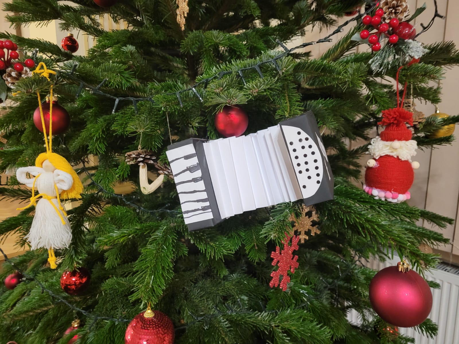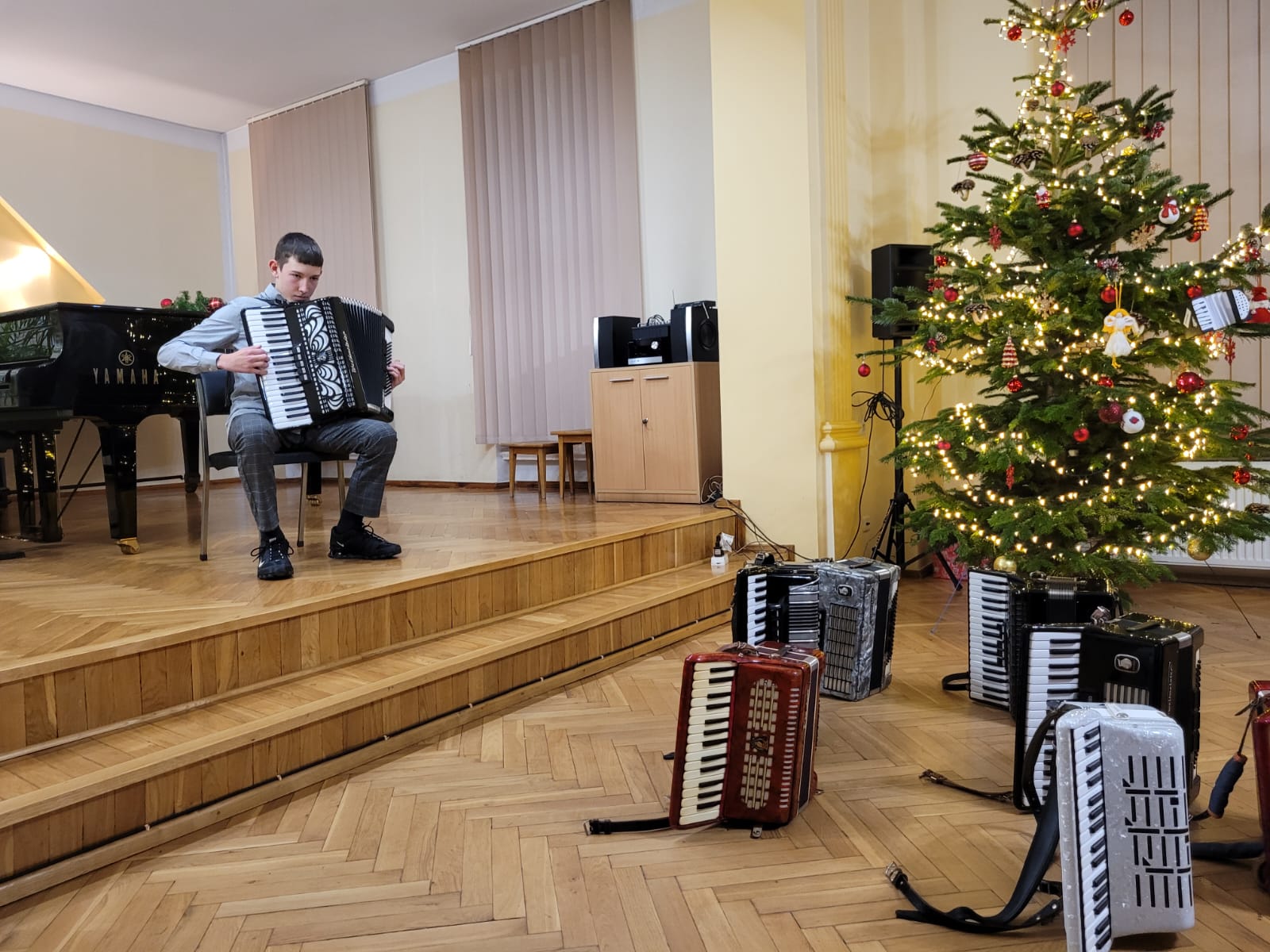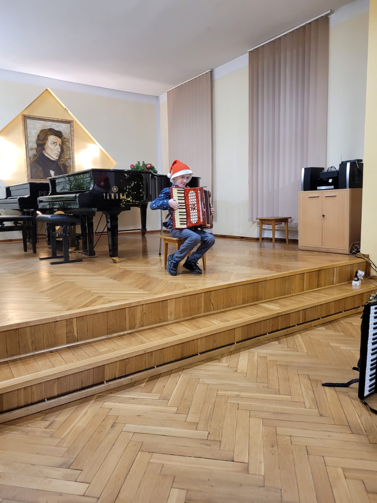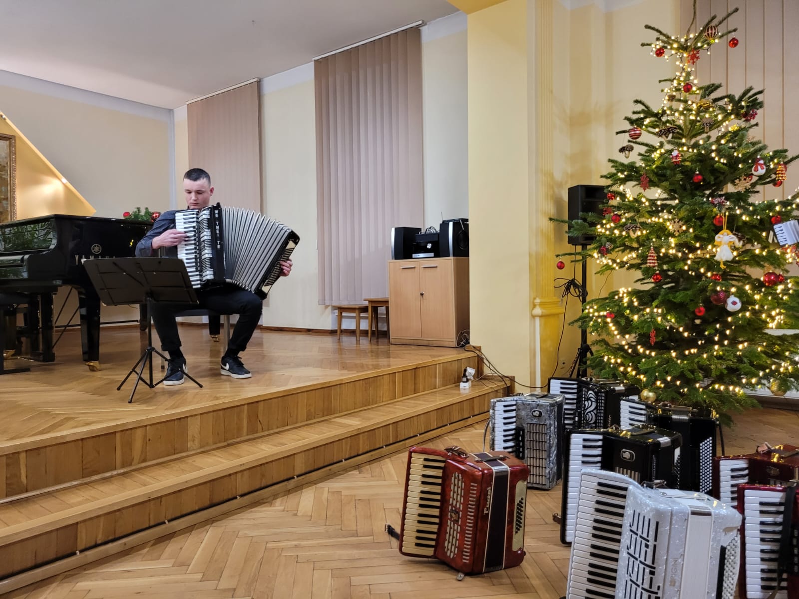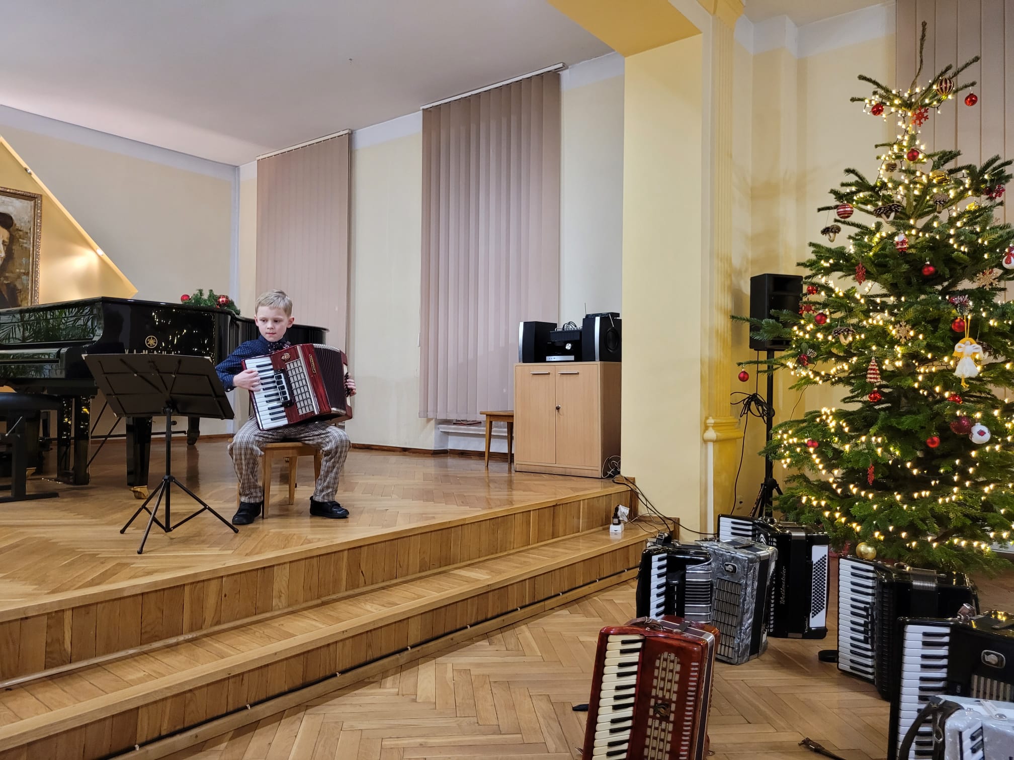 W związku ze zbliżającymi się świętami Bożego Narodzenia uczniowie klasy akordeonu przygotowują szereg kolęd aby w gronie rodzinnym zgodnie z tradycją móc wspólnie uczcić muzycznie ten czas. Na koncercie dnia 13. XII uczniowie wystąpili solo, w duecie oraz w akordeonowym unisonie złożonym ze wszystkich uczniów wykonujących kolędę „Pójdźmy wszyscy do stajenki”. Oprócz uczniów wystąpił nasz absolwent Oskar Gałęski wykonując dwie kolędy na akordeonie elektronicznym prezentując nowe możliwości brzmieniowe tego instrumentu.Przygotowując się do świątecznej atmosfery rodzice uczniów z inicjatywy mamy Tymka Machosia zorganizowali słodki poczęstunek oraz drobne świąteczne prezenty dla każdego ucznia. Na choince natomiast zawisły wspaniałe ozdoby wykonane przez naszych uczniów: Mikołaj , Aniołek i Akordeon ! Spotkanie przebiegło w miłej atmosferze z poczuciem dobrego przygotowania do muzycznego świętowania.