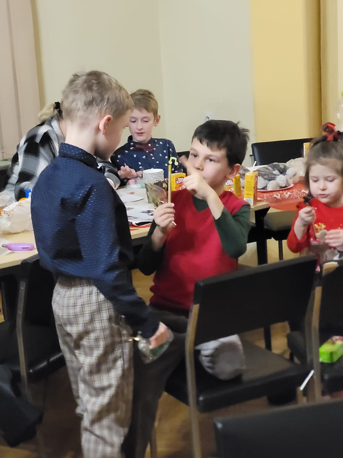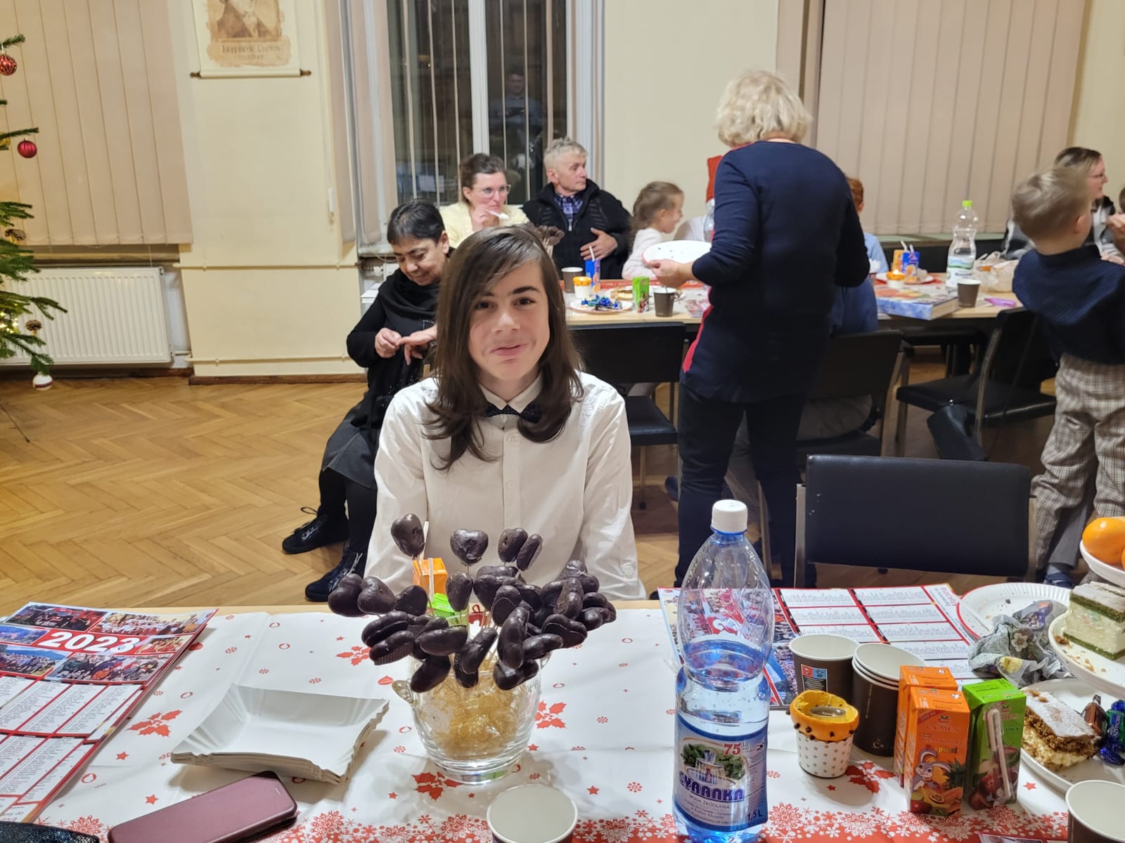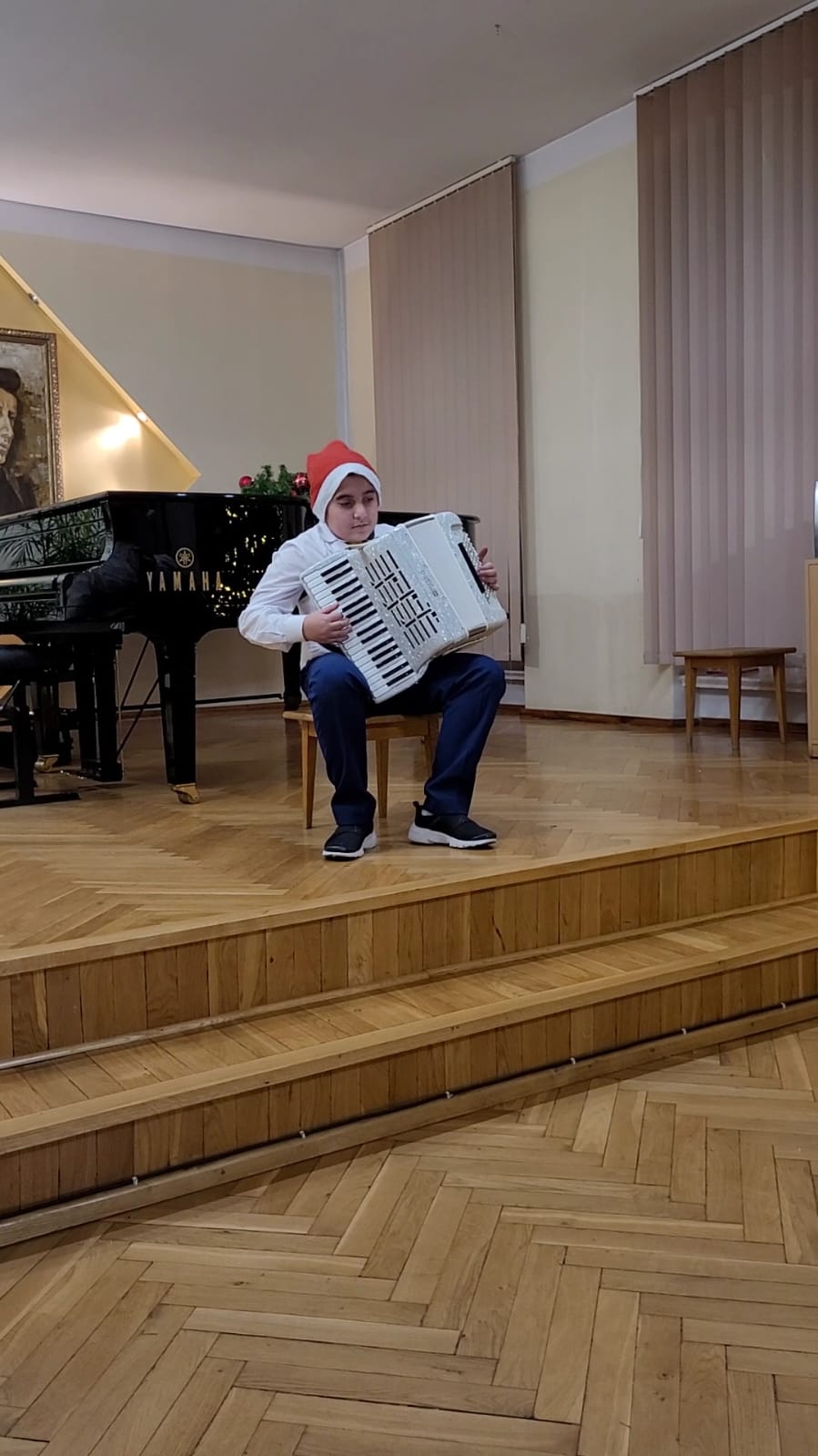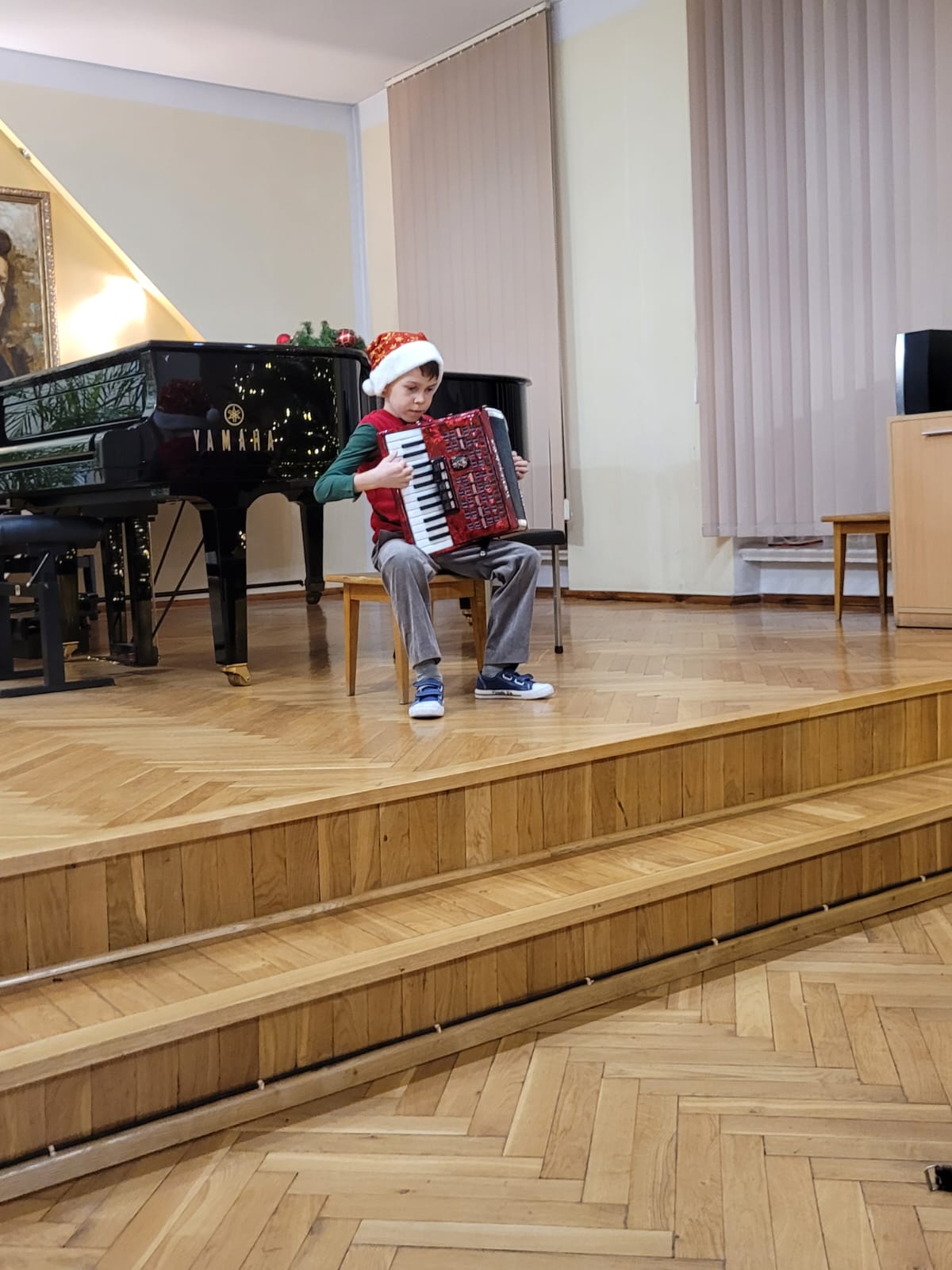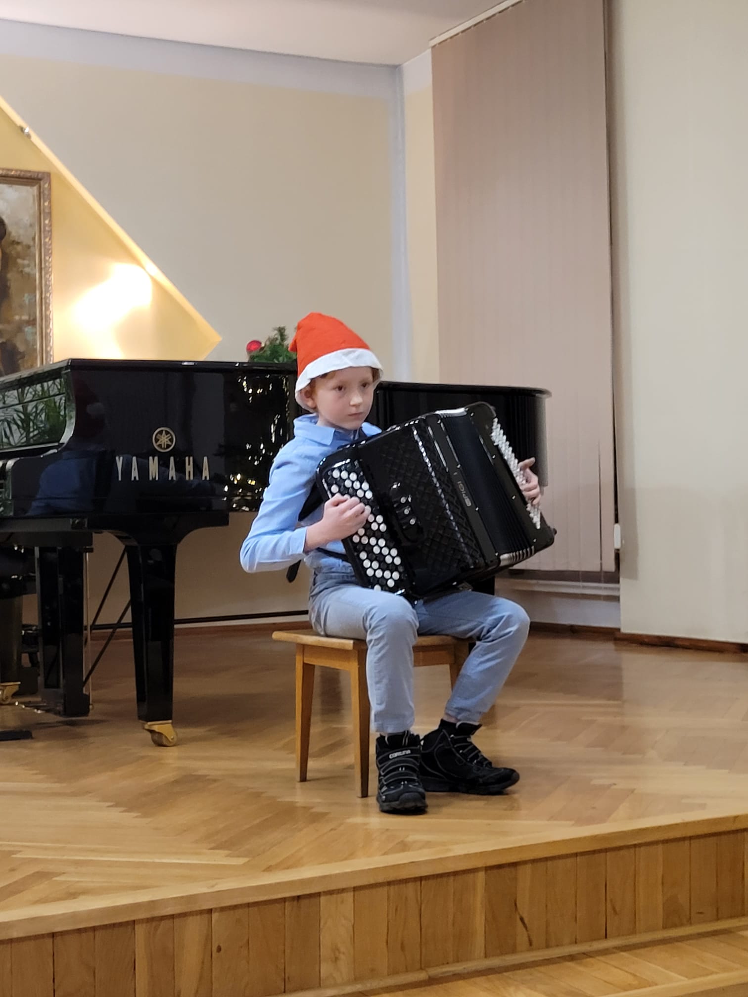 W związku ze zbliżającymi się świętami Bożego Narodzenia uczniowie klasy akordeonu przygotowują szereg kolęd aby w gronie rodzinnym zgodnie z tradycją móc wspólnie uczcić muzycznie ten czas. Na koncercie dnia 13. XII uczniowie wystąpili solo, w duecie oraz w akordeonowym unisonie złożonym ze wszystkich uczniów wykonujących kolędę „Pójdźmy wszyscy do stajenki”. Oprócz uczniów wystąpił nasz absolwent Oskar Gałęski wykonując dwie kolędy na akordeonie elektronicznym prezentując nowe możliwości brzmieniowe tego instrumentu.Przygotowując się do świątecznej atmosfery rodzice uczniów z inicjatywy mamy Tymka Machosia zorganizowali słodki poczęstunek oraz drobne świąteczne prezenty dla każdego ucznia. Na choince natomiast zawisły wspaniałe ozdoby wykonane przez naszych uczniów: Mikołaj , Aniołek i Akordeon ! Spotkanie przebiegło w miłej atmosferze z poczuciem dobrego przygotowania do muzycznego świętowania.