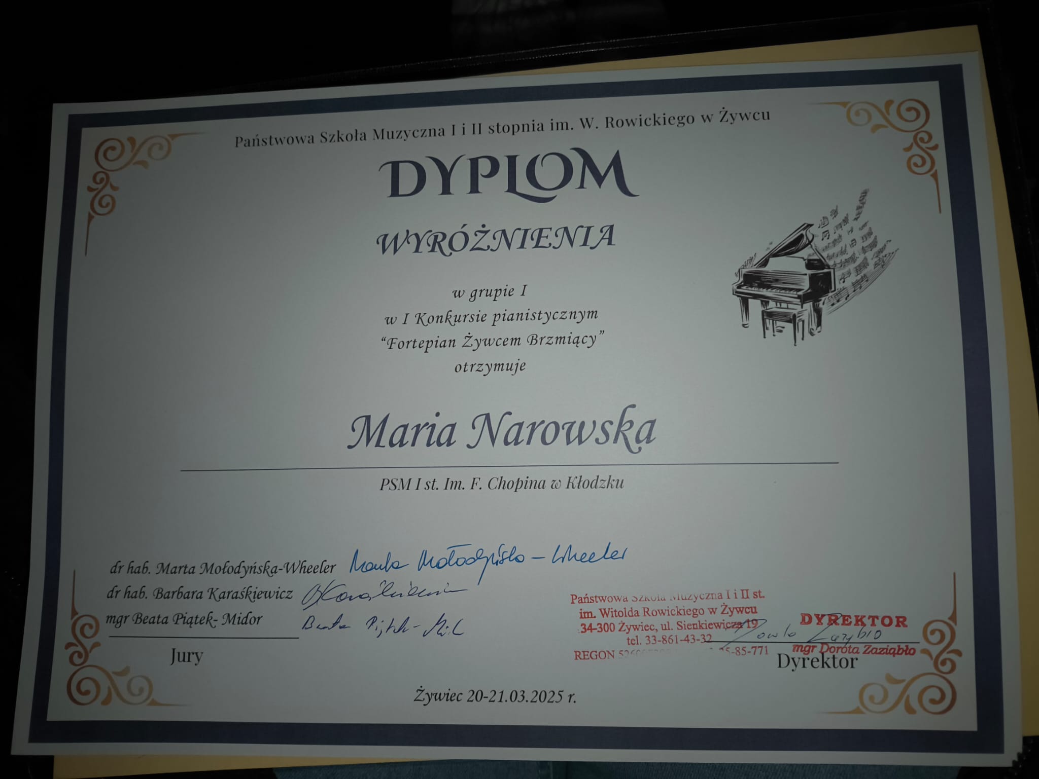 Sukces naszej uczennicy na I Ogólnopolskim Konkursie Pianistycznym "Fortepian Żywcem brzmiący" 20-21.03.2025