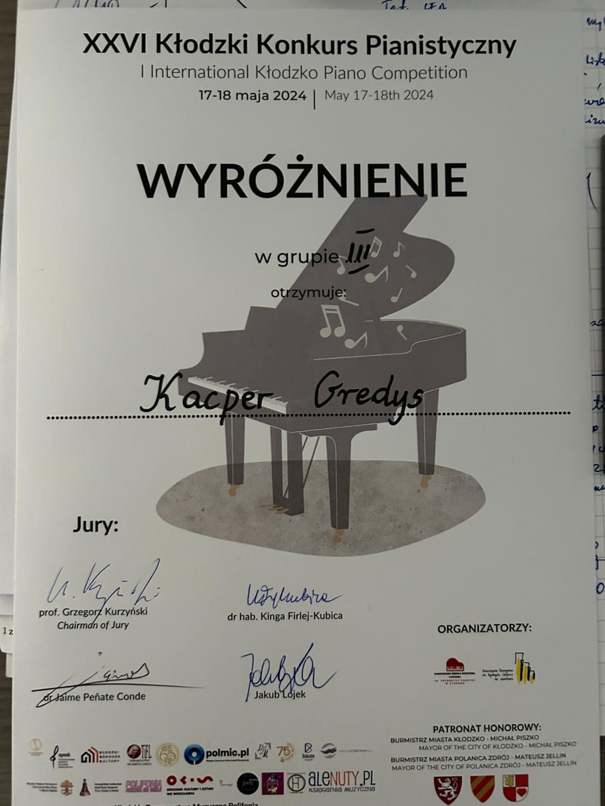 Sukces naszych uczniów na XXVI Kłodzkim Konkursie Pianistycznym 17 - 18 maja 2024 r.