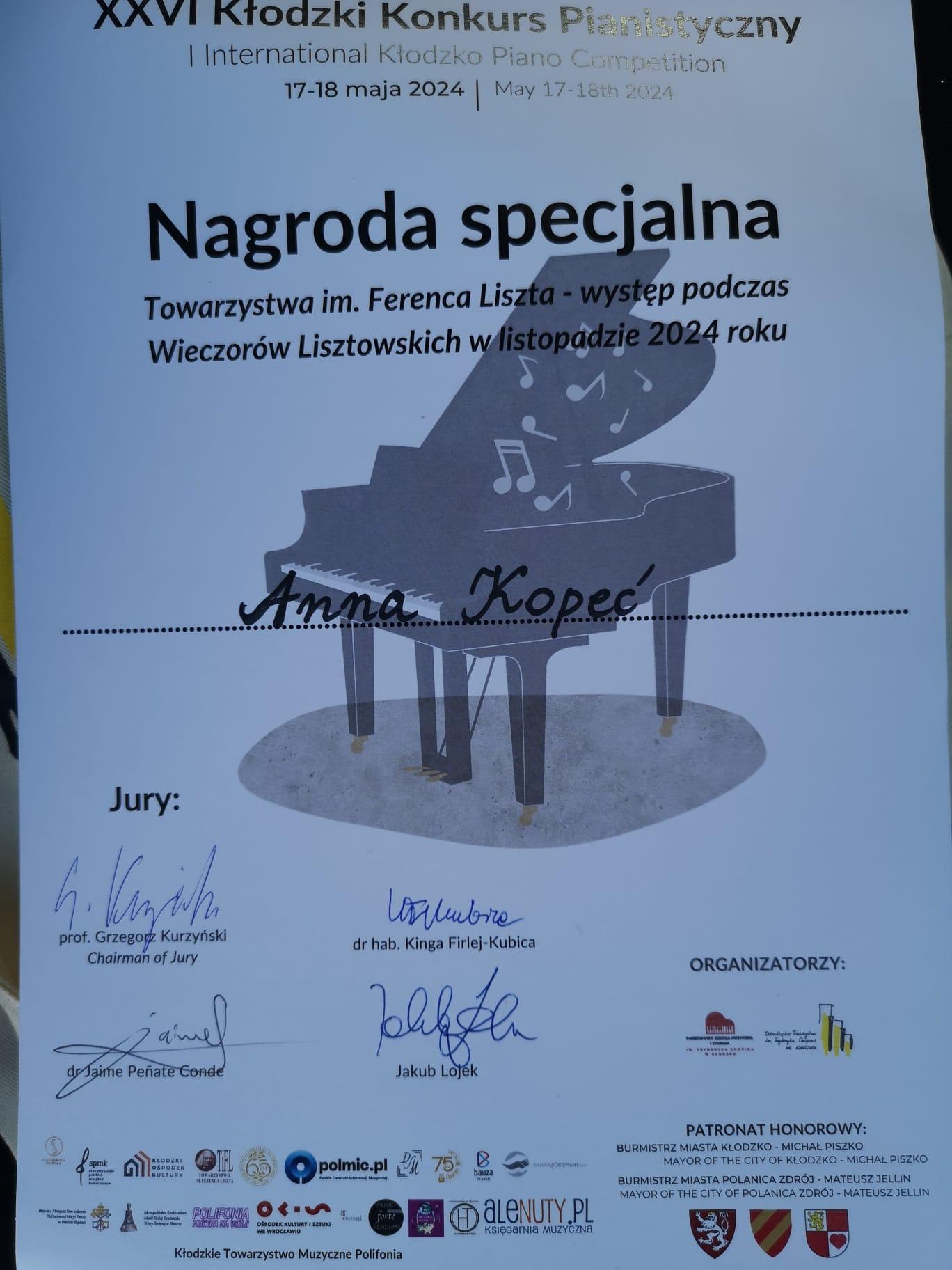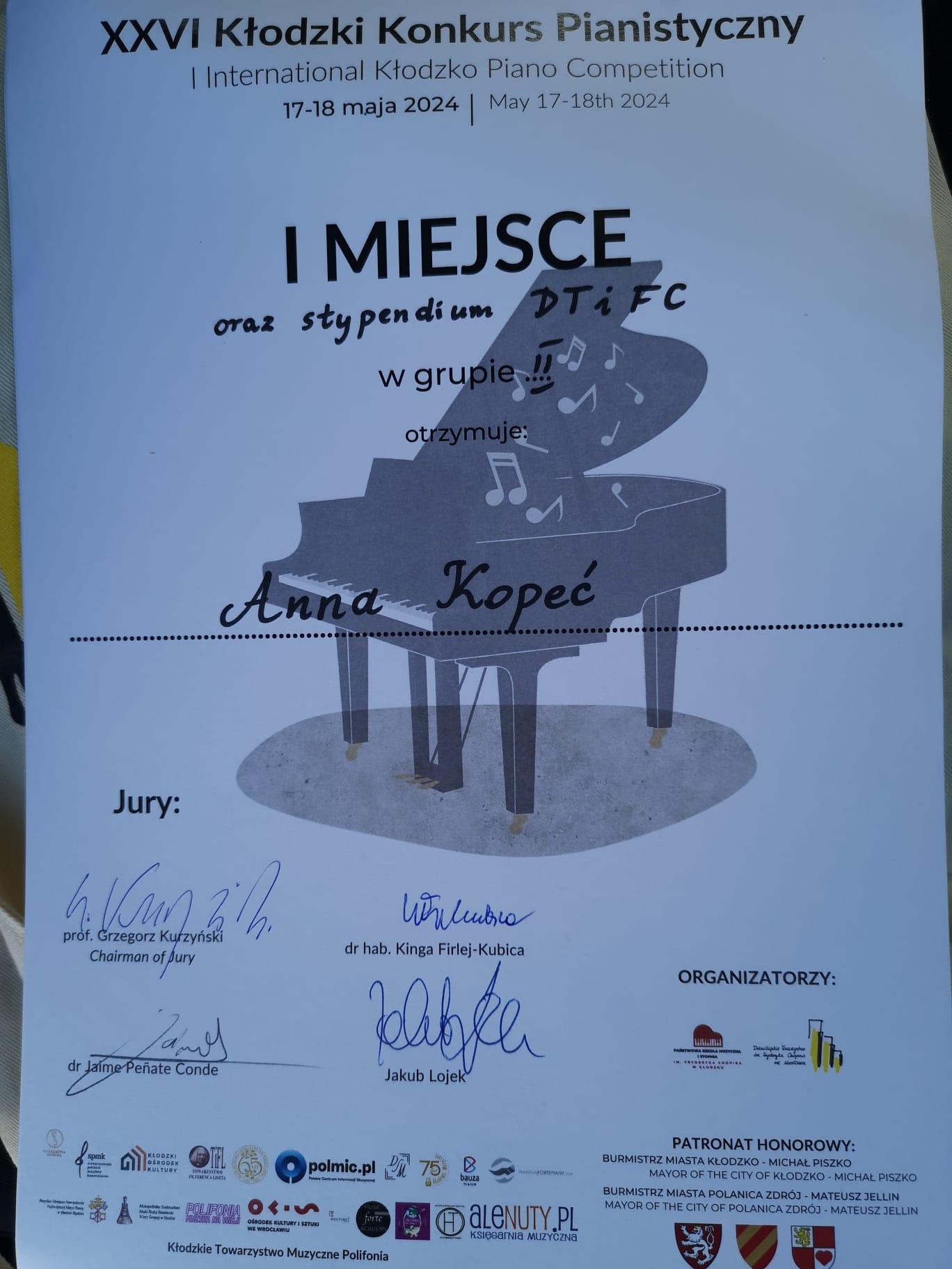 Uczennica klasy II cykl 6 letni Anna Kopeć zdobyła I miejsce w grupie II oraz stypendium DTiFC za najwyższą punktację w konkursie stacjonarnym. Dodatkowo otrzymała nagrodę specjalną Towarzystwa im. Ferenca Liszta - występ podczas Wieczorów Lisztowskich w listopadzie 2024 r., natomiast uczeń klasy IV cykl 6 letni Kacper Gredys otrzymał wyróżnienie w grupie III. Przewodniczącym jury był prof. Grzegorz Kurzyński. Gratulacje dla młodych pianistów, nauczyciela i rodziców uczniów.