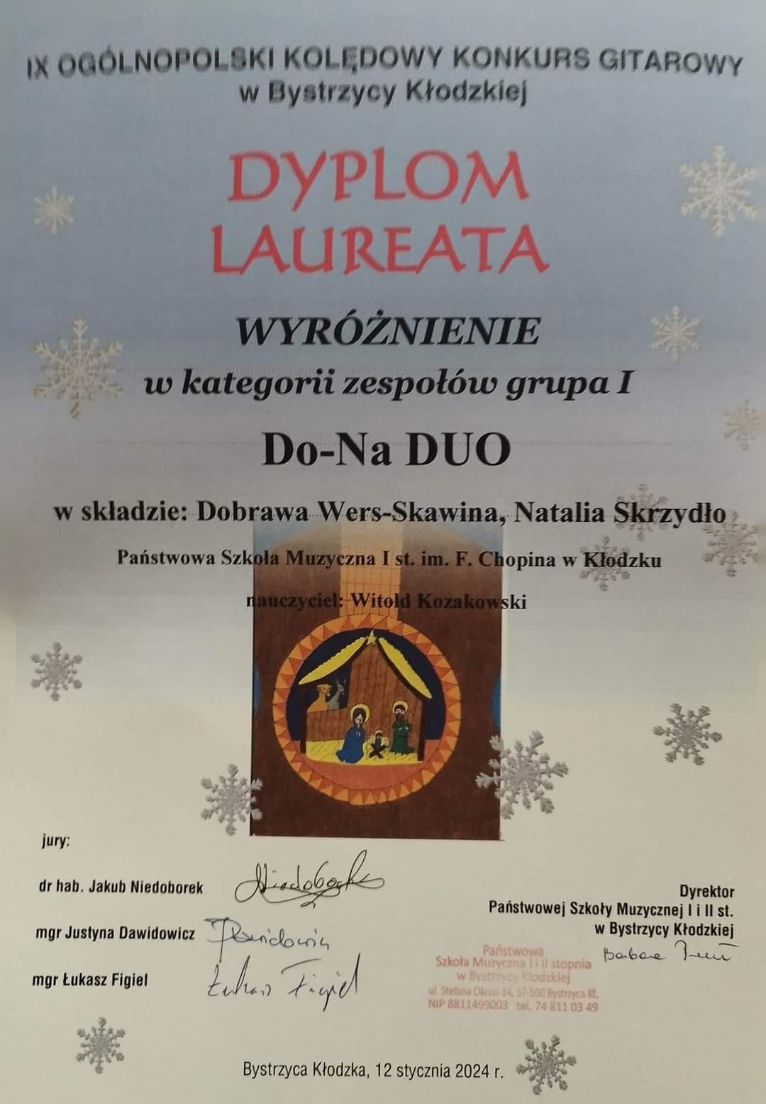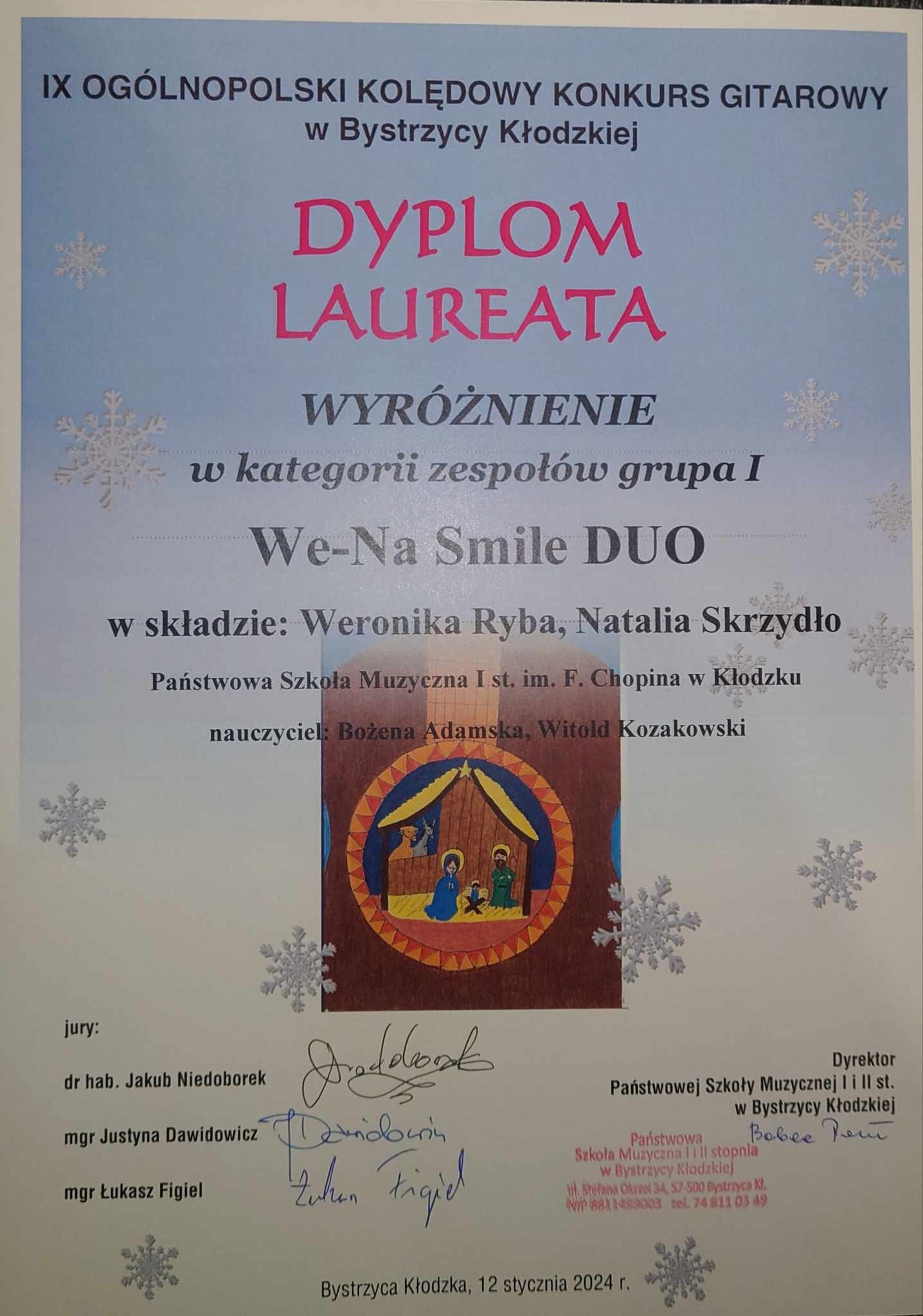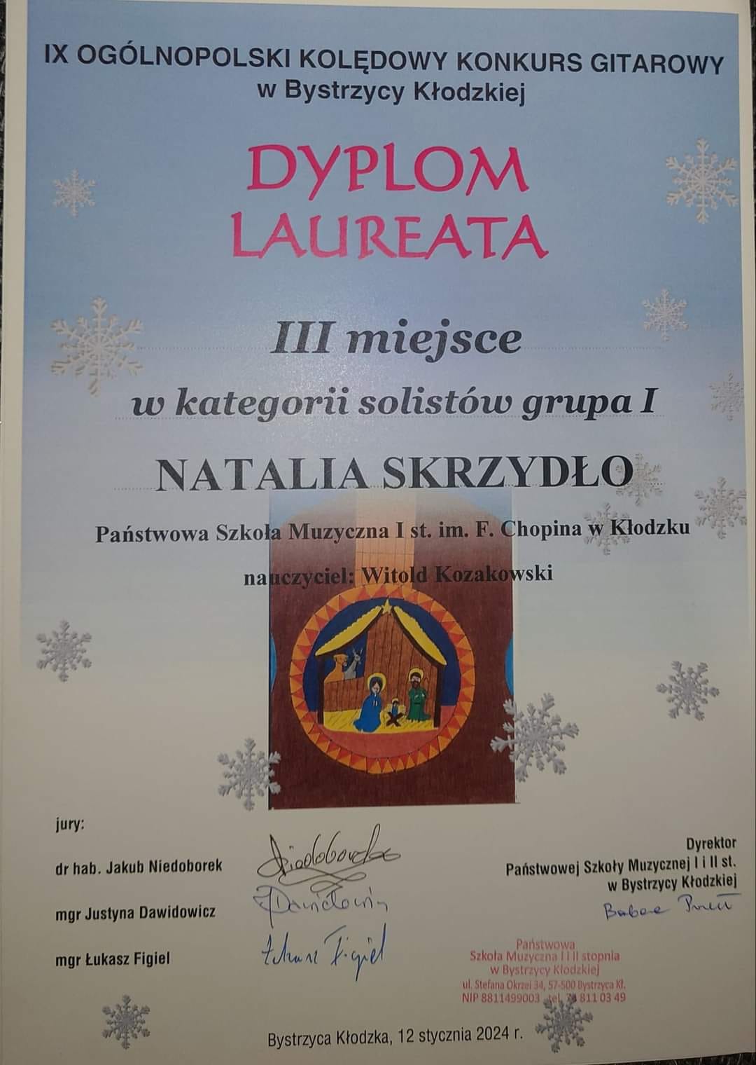 To absolutny rekord wśród szkół biorących udział w bystrzyckich zmaganiach kolędowych! Występy oceniało profesjonalne jury w składzie: dr hab. Jakub Niedoborek (Lublin), mgr Justyna Dawidowicz (Kraków), mgr Łukasz Figiel (Strzelin). Z grupy solistów WYROŻNIENIA zdobyli: Kamila WODNIOK (naucz. A. Kozakowska), Jakub SOBOL (naucz. A. Kozakowska), Emilian KLIMONDA (naucz. W. Kozakowski), zaszczytne III MIEJSCE uzyskała Natalia SKRZYDŁO (naucz. W. Kozakowski). Natomiast w grupie gry zespołowej laureatami WYRÓŻNIENIA zostały: duet fletowo-gitarowy "We-Na Smile Duo" (Weronika Ryba - flet, Natalia Skrzydło - gitara) - naucz. Witold Kozakowski we współpracy z Bożeną Adamską, oraz Duet gitarowy "Do-Na Duo" (Dobrawa Wers-Skawina, Natalia Skrzydło) - naucz. Witold Kozakowski. Zatem nasza uczennica Natalia SKRZYDŁO została potrójną laureatką bystrzyckiego konkursu. To wielki wyczyn! Brawa dla uczniów, pedagogów i rodziców! Gratulacje!