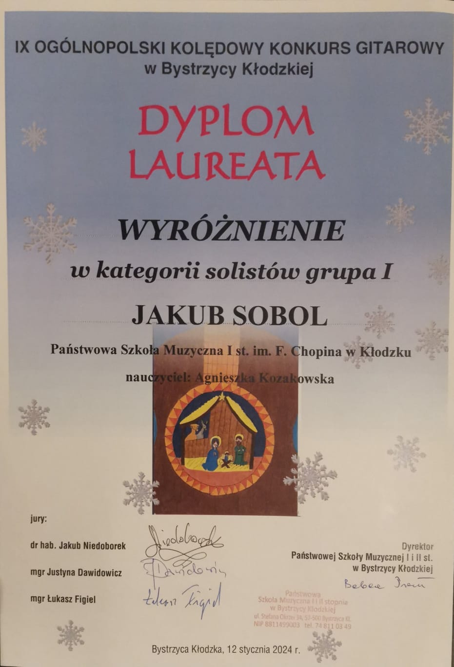 Sukces naszych uczniów z klasy gitary na Ogólnopolskim Kolędowym Konkursie Gitarowym w Bystrzycy Kłodzkiej - 12 stycznia 2024