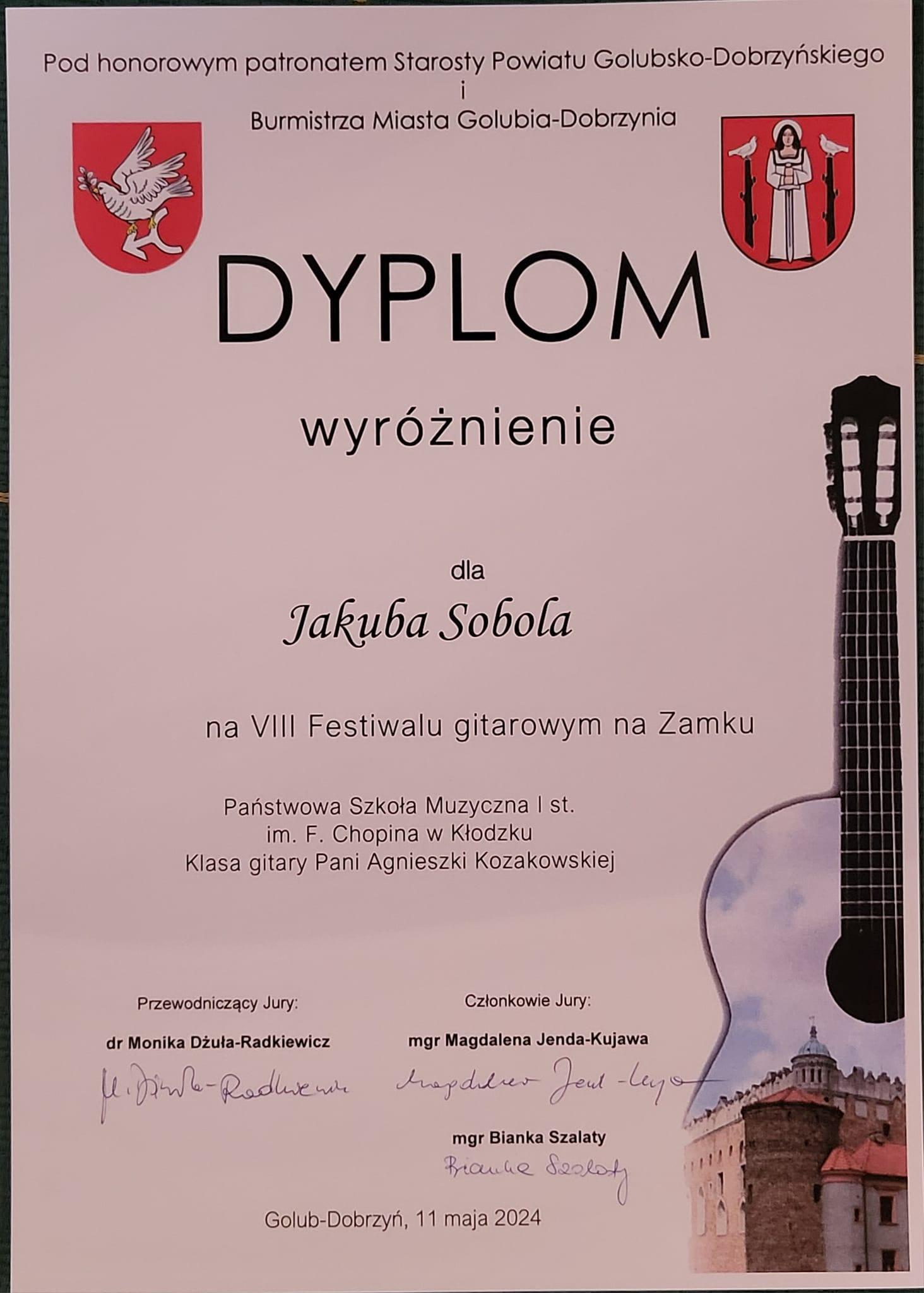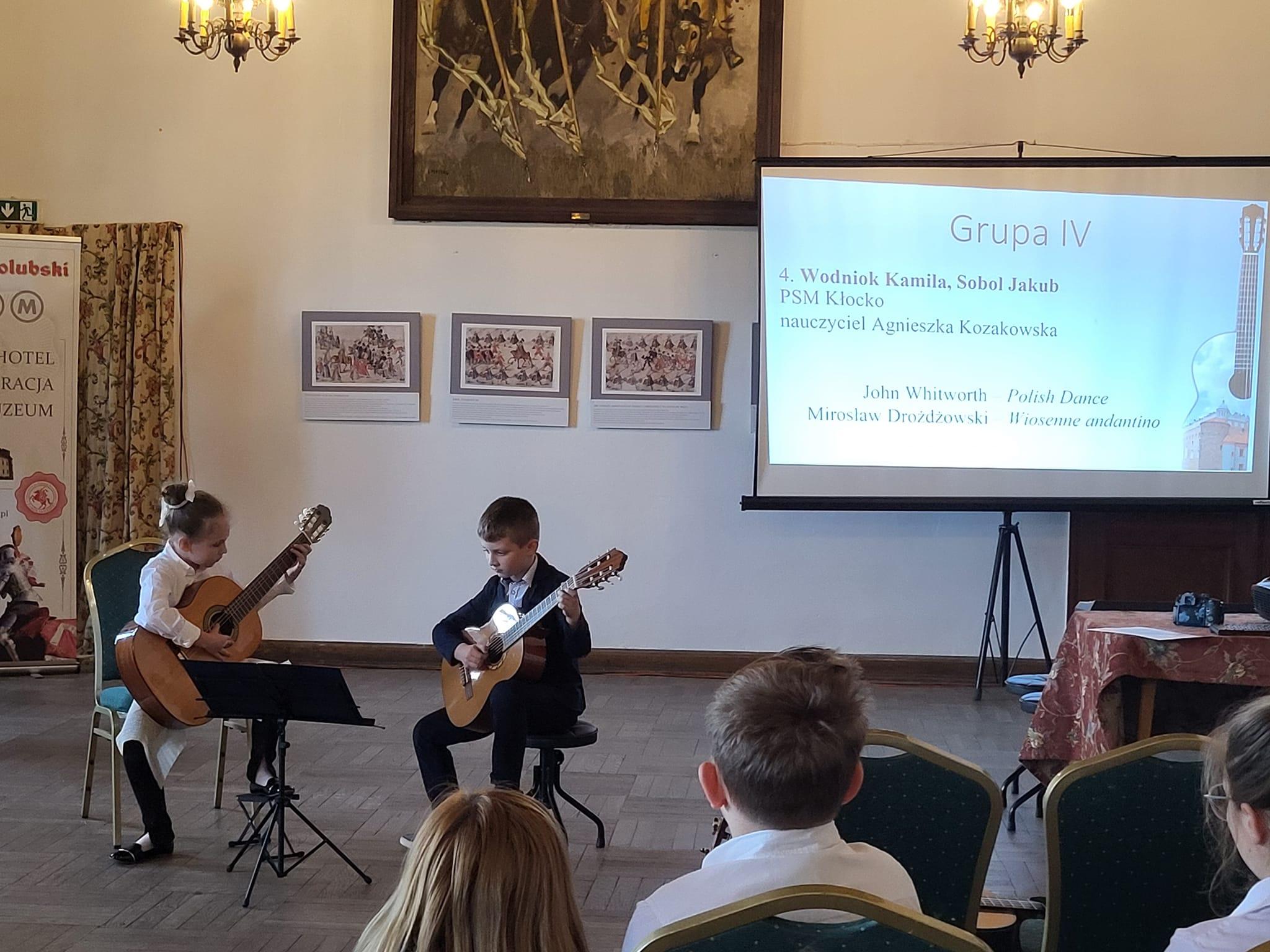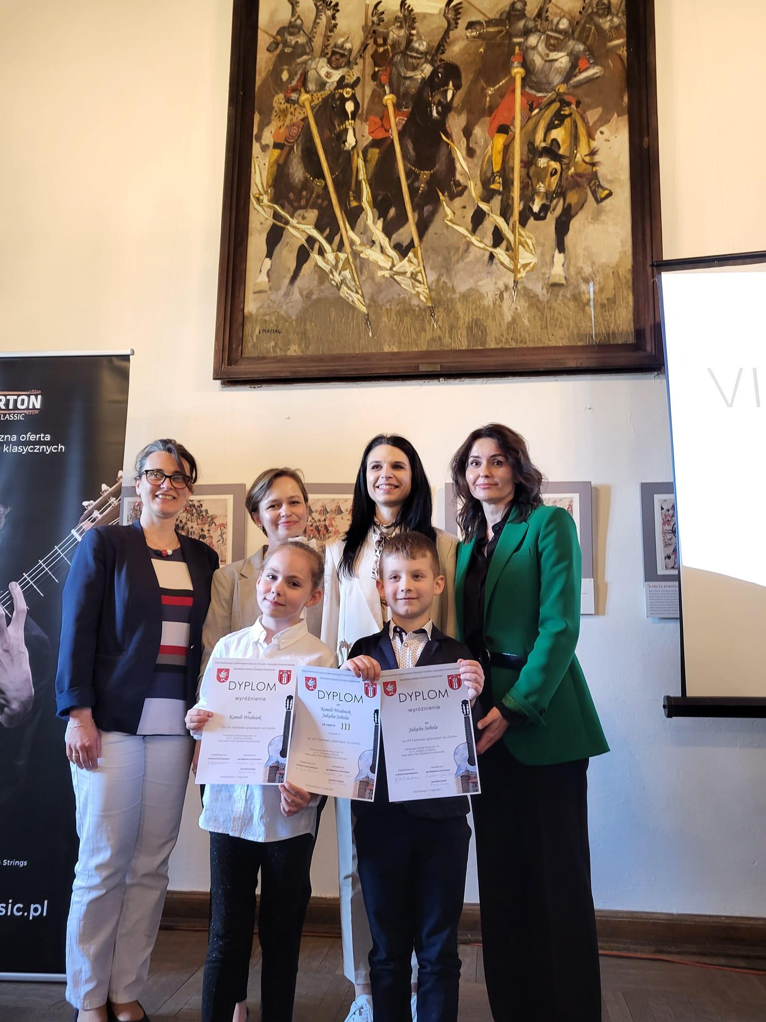 Kolejne sukcesy naszych uczniów! Tym razem dwójka Pierwszaków z klasy gitary Agnieszki Kozakowskiej: Kamila WODNIOK i Jakub SOBOL w sobotę 11 maja br.,zdobyła, w najmłodszej grupie wiekowej, WYRÓŻNIENIE na VIII Festiwalu na Zamku w Golubiu-Dobrzyniu (woj. kujawsko-pomorskie), a w kategorii gry zespołowej - III MIEJSCE!