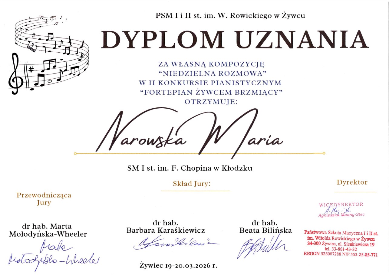 Nasza uczennica, Maria Narowska z klasy fortepianu pani Angeliki Strzygockiej, zdobyła Dyplom Uznania za własną kompozycję "Niedzielna rozmowa" w II Konkursie Pianistycznym "Fortepian Żywcem brzmiący" w Państwowej Szkole Muzycznej I i II stopnia im. W. Rowickiego w Żywcu. Tym samym Marysia potwierdziła swoje umiejętności kompozytorskie z poprzedniej edycji konkursu, w którym również otrzymała nagrodę za własną kompozycję "W krainie fioletowych rzek i jezior". Gratulujemy i życzymy Marysi dalszych sukcesów.