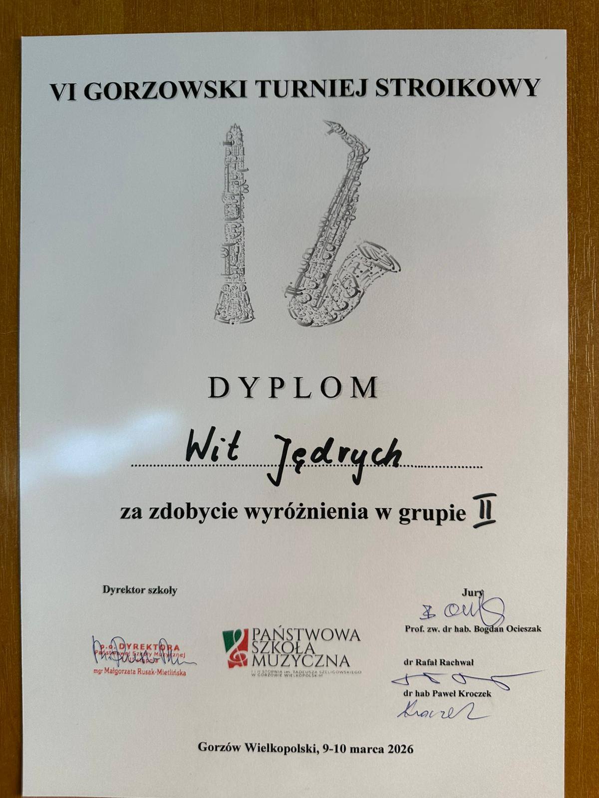 Sukces ucznia na VI Gorzowskim Turnieju Stroikowym dla uczniów szkół muzycznych 9-10 marca 2026 r.