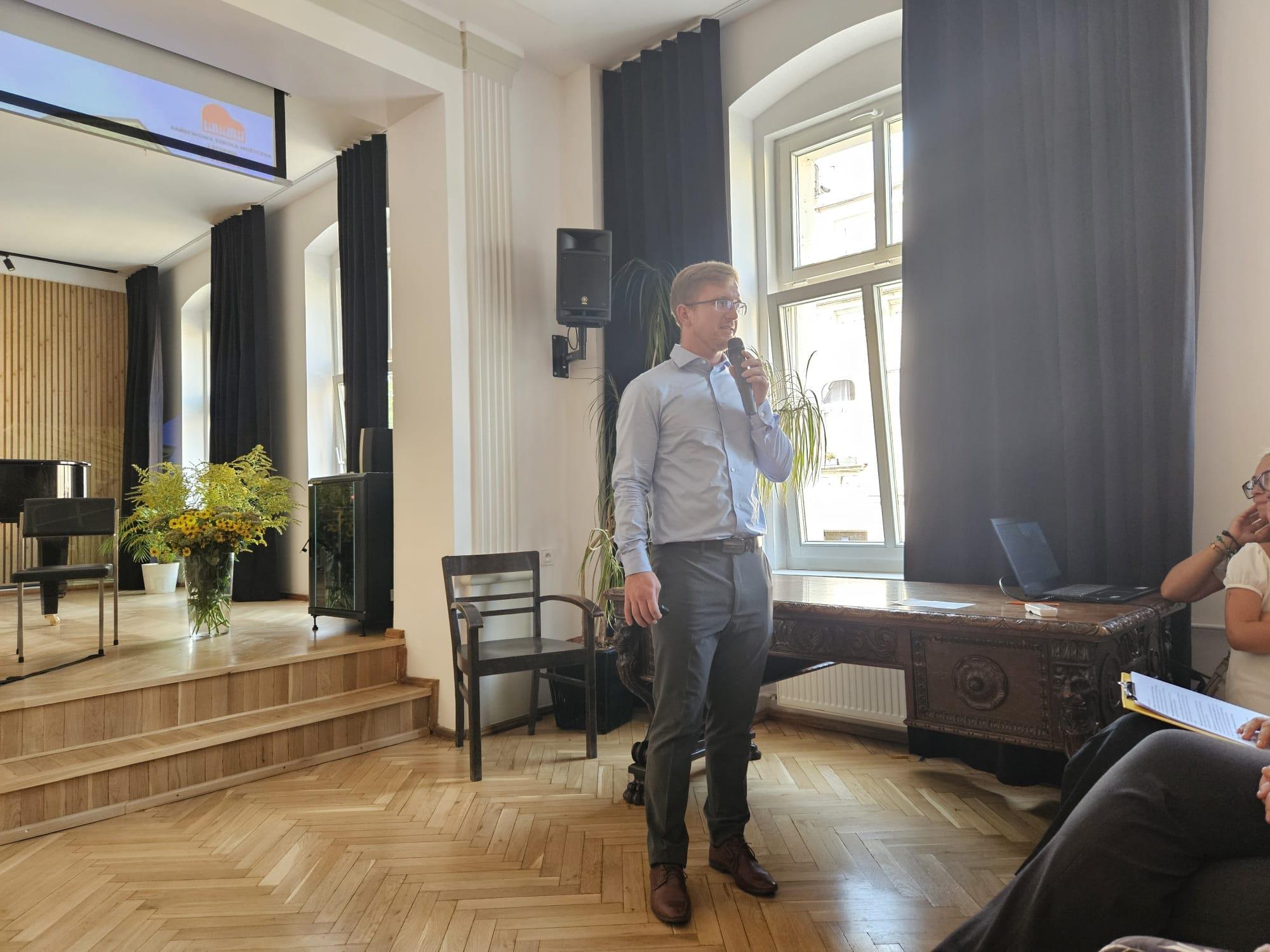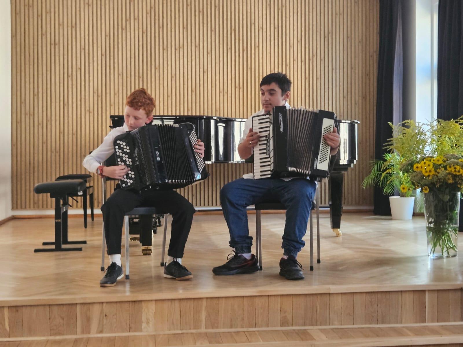 Zaprezentowały się uczennice p. Witolda Kozakowskiego - Natalia Skrzydło oraz Dobrawa Wers-Skawina, następnie wystąpił duet akordeonowy z klasy p. Tomasza Brusińskiego w składzie Wiktor Styrkacz, Gabriel Charęza, a na koniec części artystycznej publiczność miała przyjemność usłyszeć wzruszający motyw z filmu Listy Schindlera, który z wielkim zaangażowaniem wykonała p. Patrycja Machała- nauczyciel klasy wiolonczeli wraz ze swoim uczniem Janem Jasińskim. Wszystkim uczniom w nadchodzącym roku życzymy wielu sukcesów, niech każdy dzień przynosi Wam radość z nauki i poczucie, że zbliżacie się do realizacji swoich marzeń, a rodzicom zaś, abyście z dumą obserwowali postępy swoich pociech i cieszyli się z każdego najmniejszego kroku w przód.