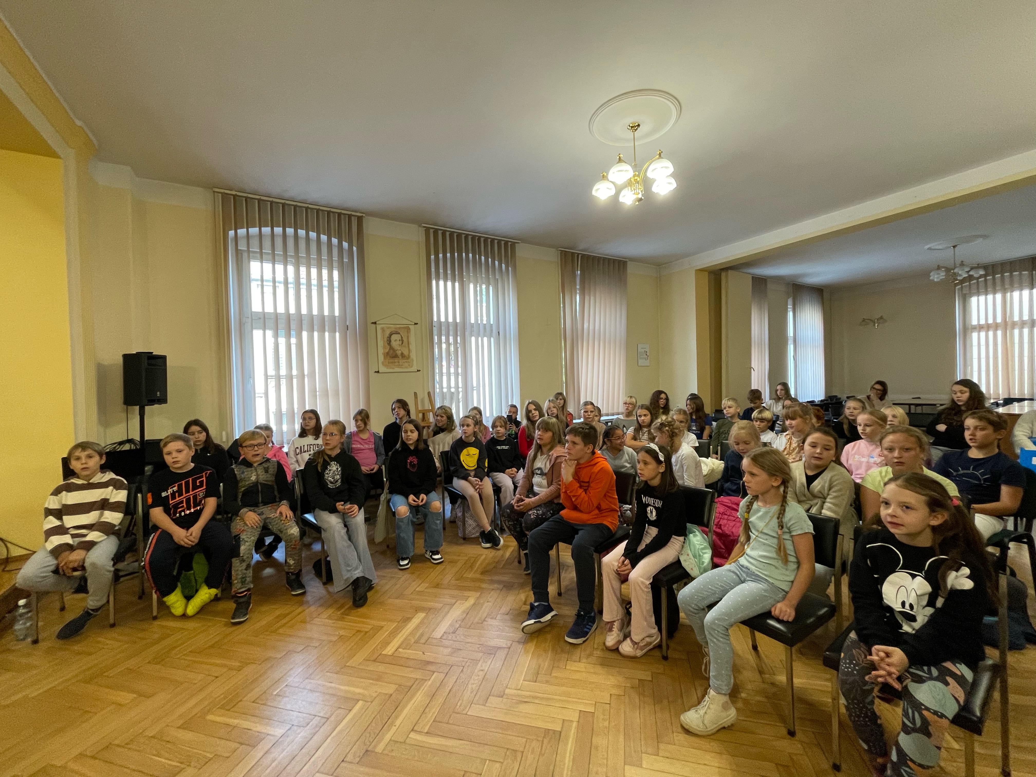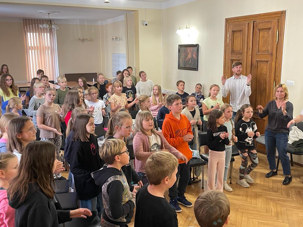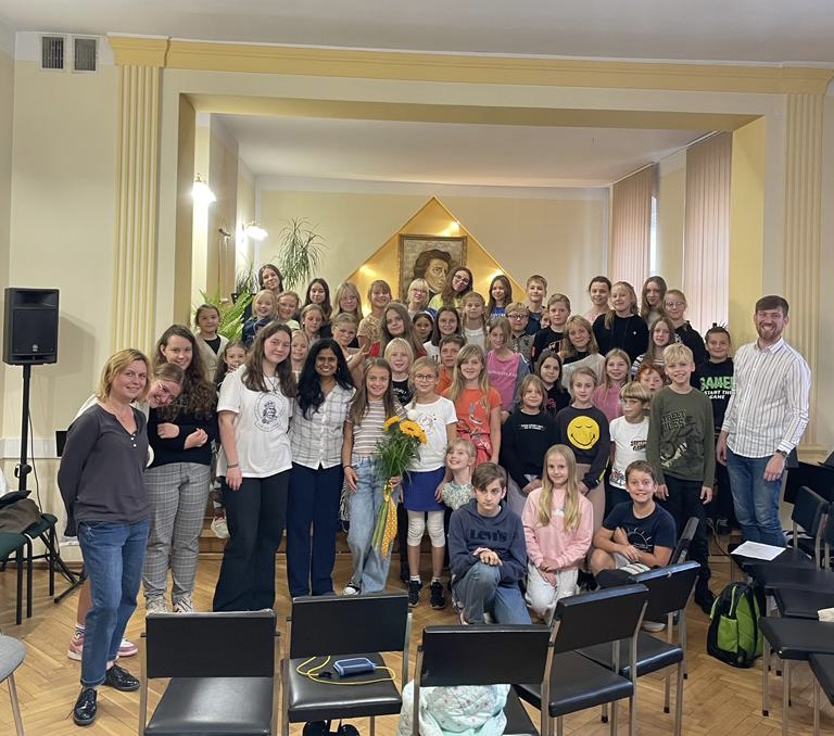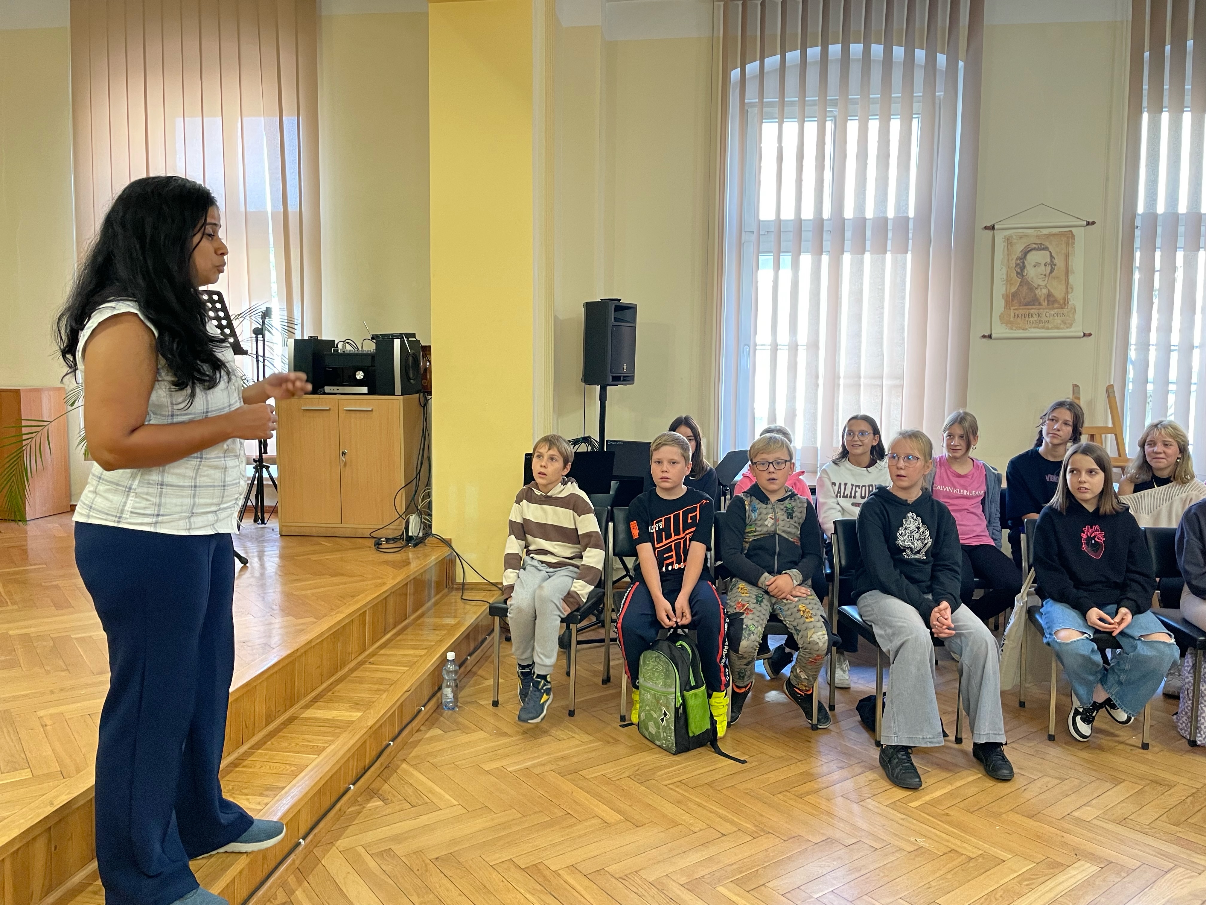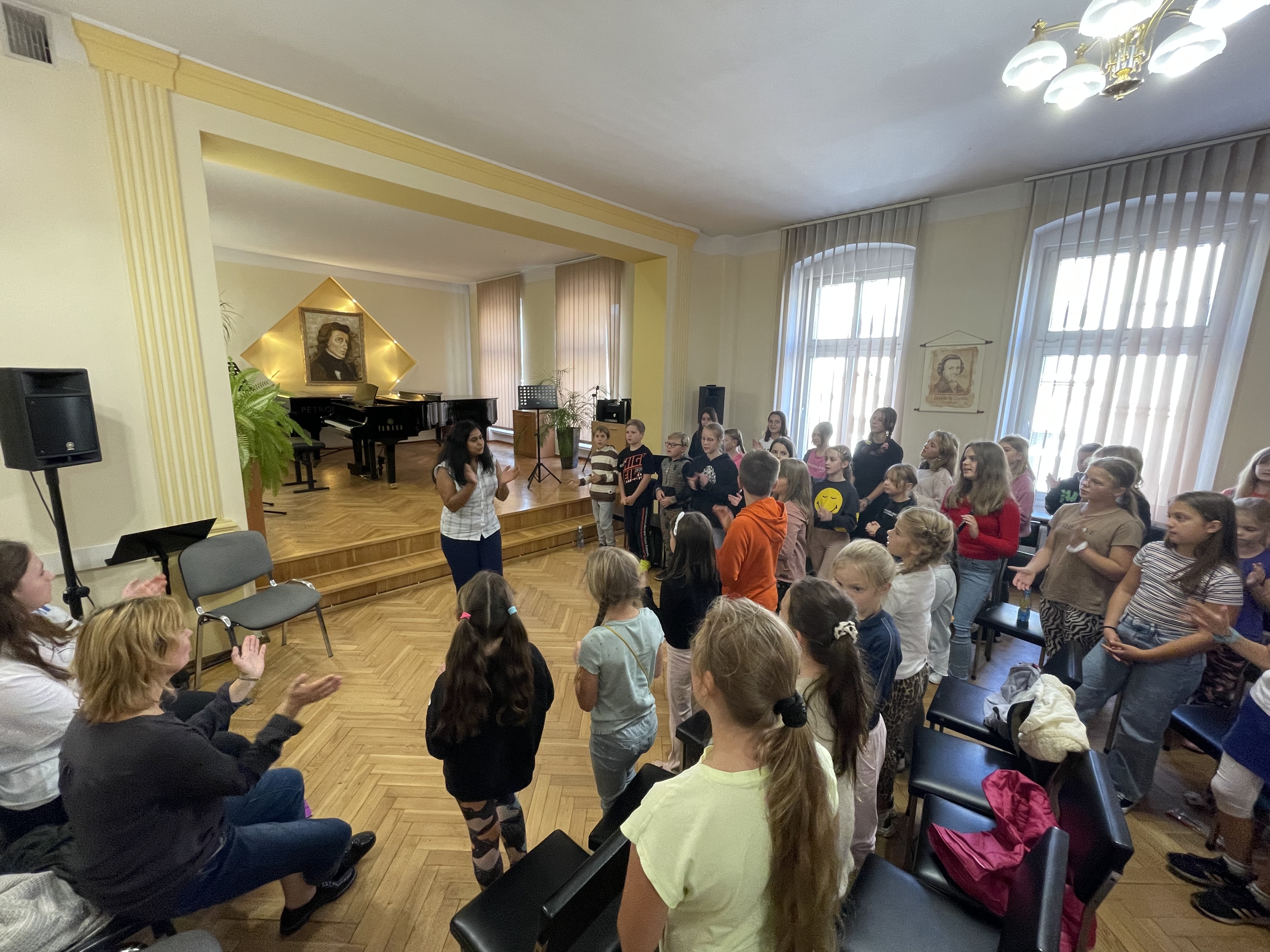 Wspólnie z Chórem Państwowej Szkoły Muzycznej I stopnia w Bystrzycy Kłodzkiej uczniowie poznali tradycyjną pieśń Indyjską, a na koniec nauczyli Anjanę kanonu „Panie Janie” Dziękujemy wspaniałej Anjanie, a chórom gratulujemy energii i pięknego śpiewu