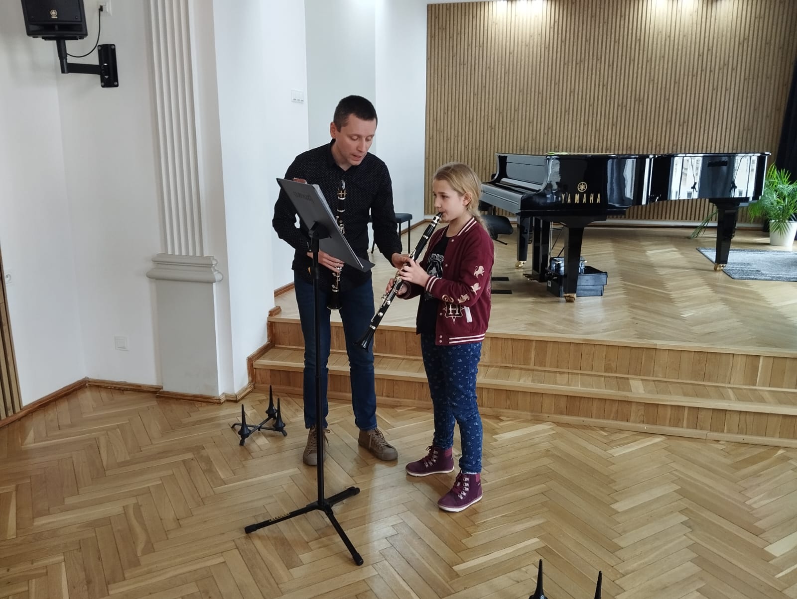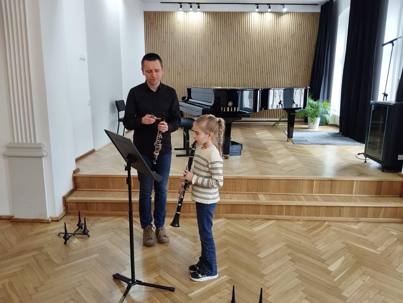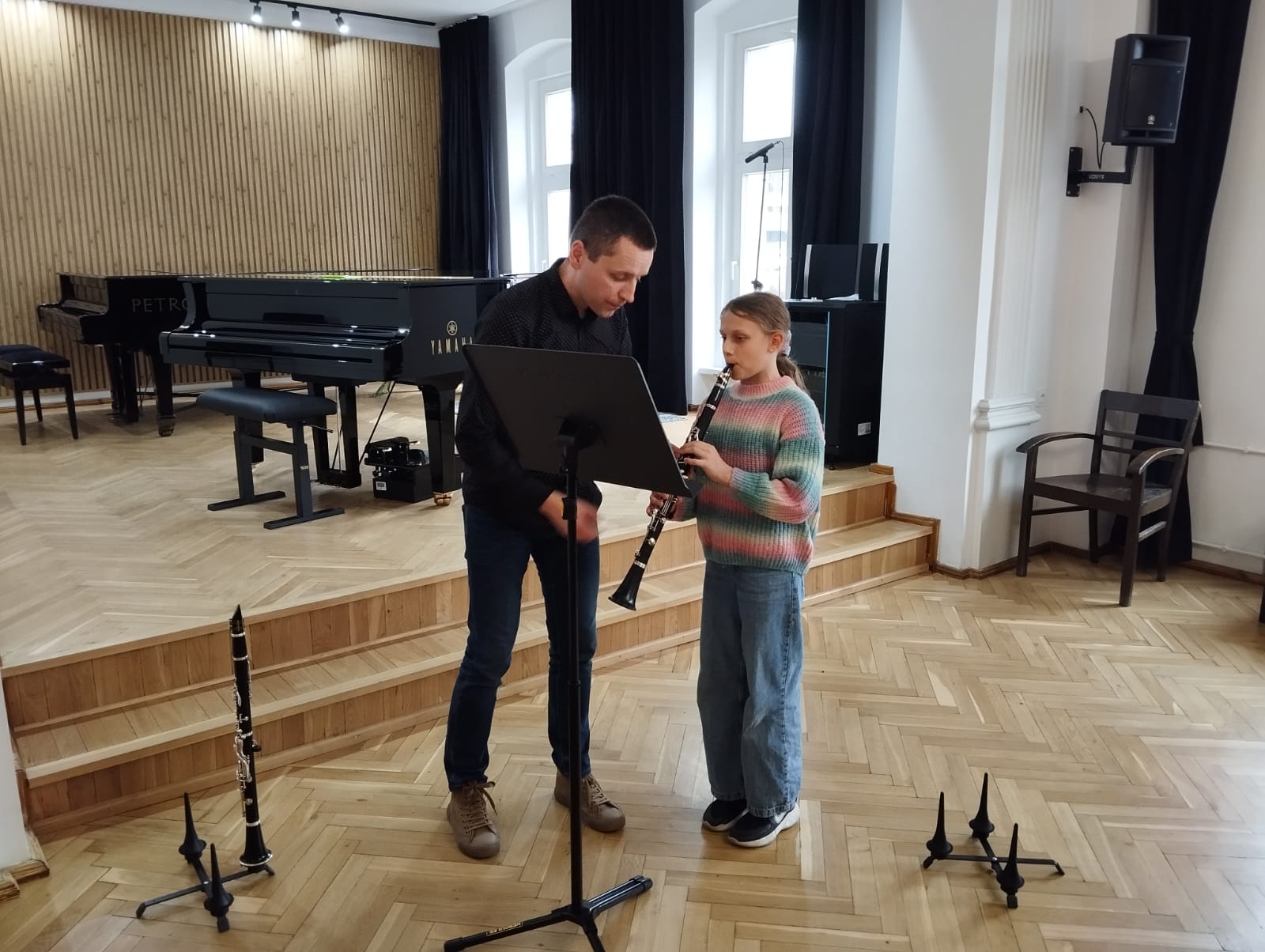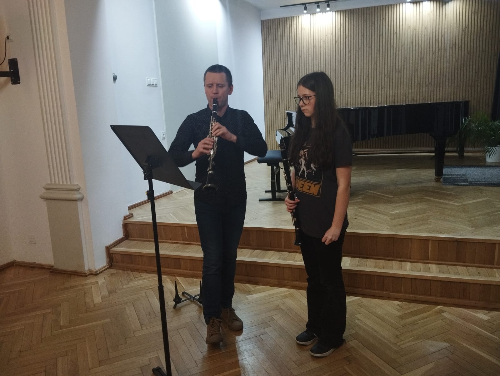 Uczniowie z klasy klarnetu p. Przemysława Polaka mieli okazję pracować nad bieżącym materiałem, otrzymując wiele cennych wskazówek. Warto dodać, że podczas warsztatów gościliśmy również uczniów klasy klarnetu p. Mateusza Maszyńskiego z Państwowej Szkoły Muzycznej I stopnia im. J. Szajny-Lewandowskiej w Oławie. Dzięki współpracy dwóch klas klarnetu uczniowie wzajemnie się integrowali, wspólnie muzykując.