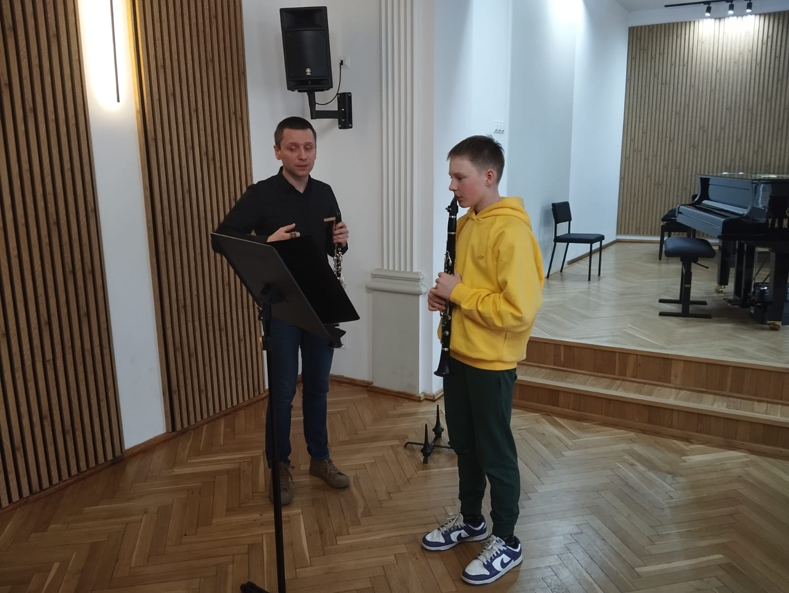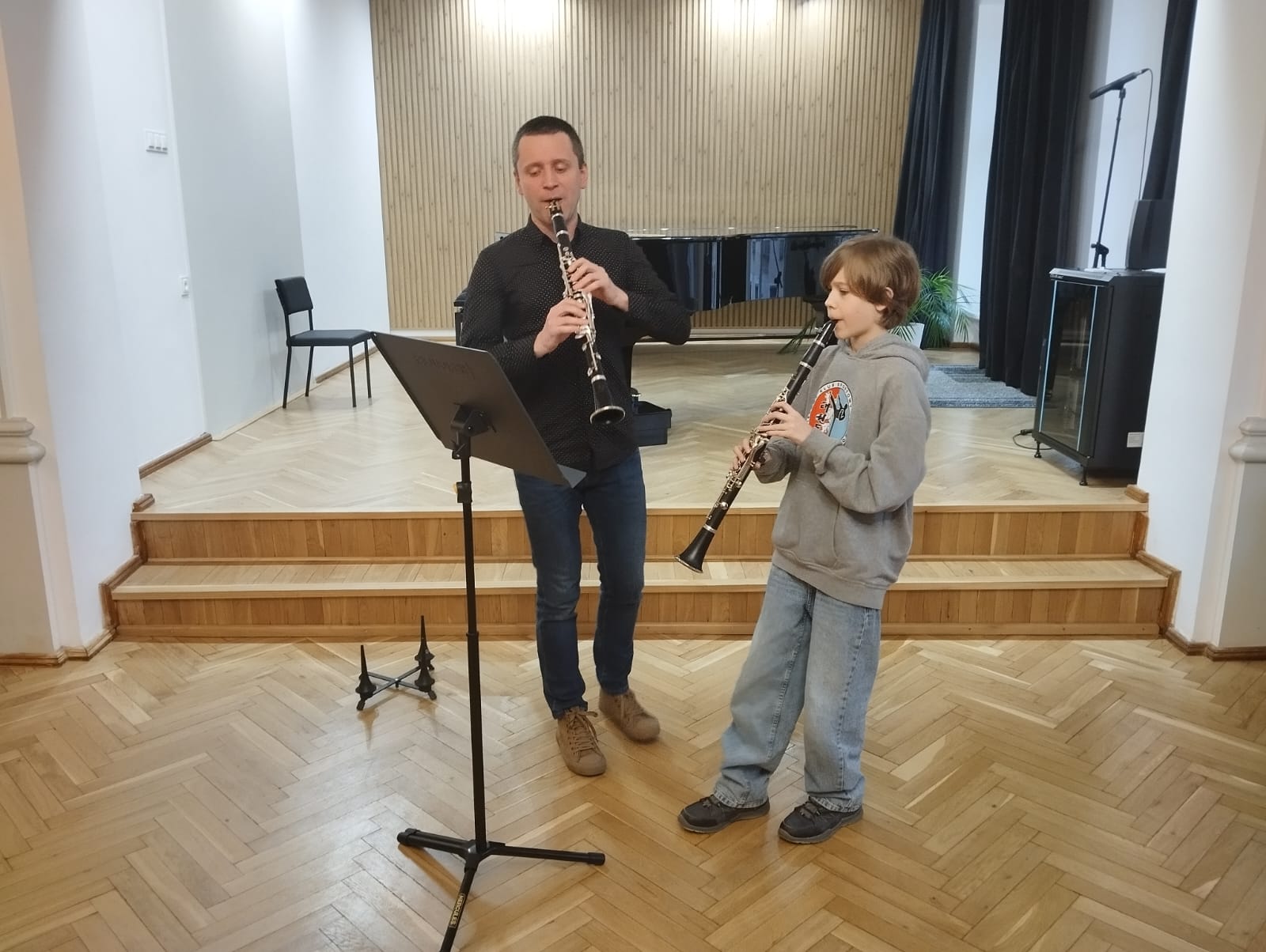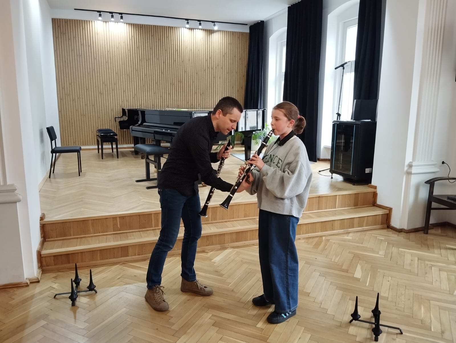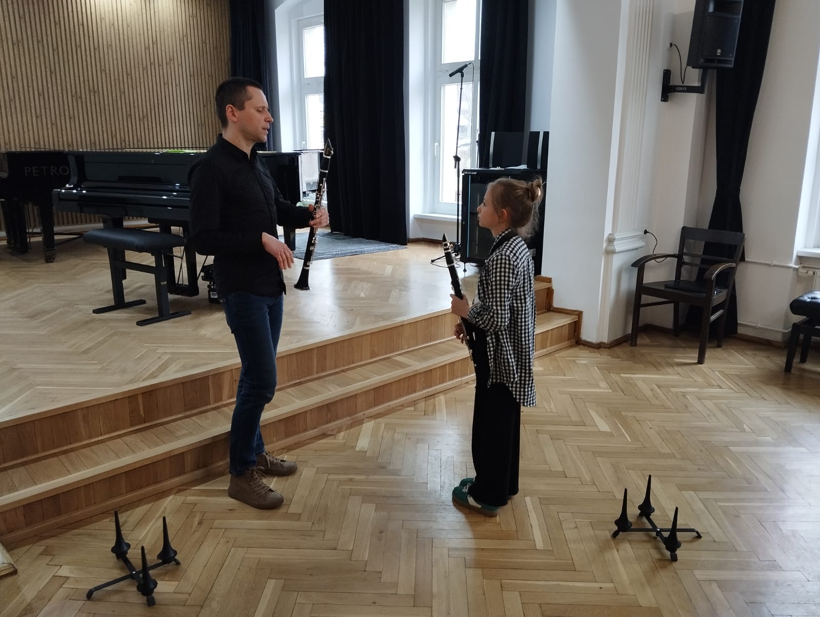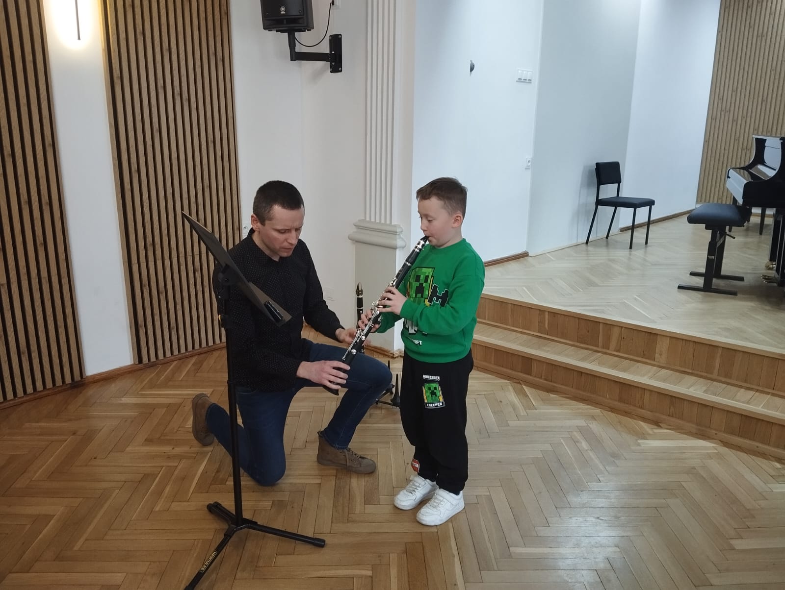 Uczniowie z klasy klarnetu p. Przemysława Polaka mieli okazję pracować nad bieżącym materiałem, otrzymując wiele cennych wskazówek. Warto dodać, że podczas warsztatów gościliśmy również uczniów klasy klarnetu p. Mateusza Maszyńskiego z Państwowej Szkoły Muzycznej I stopnia im. J. Szajny-Lewandowskiej w Oławie. Dzięki współpracy dwóch klas klarnetu uczniowie wzajemnie się integrowali, wspólnie muzykując.
