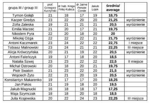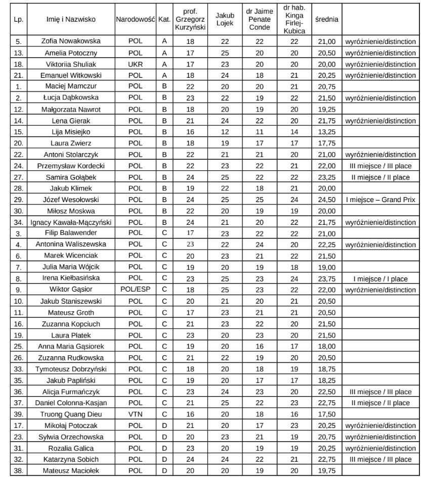 Szczegółowa punktacja z wynikami w poszczególnych grupach umieszczona jest w protokole w zakładce materiały do pobrania.