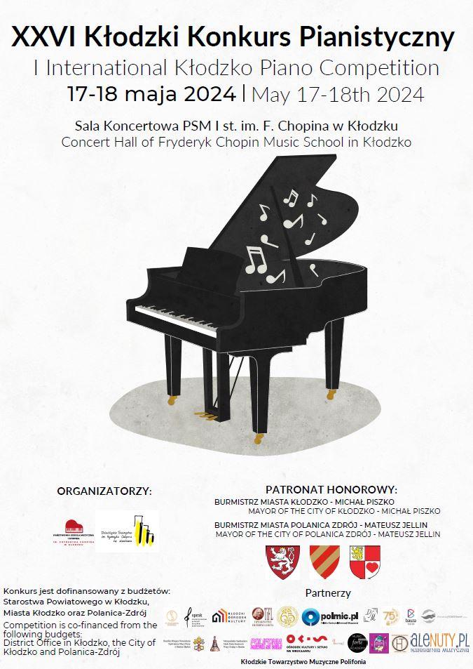 W dniach 17-18 maja 2024 r. odbył się XXVI Kłodzki Konkurs Pianistyczny – I International Kłodzko Piano Competition. Po sukcesie zeszłorocznej edycji, konkurs rozszerzył swój zasięg na skalę międzynarodową. Konkurs odbył się na dwóch płaszczyznach – stacjonarnej na Sali Koncertowej Państwowej Szkoły Muzycznej I stopnia im. Fryderyka Chopina w Kłodzku oraz online. W XXVI KKP udział wzięło łącznie 89 pianistów z 6 krajów.