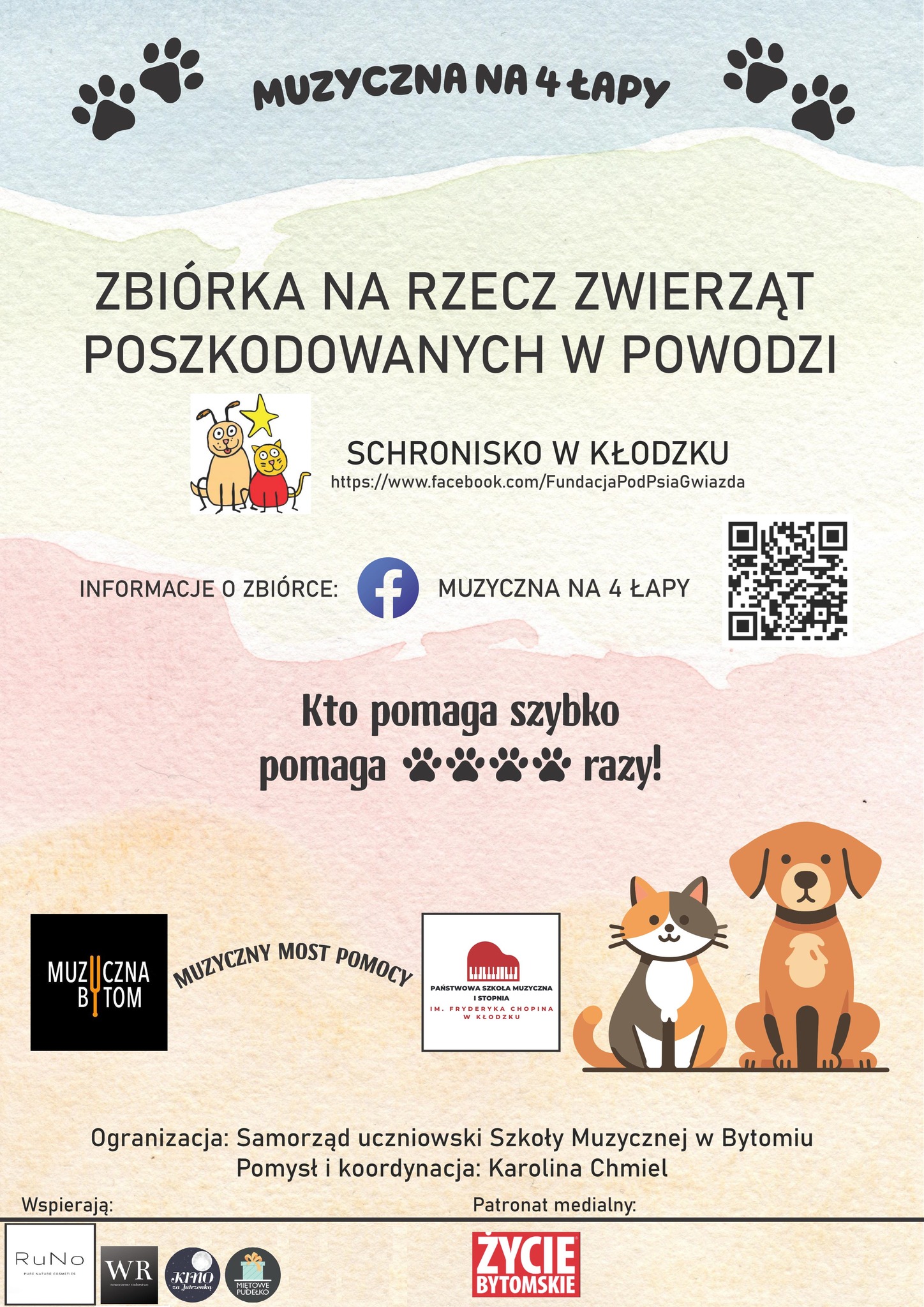 Samorząd uczniowski Ogólnokształcącej Szkoły Muzycznej im. F. Chopina w Bytomiu w związku z wiadomościami z terenów dotkniętych powodzią zorganizował zbiórkę rzeczy najbardziej potrzebnych dla zwierząt w schronisku – Fundacja Pod Psią Gwiazdą w Kłodzku. Poniżej zamieszczamy link z informacjami o zbiórce. https://www.facebook.com/profile.php?id=61565731598312