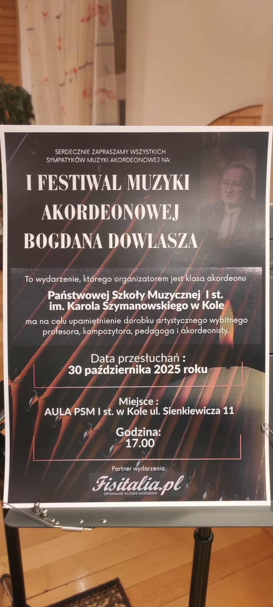 30 października 2025 odbył się w naszej szkole I Festiwal Muzyki Akordeonowej im. Bogdana Dowlasza, poświęcony pamięci wybitnego pedagoga, kompozytora i akordeonisty - Bogdana Dowlasza. Podczas festiwalu zabrzmiały znane kompozycje Mistrza w wykonaniu młodych akordeonistów z PSM I stopnia w Kole i PSM I i II stopnia w Koninie przygotowanych przez Waldemara Jednoroga i Przemysława Stadnika.
