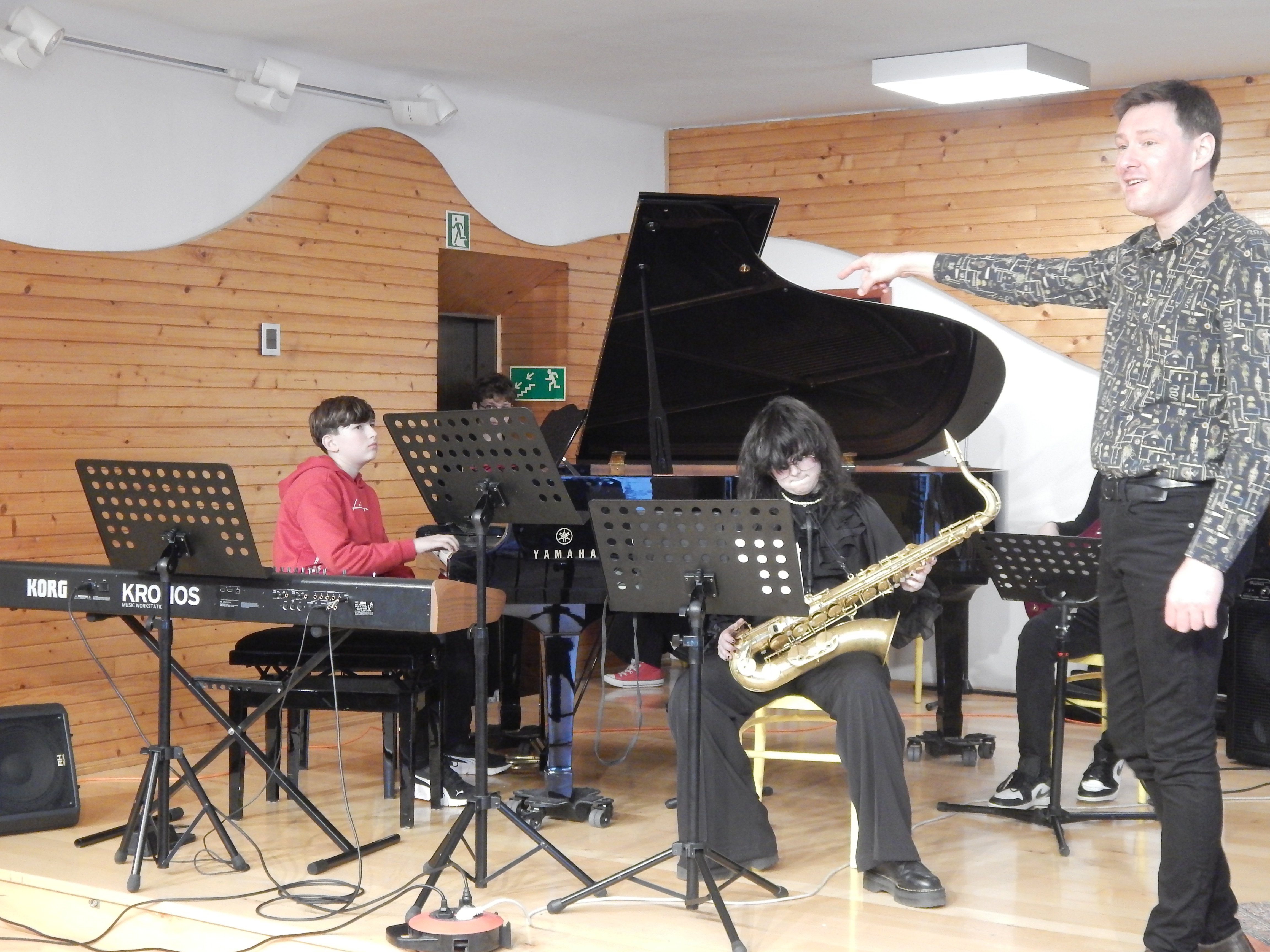 10 kwietnia 2025 r. gościliśmy w naszej szkole grupę uczniów z Państwowej Szkoły Muzycznej I i II stopnia w Koninie z koncertem jazzowym. Wystąpili oni pod kierunkiem nauczyciela konińskiej szkoły p. Szymona Wieczorkiewicza, który koncert prowadził i zaprezentował wydział jazzowy PSM Konin. Po koncercie odbyły się warsztaty na temat improwizacji jazzowej poprowadzone również przez p. Szymona Wieczorkiewicza.