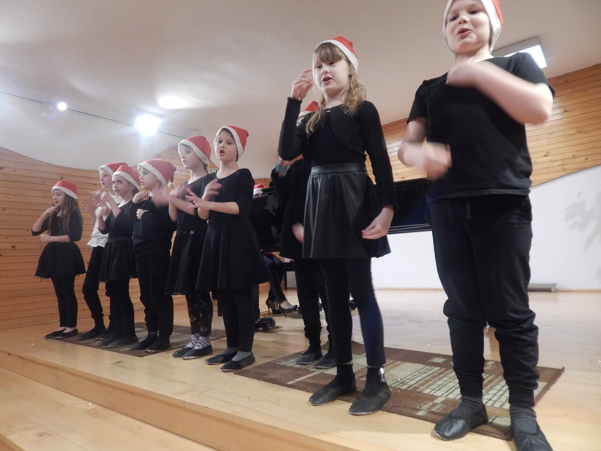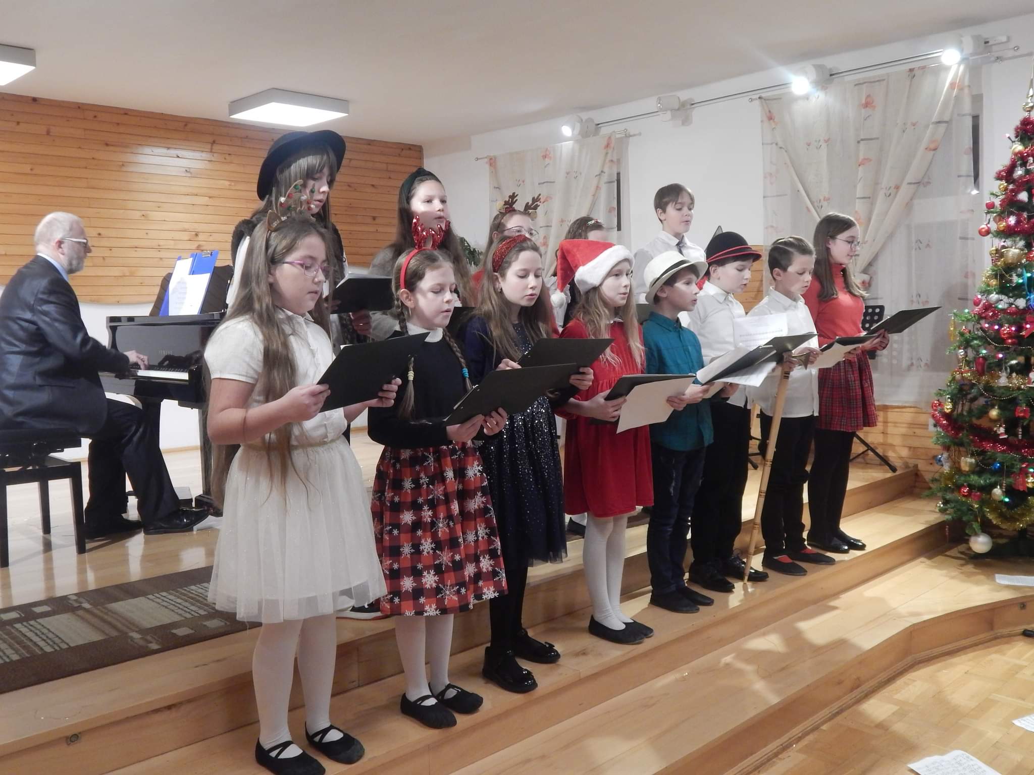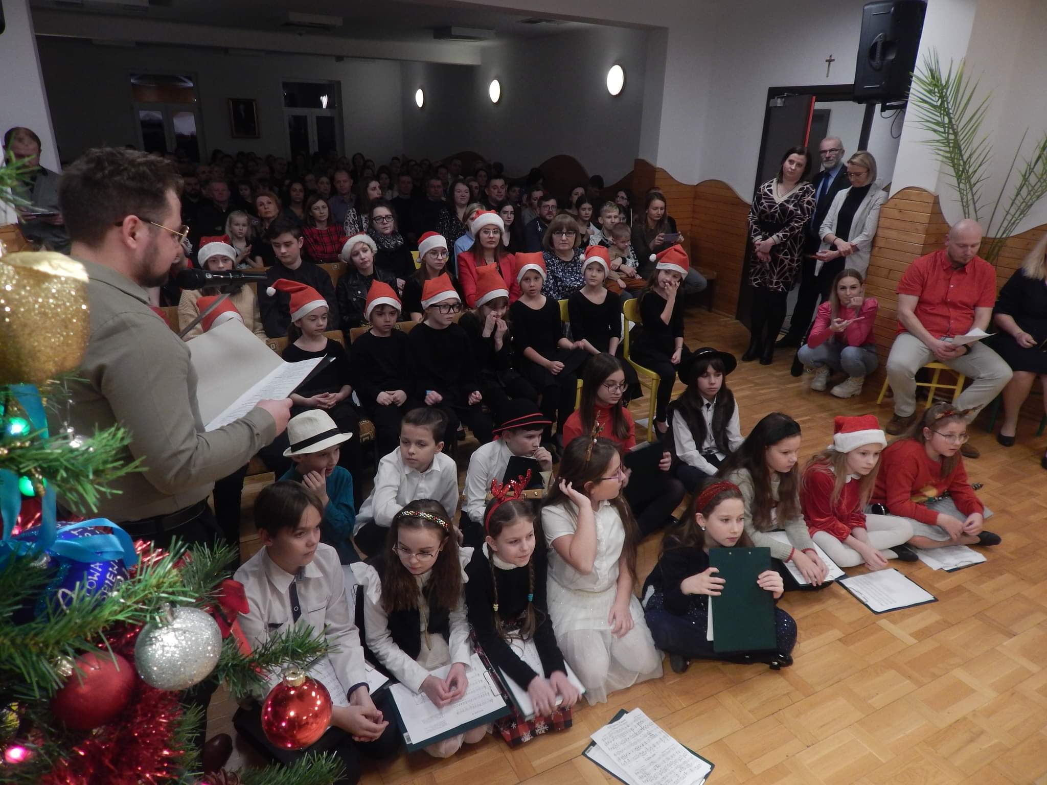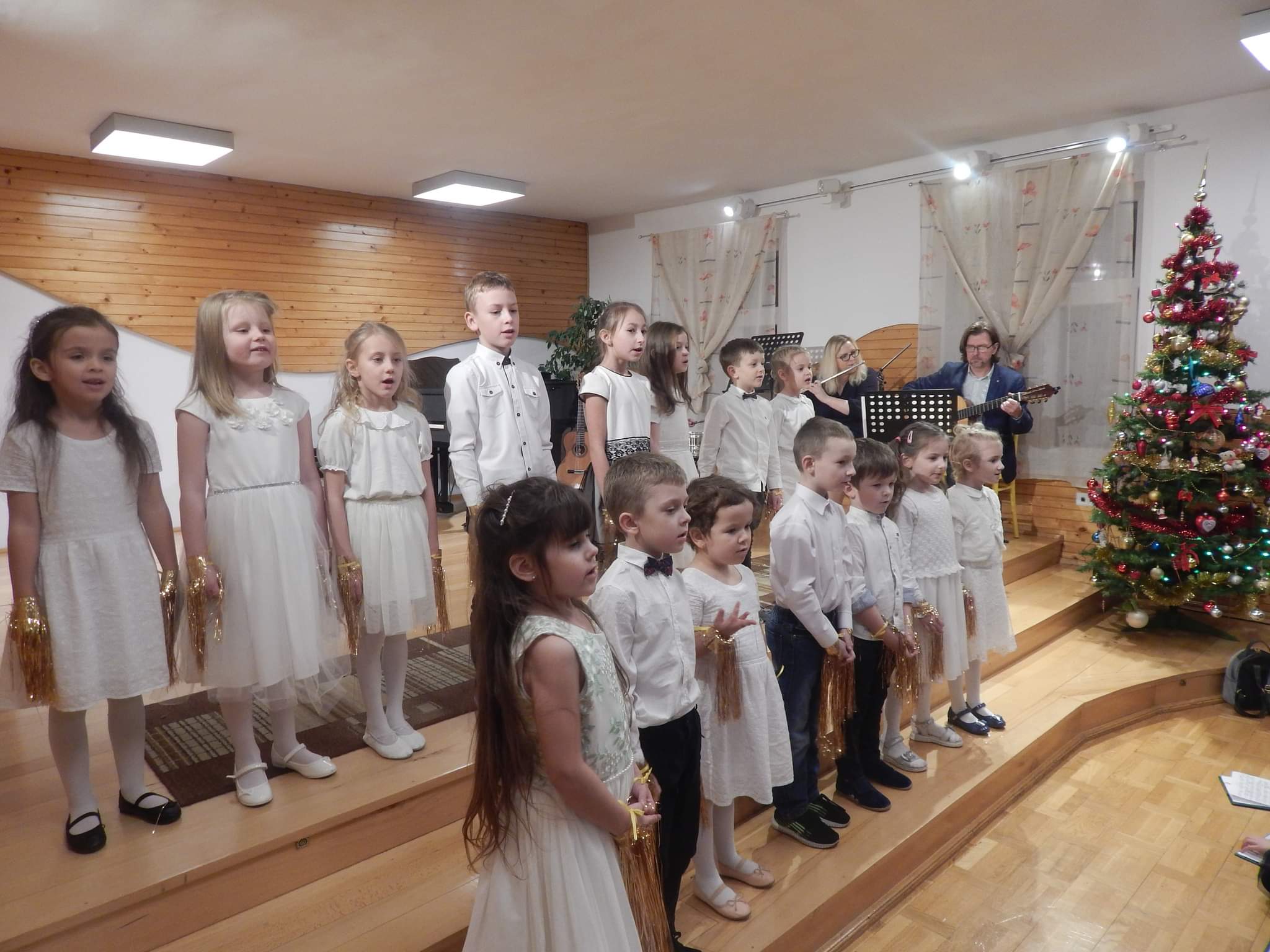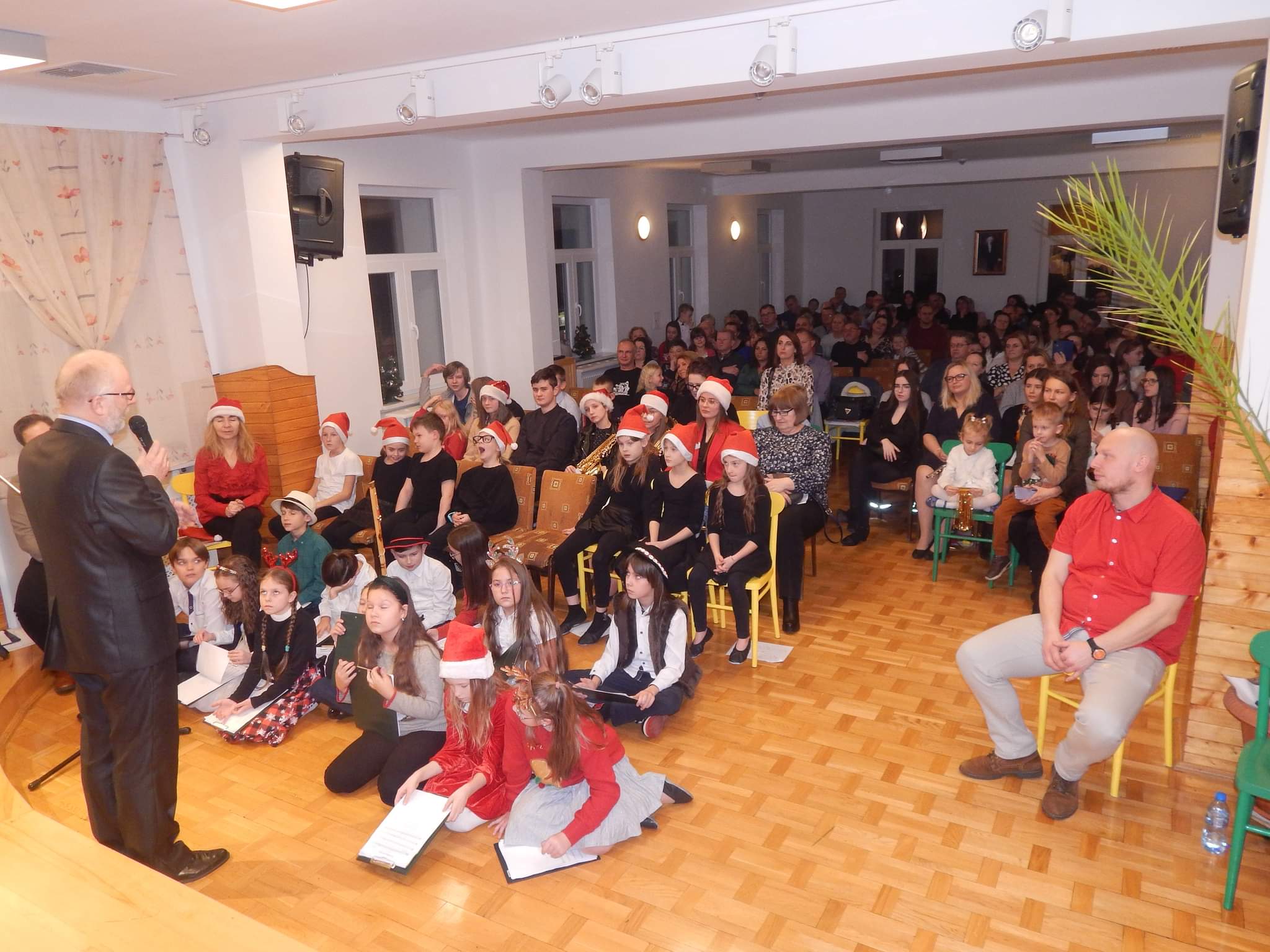 poniżej galeria zdjęć z koncertu przedstawiająca wykonawców, nauczycieli i zebrananą publiczność.