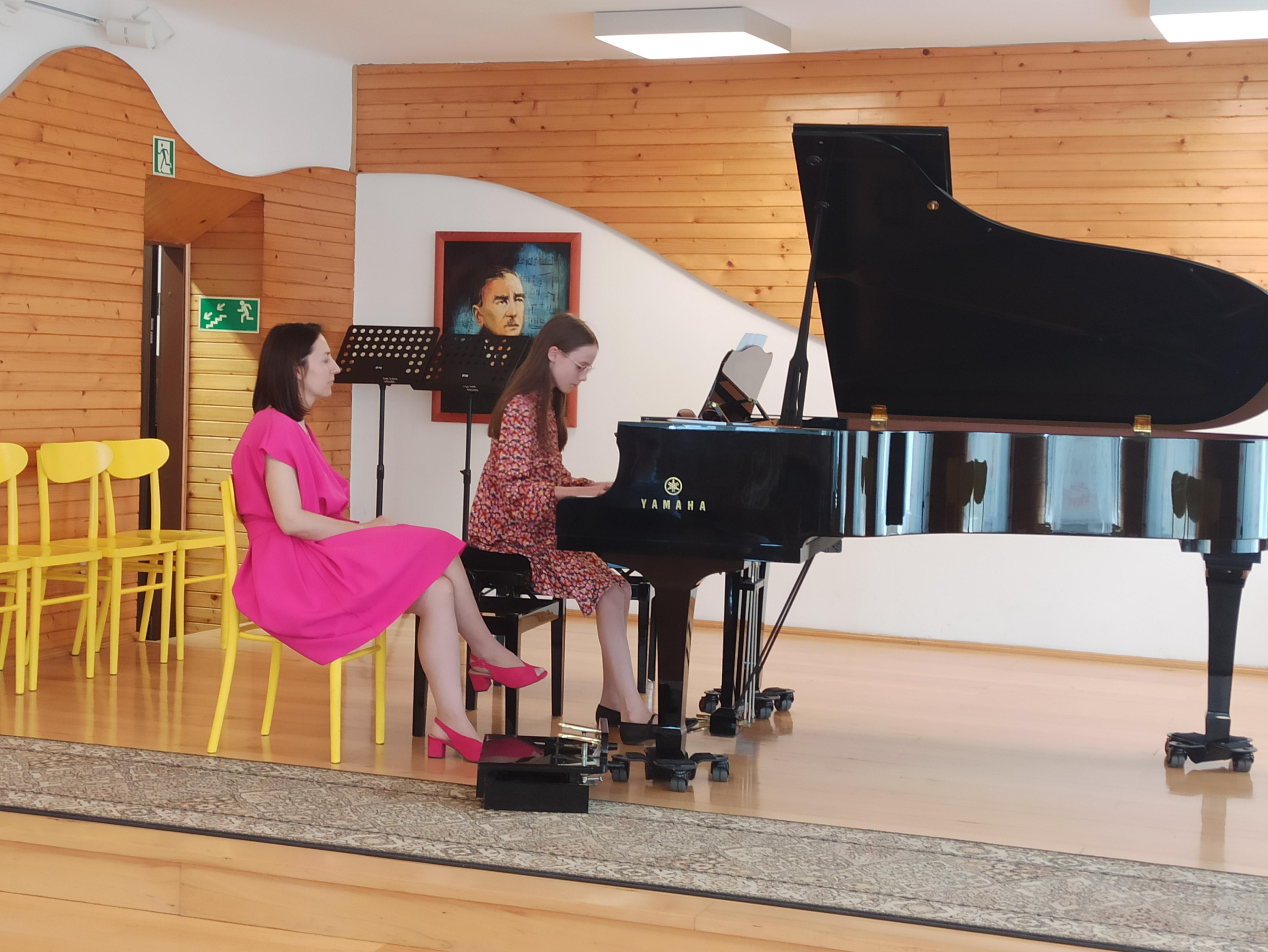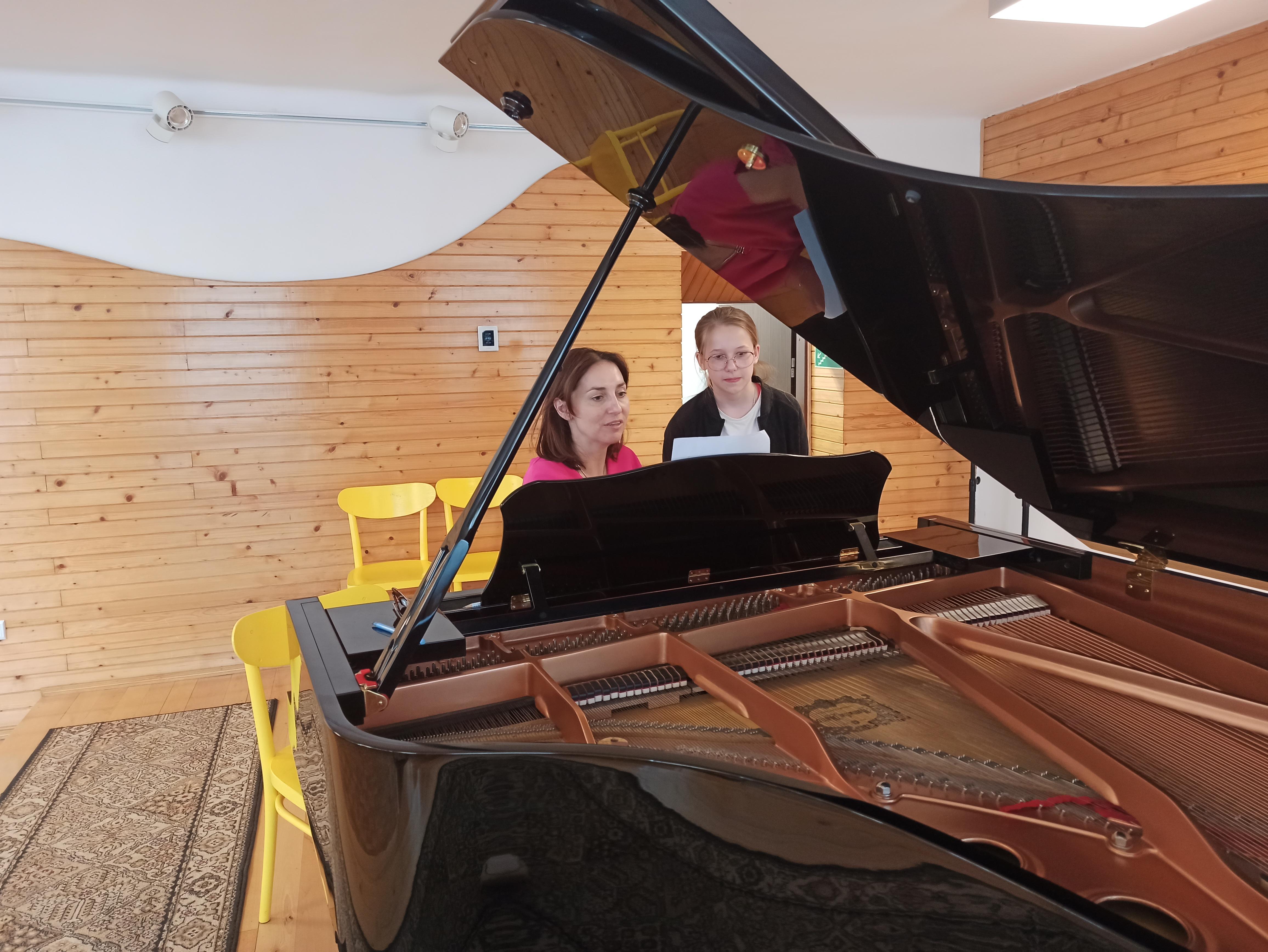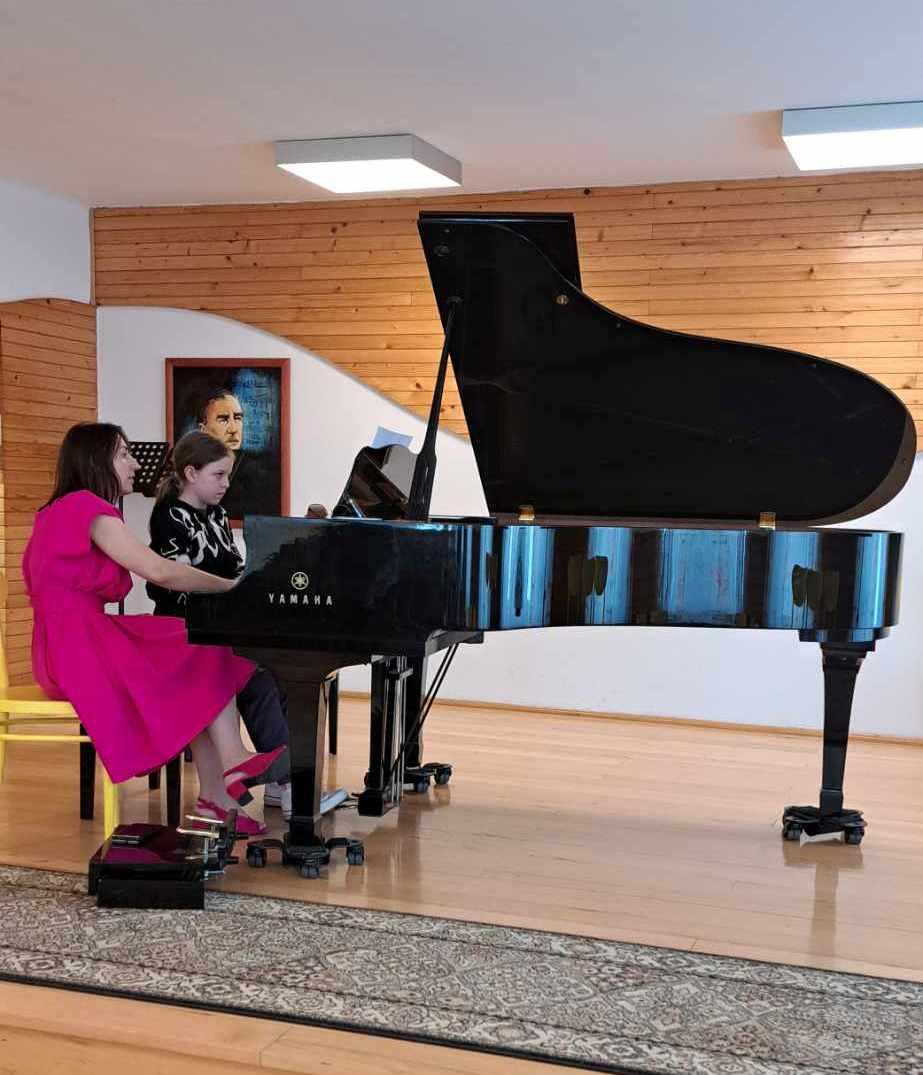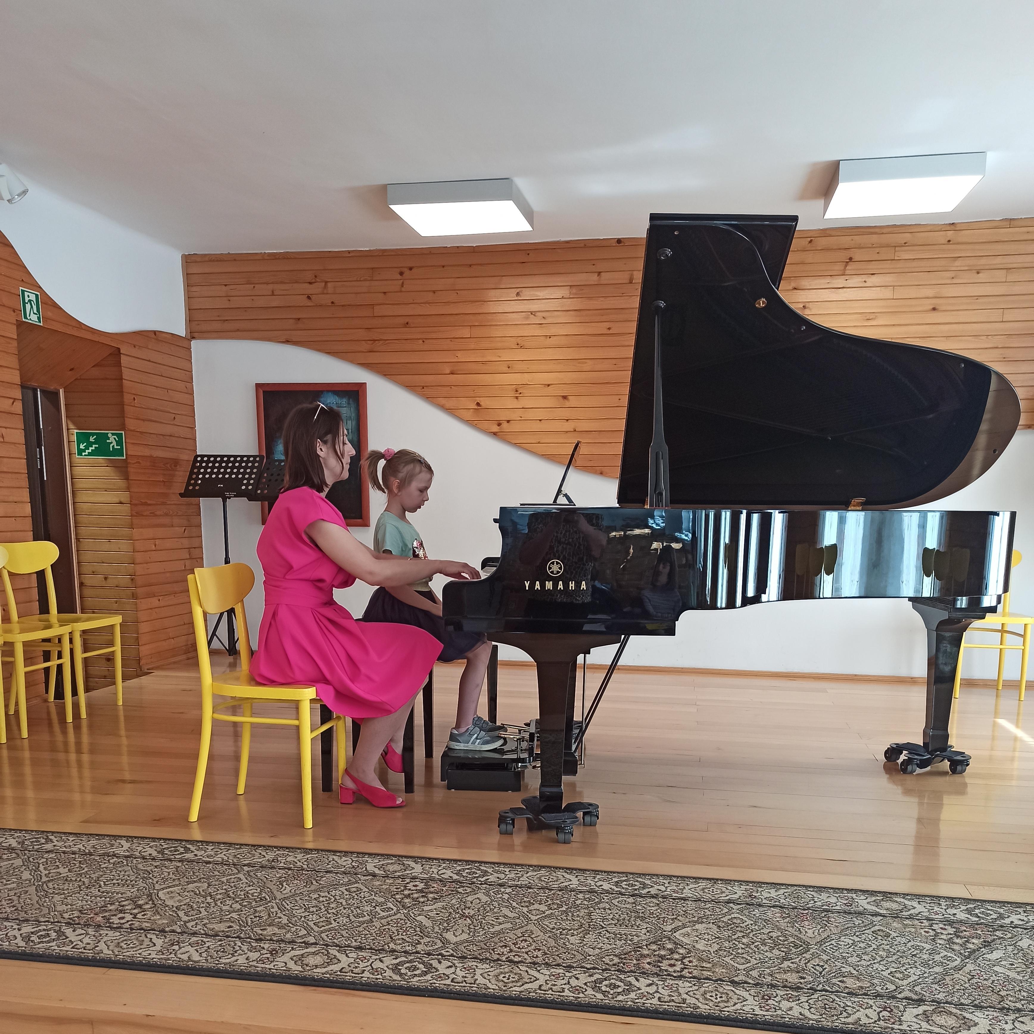poniżej znajduje się galeria zdjęć przedstawiająca uczniów i nauczycieli podczas wykładu oraz uczniów podczas ćwiczeń przy fortepianie