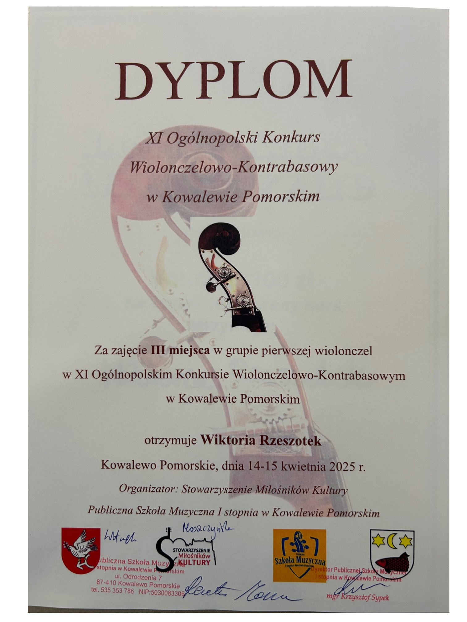 Uczennica klasy wiolonczeli p. Kingi Babij (kl. I cyklu 6-letniego) - Wiktoria Rzeszotek, zajęła III miejsce w XI Ogólnopolskim Konkursie Wiolonczelowo-Kontrabasowym w Kowalewie Pomorskim. Wiktoria zaprezentowała się z towarzyszeniem fortepianowym p. Anny Leszczyńskiej.