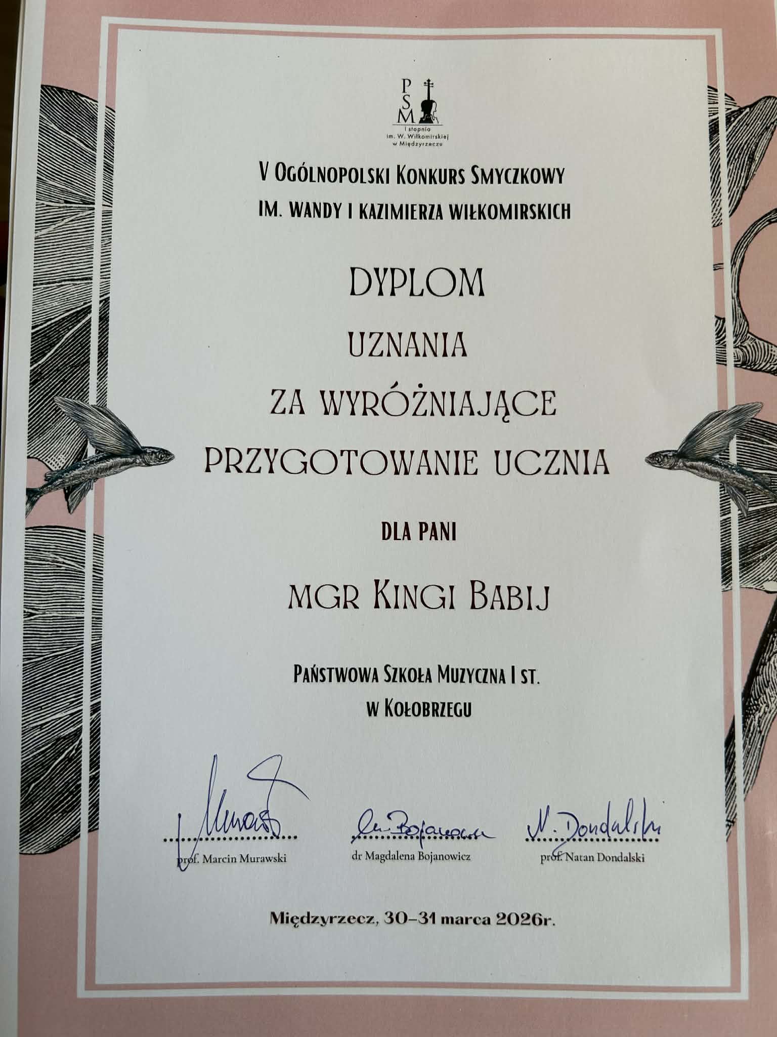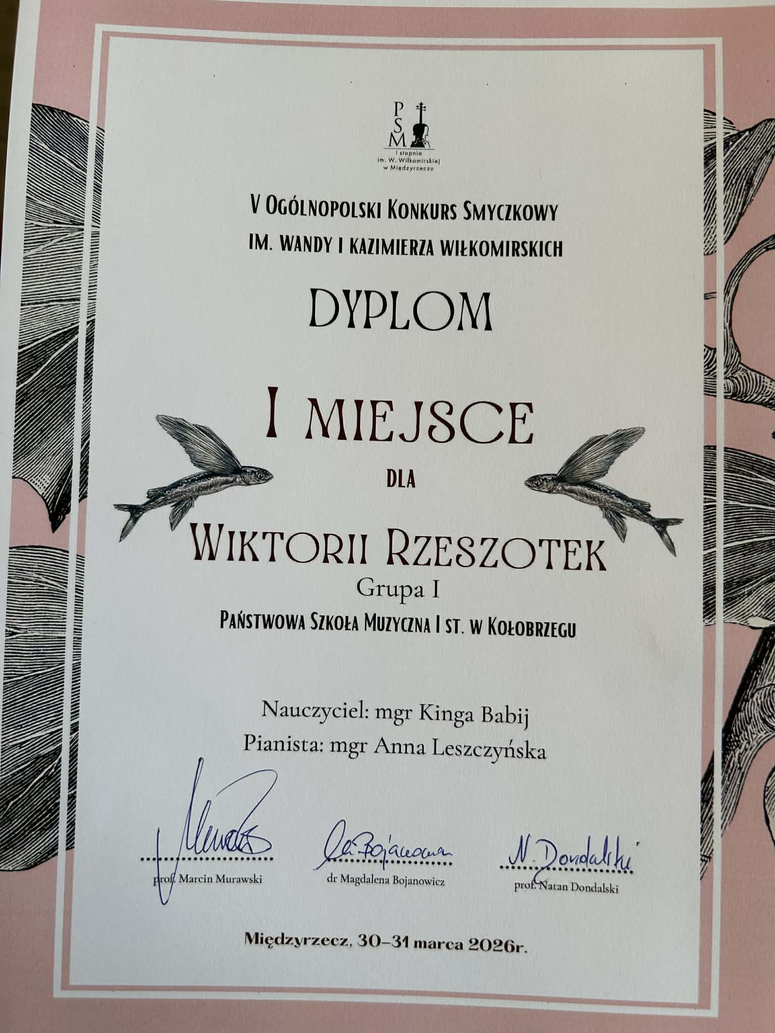 W dniach 30-31 marca 2026 r. w Międzyrzeczu odbywał się V Ogólnopolski Konkurs Smyczkowy im. Wandy i Kazimierza Wiłkomirskich. Uczennica naszej szkoły Wiktoria Rzeszotek zjęła w tym konkursie I miejsce w swojej grupie wiekowej. Wiktoria jest uczennicą klasy II c/6 wiolonczeli u p. Kingi Babij. Na konkursie zaprezentowała sie z towarzyszeniem fortepianowym p. Anny Leszczyńskiej.