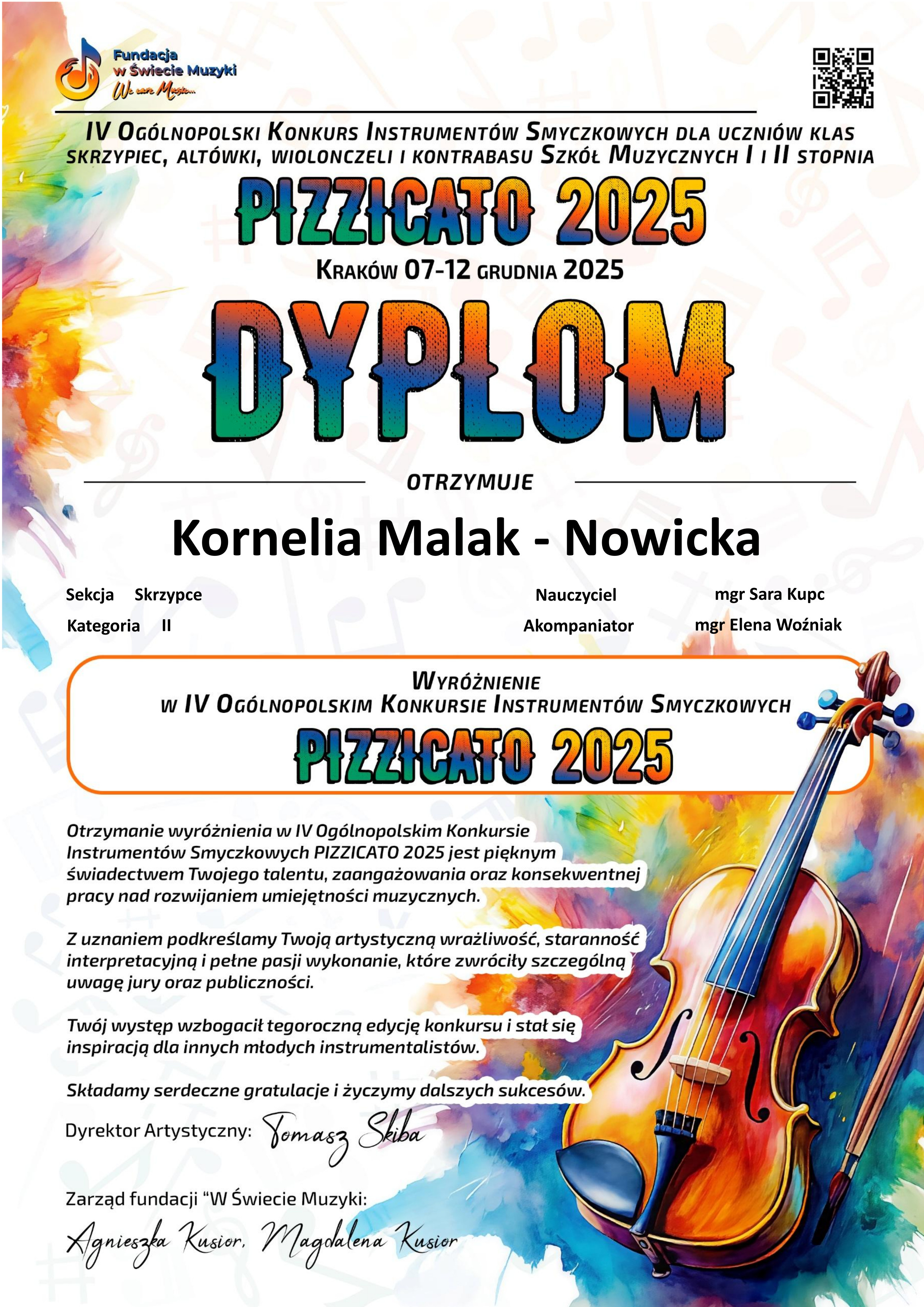 W dniach 07-12 grudnia 2025 odbywał się IV Ogólnopolski Konkurs Instrumentów Smyczkowych "PIZZICATO 2025". W konkursie wzięły udział dwie nasze uczennice: Wiktoria Rzeszotek z klasy wiolonczeli pani Kingi Babij i Kornelia Malak-Nowicka z klasy skrzypiec pani Sary Kupc. Obie odniosły sukcesy w swoich kategoriach: