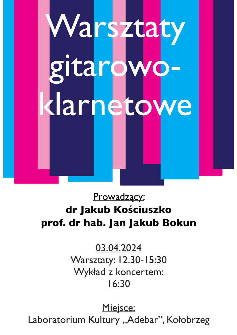 03 kwietnia 2024 odbędą się w naszej szkole Warsztaty metodyczne dla nauczycieli. Warsztaty adresowane są przede wszystkim do nauczycieli gitary i klarnetu, a o godzinie 16:30 rozpocznie się część dostępna dla wszystkich zainteresowanych - będzie to wykład nt. "Kameralistyka - sztuka współpracy" oraz koncert w wykonaniu wykładowców: prof. dr hab. Jan Jakub Bokun - klarnet i dr Jakub Kościuszko - gitara. Miejscem całosci wydarzenia będzie Laboratorium Kultury "Adebar" w podziemiach kołobrzeskiego ratusza.