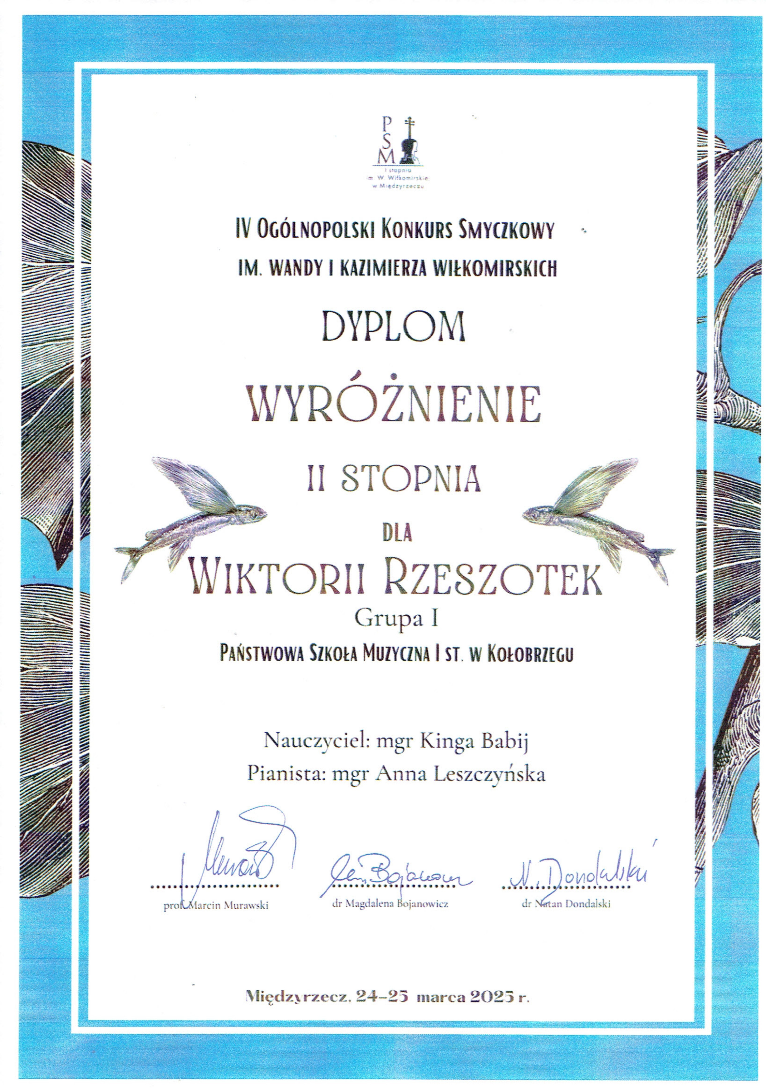 Uczennica klasy I cyklu 6-letniego Wiktoria Rzeszotek uzyskała Wyróżnienie II stopnia w IV Ogólnopolskim Konkursie Smyczkowym im. Wandy i Kazimierza Wiłkomirskich w Międzyrzeczu. Wiktoria uczy sie w klasie wiolonczeli Pani Kingi Babij, a na konkursie wystąpiła z towarzyszeniem fortepianowym Pani Anny Leszczyńskiej.