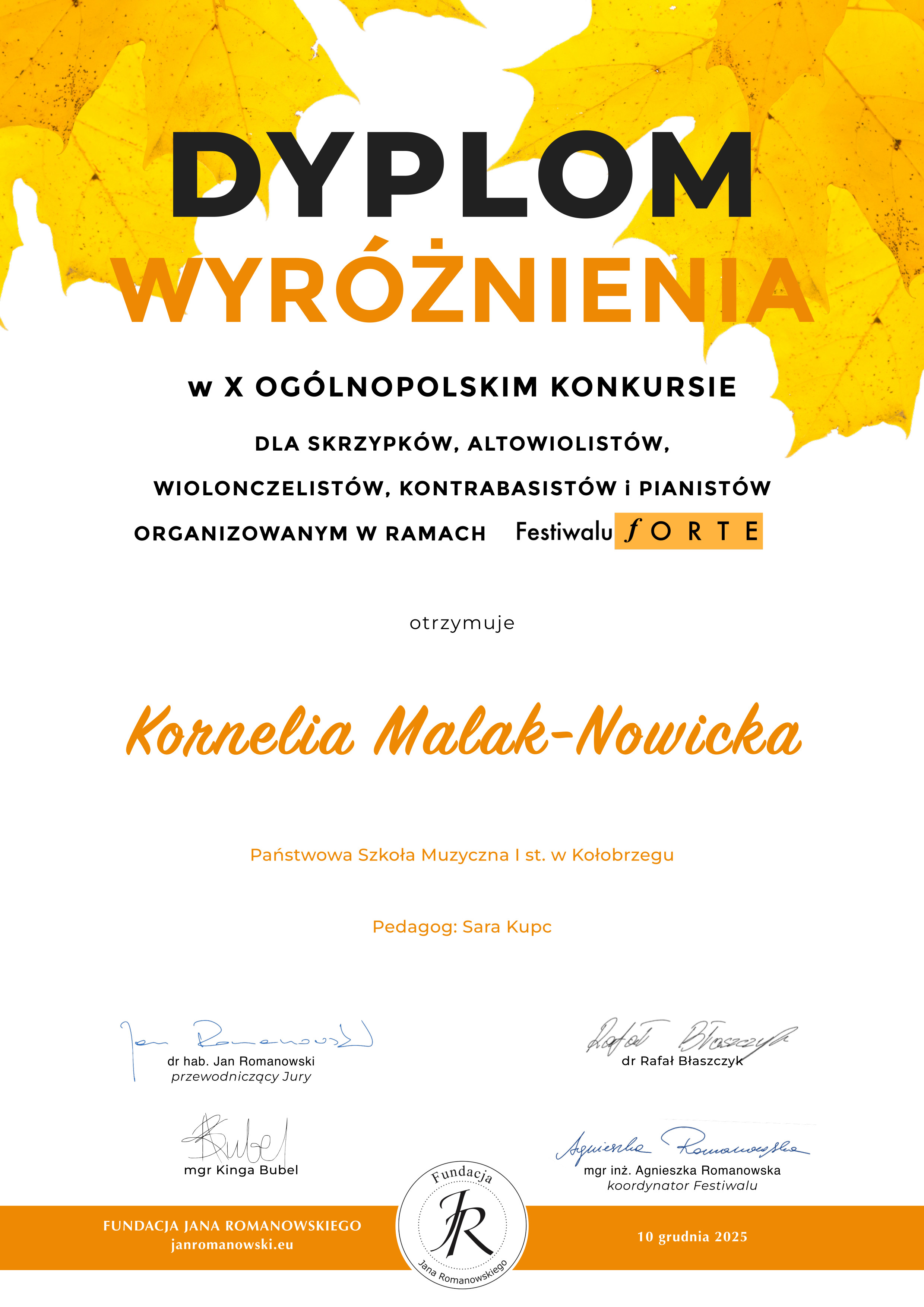 Uczennica klasy IV cyklu 6-letniego - Kornelia Malak-Nowicka uzyskała wyróżnienie w X Ogólnopolskim Konkursie w ramach festiwalu "FORTE". Kornelia jest uczennicą klasy skrzypiec Pani Sary Kupc, a jej akompaniatorem jest Pani Elena Woźniak. Serdecznie gratulujemy sukcesu młodej skrzypaczki!