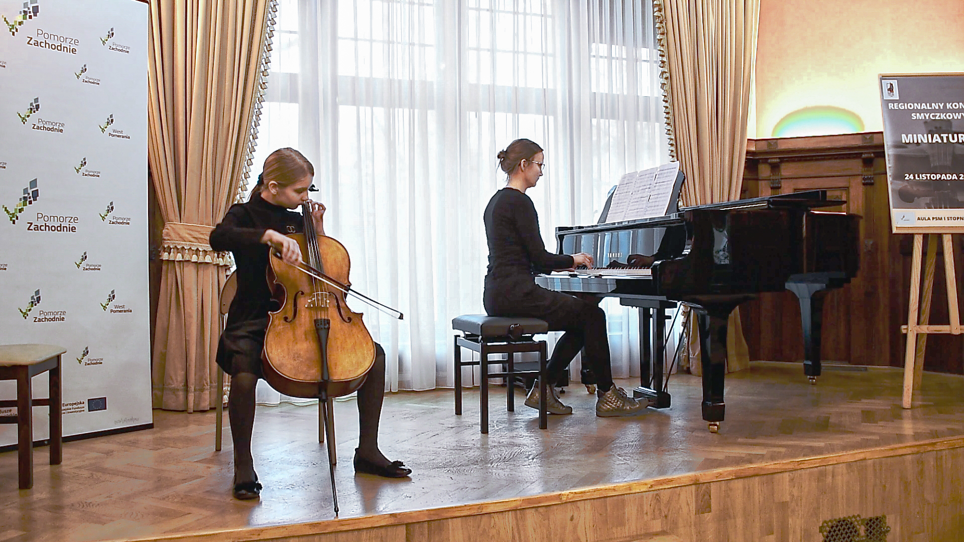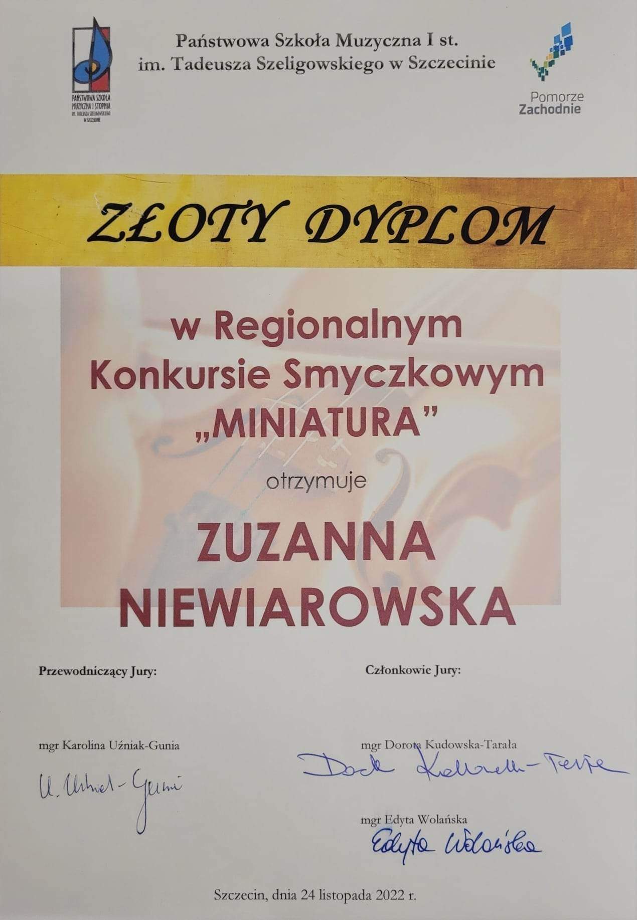 24 listopada 2022 r. w Państwowej Szkole Muzycznej I st. im. Tadeusza Szeligowskiego w Szczecinie odbył się Regionalny Konkurs Smyczkowy "Miniatura". Na tym konkursie młoda wiolonczelistka z naszej szkoły - Zuzia Niewiarowska zdobyła "Złoty Dyplom". Zuzia jest uczennicą klasy wiolonczeli Pani Kingi Babij i Pani Katarzyny Trepiak. Na fortepianie młodej wiolonczelistce towarzyszyła Pani Anna Leszczyńska. Gratulacje dla Zuzi, jej Rodziców i Nauczycielek.