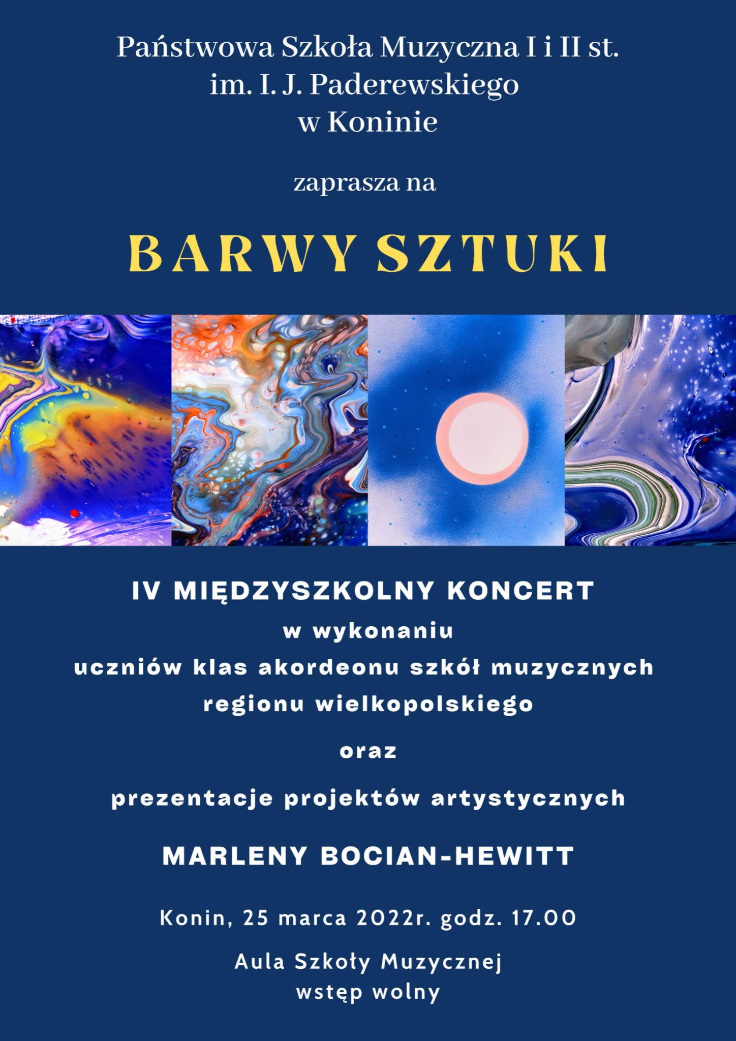 25 marca w naszej szkole odbyła się IV już edycja Międzyszkolnego Koncertu pod nazwą „Barwy Sztuki”. Połączenie malarstwa i muzyki po raz kolejny okazało się być dowodem jak doskonale sztuki te wpływają na siebie, uzupełniają i wzajemnie współgrają. Pan Dyrektor Krzysztof Pydyński przypomniał inicjatorkę tych spotkań, Urszulę Rusin, pedagoga PSM w Koninie, artystkę o wielu talentach, która odeszła przedwcześnie w październiku 2021 r.