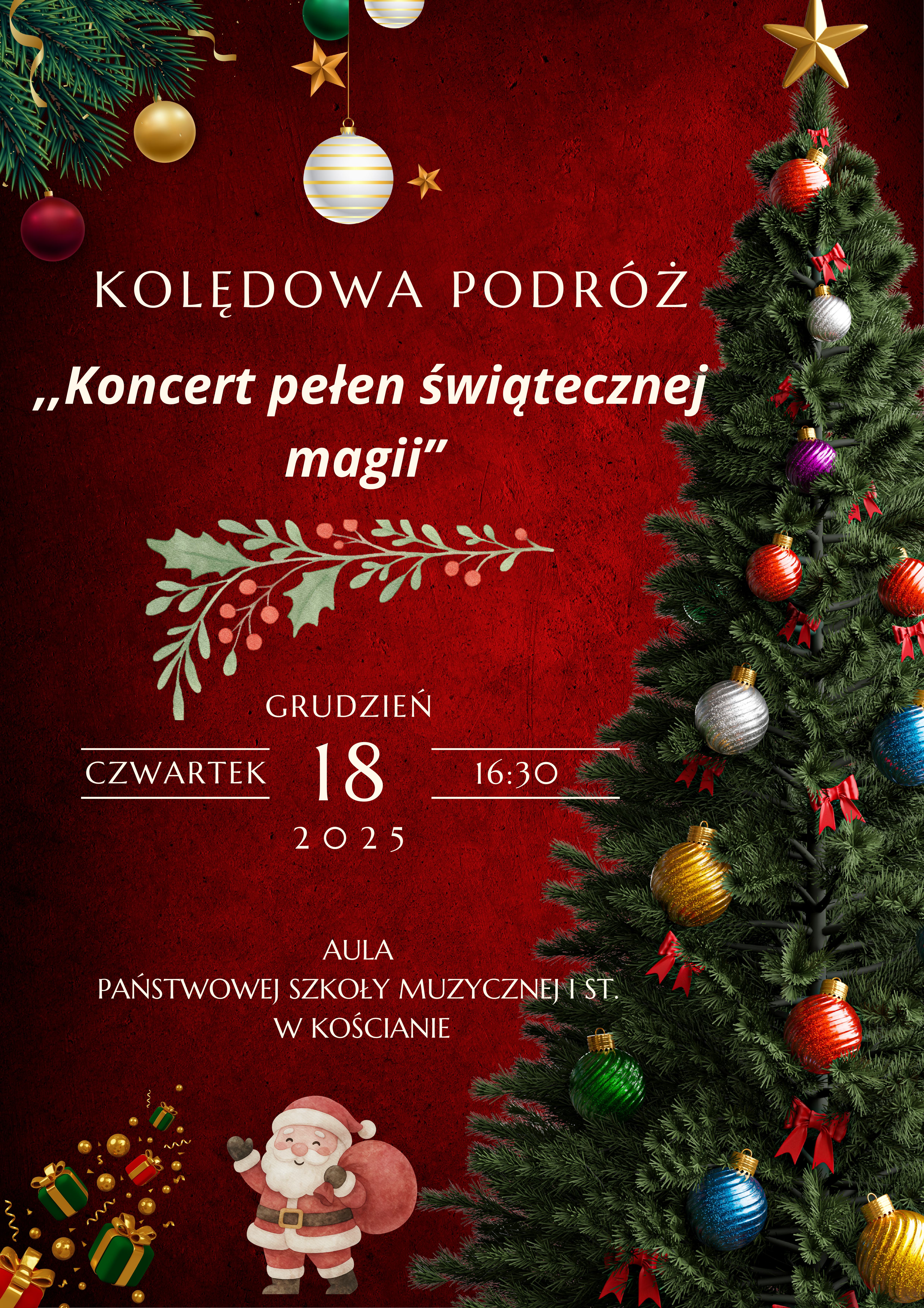 Zapraszamy na koncert gwiazdkowy: Kolędowa podróż "Koncert pełen świątecznej magii", który odbędzie się 18 grudnia 2025 r. o godz. 16:30 w auli PSM.
