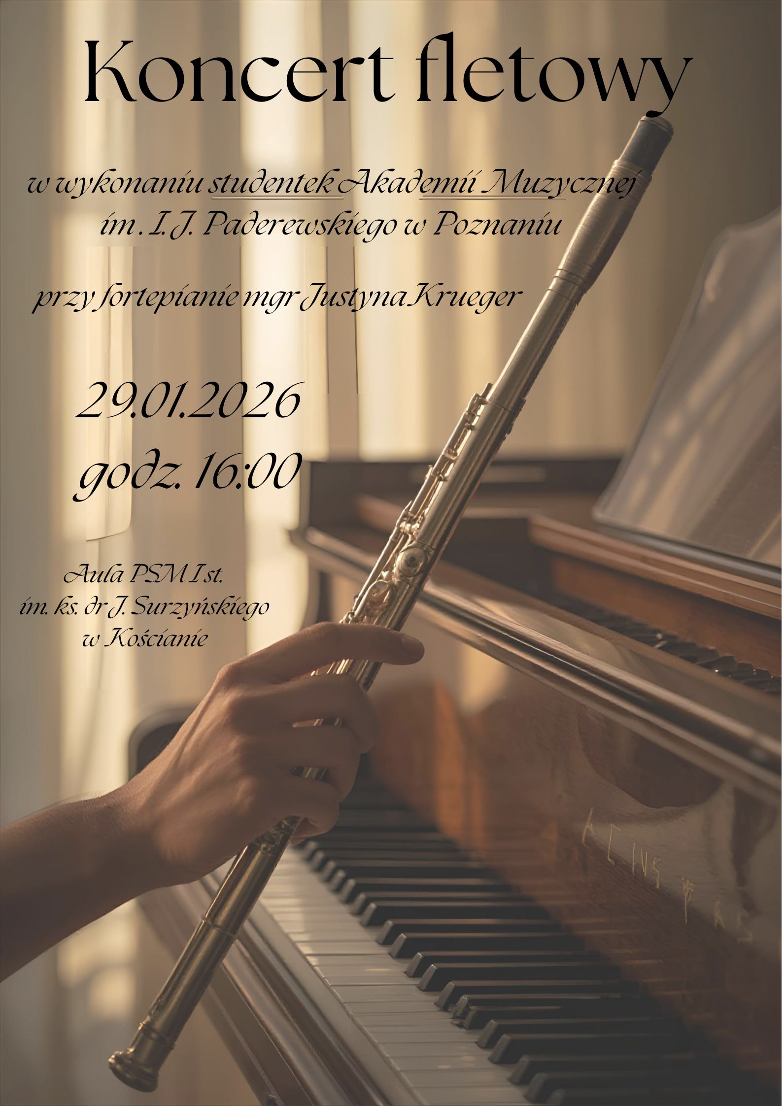 Koncert fletowy w wykonaniu studentek Akademii Muzycznej im. I. J. Paderewskiego w Poznaniu odbędzie się 29 stycznia 2026 r. o godz. 16:00. Przy fortepianie mgr Justyna Krueger. Zapraszamy.