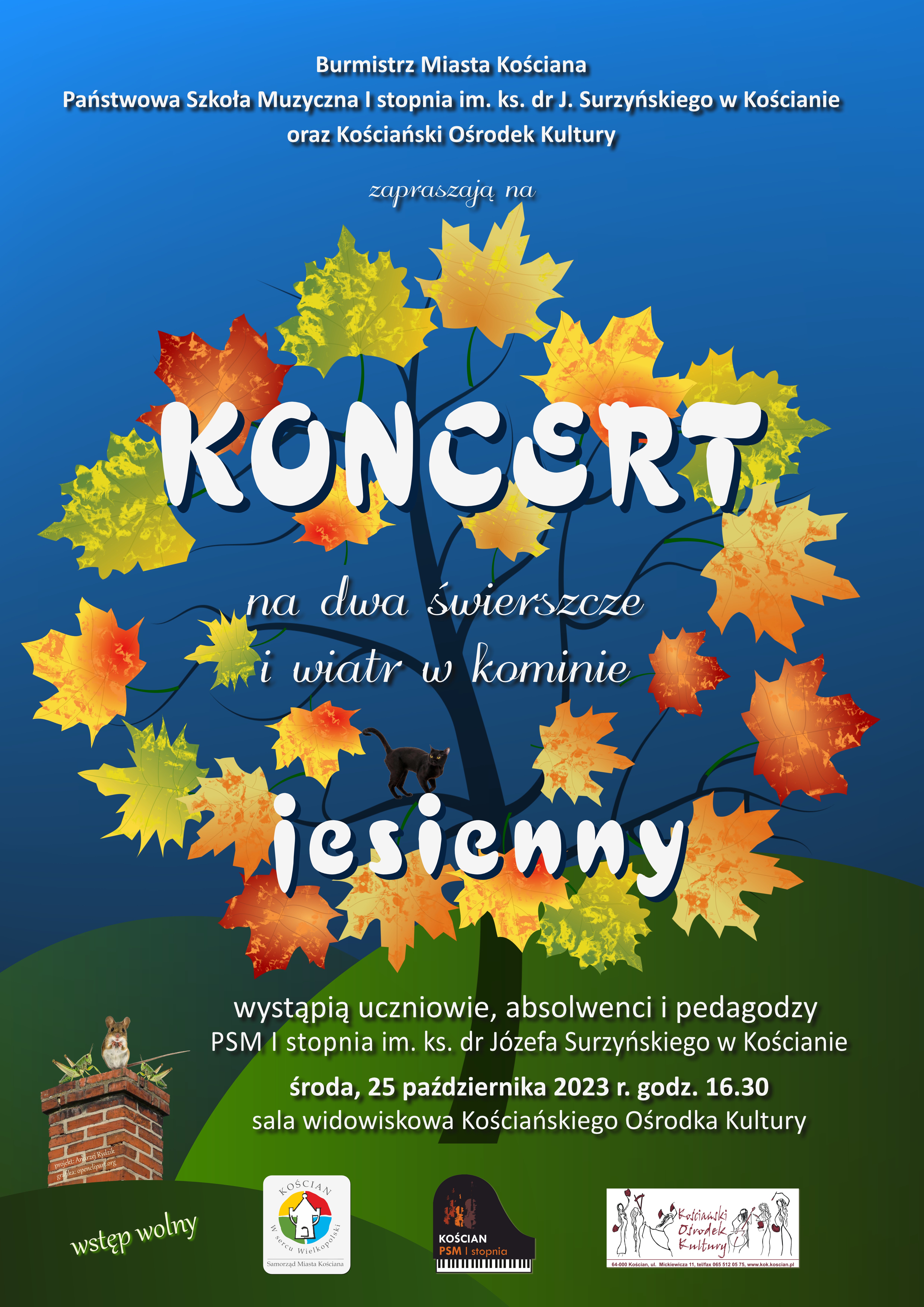Zapraszamy na "Koncert jesienny na dwa świerszcze i wiatr w kominie", który odbędzie się 25 października 2023 r. o godz. 16:30 w sali widowiskowej Kościańskiego Ośrodka Kultury. Wystąpią uczniowie, absolwenci i pedagodzy PSM w Kościanie. Wstęp wolny.