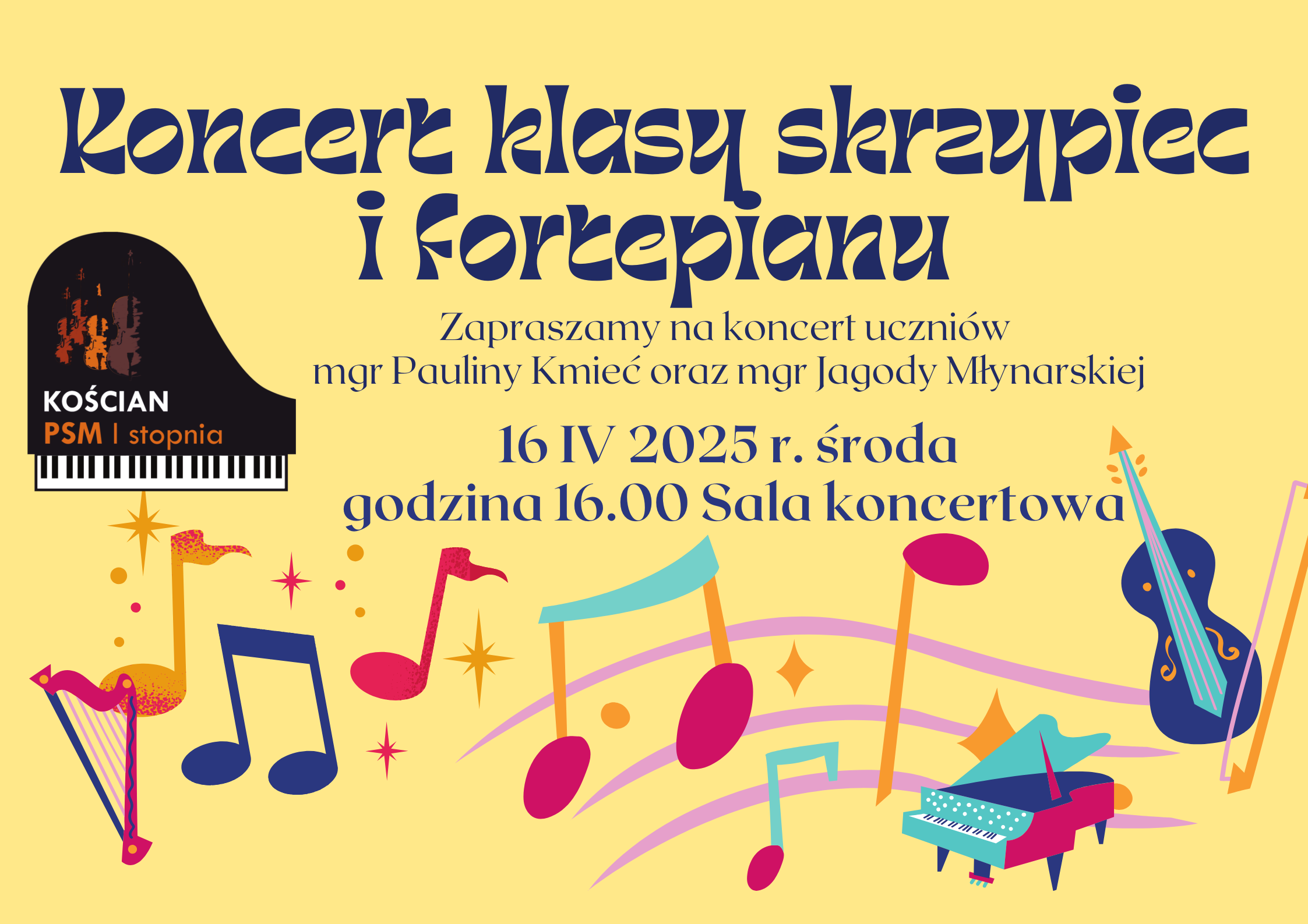 Zapraszamy na Koncert klasy skrzypiec i fortepianu Pauliny Kmieć i Jagody Młynarskiej, który dobędzie się 16 kwietnia 2025 r. o 16:00 w auli PSM