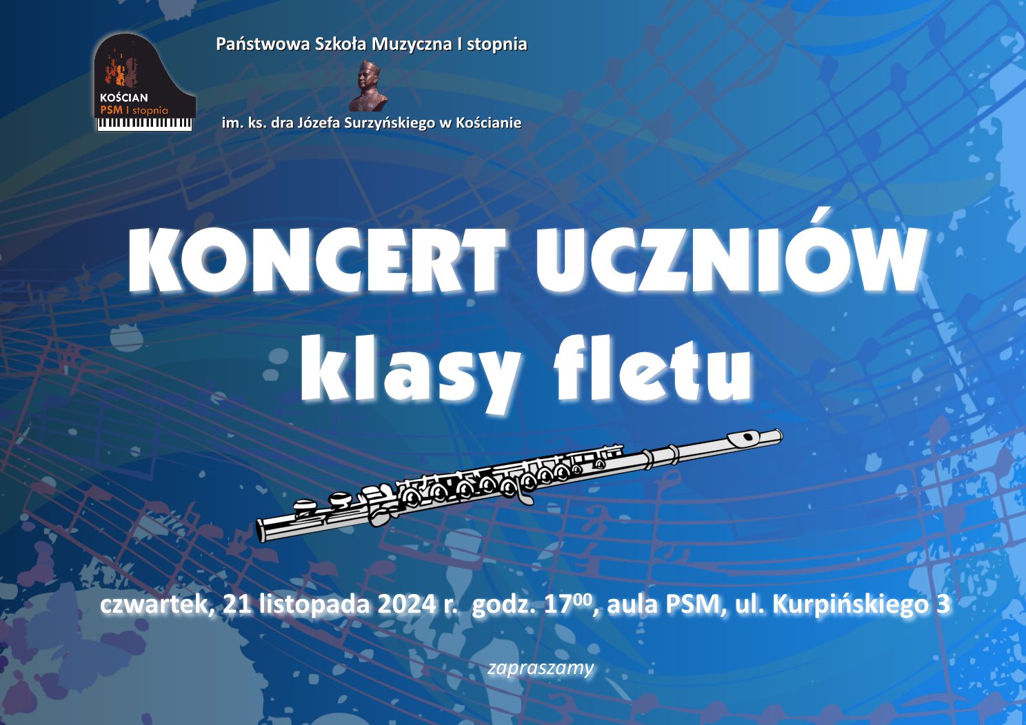 Zapraszamy na Koncert uczniów klasy fletu w czwartek 21listopada 2024 r. o godz. 17:00.