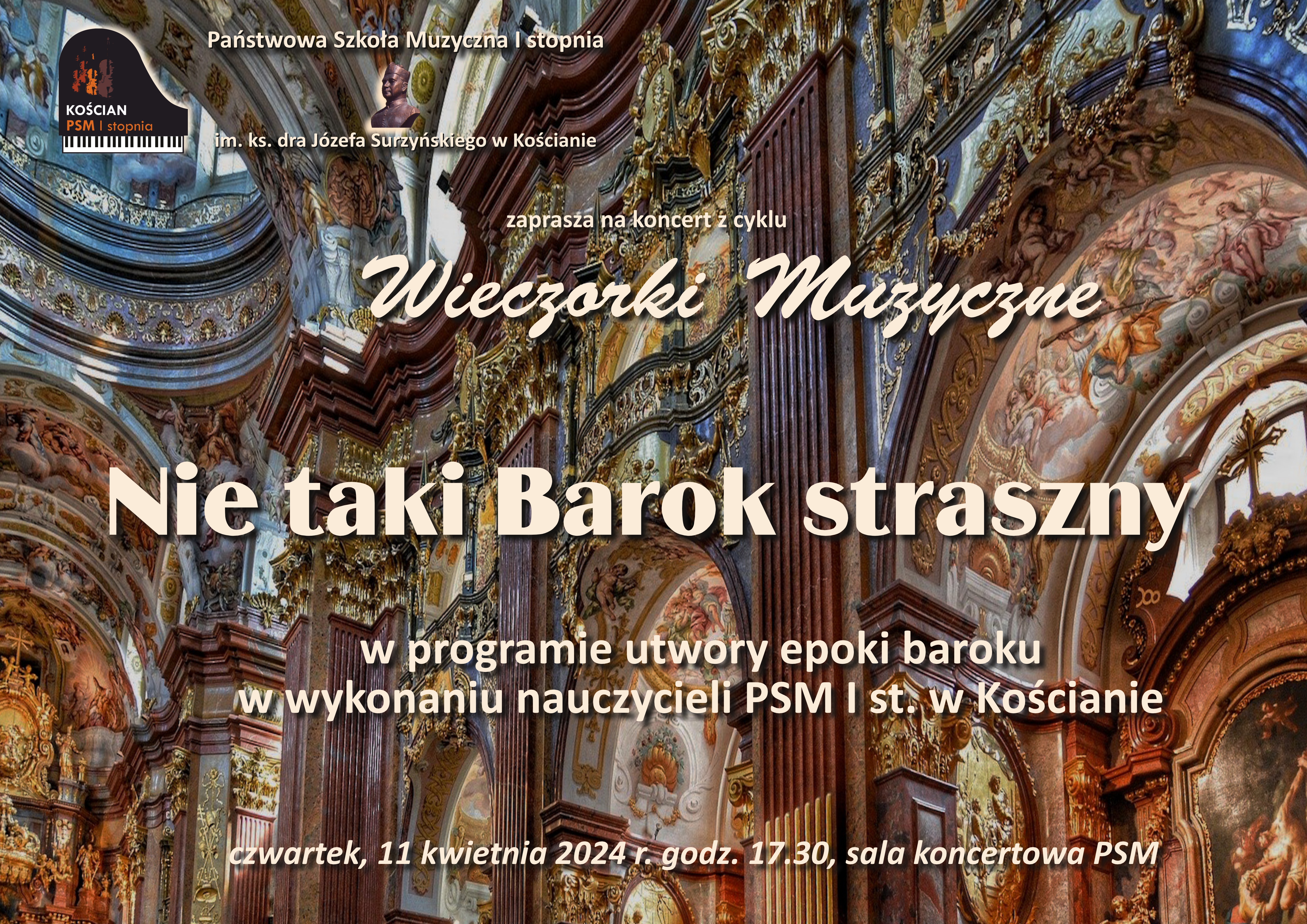 Zapraszamy na koncert z cyklu Wieczorki muzyczne zatytułowany "Nie taki Barok straszny ". W programie utwory epoki baroku w wykonaniu nauczycieli PSM w Kościanie. Koncert odbędzie się w czwartek, 11 kwietnia 2024 r. o godz. 17:30.