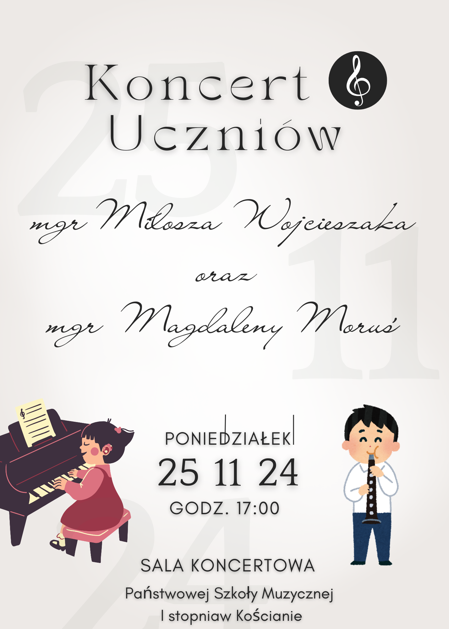 Zapraszamy na Koncert uczniów klasy klarnetu Miłosza Wojcieszaka i klasy fortepianu Magdaleny Moruś, który odbędzie się 25 listopada 2024 r. o godz. 17:00.