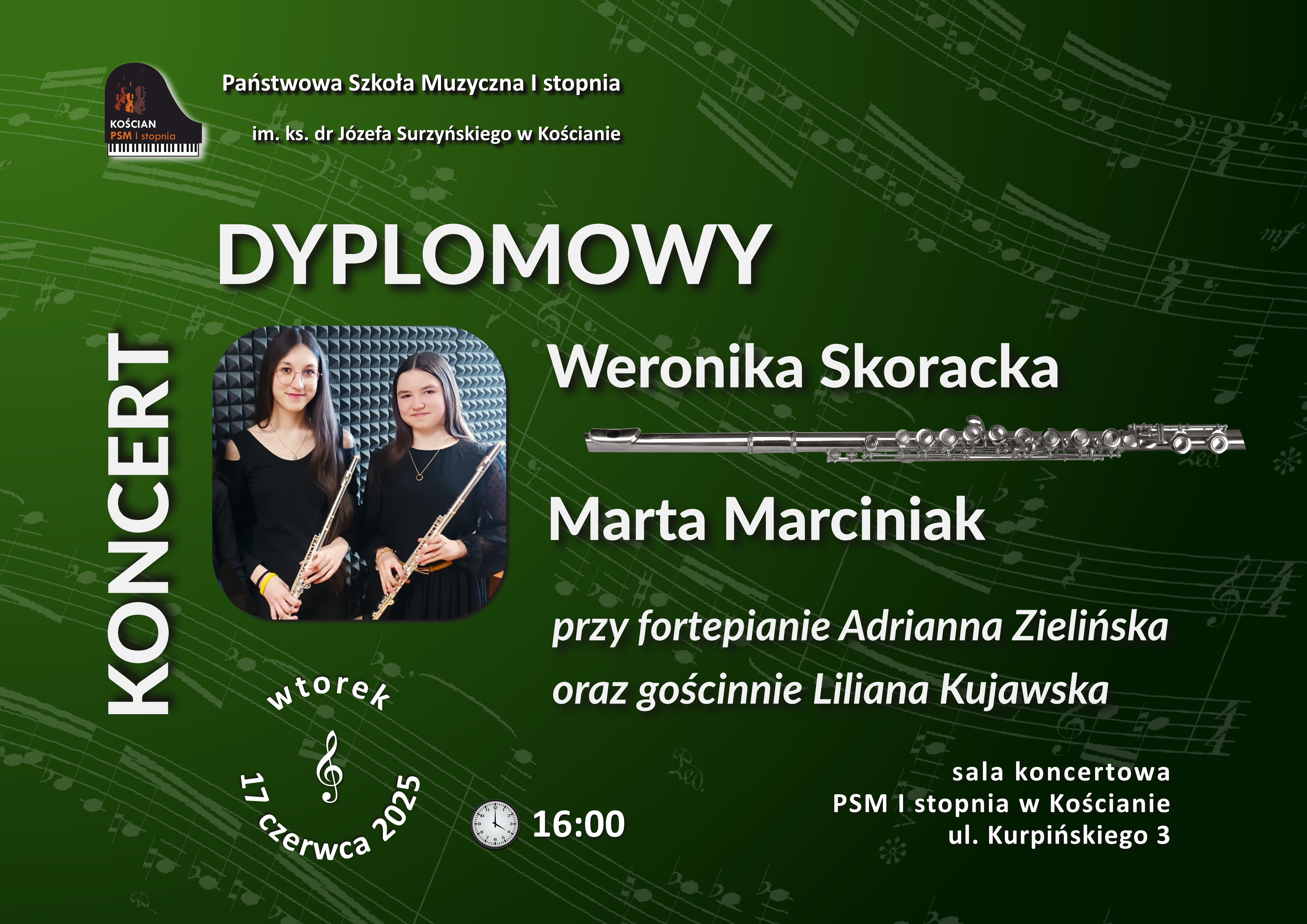 Koncert dyplomowy Weroniki Skorackiej i Marty Marciniak z klasy fletu Agnieszki Panas odbędzie się we wtorek 17 czerwca 2025 r. o godz. 16:00 w sali koncertowej PSM.