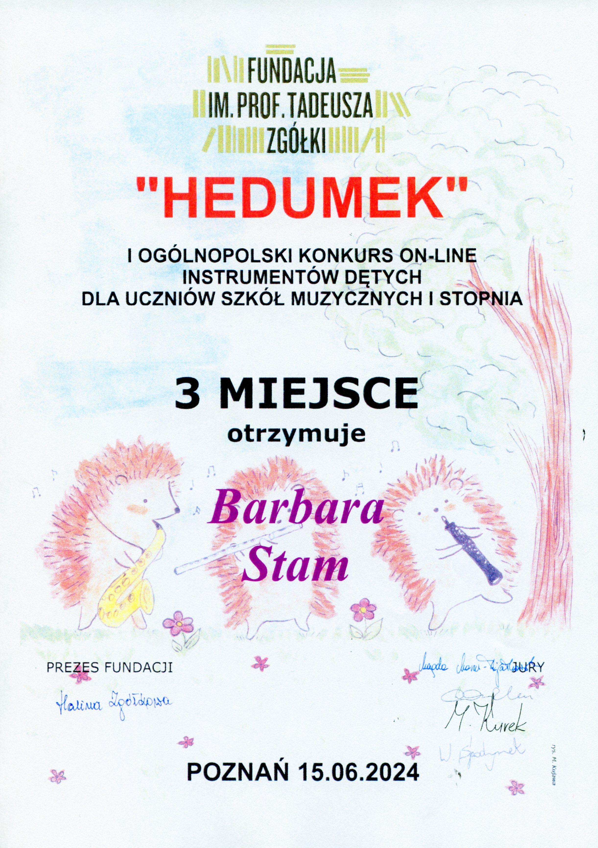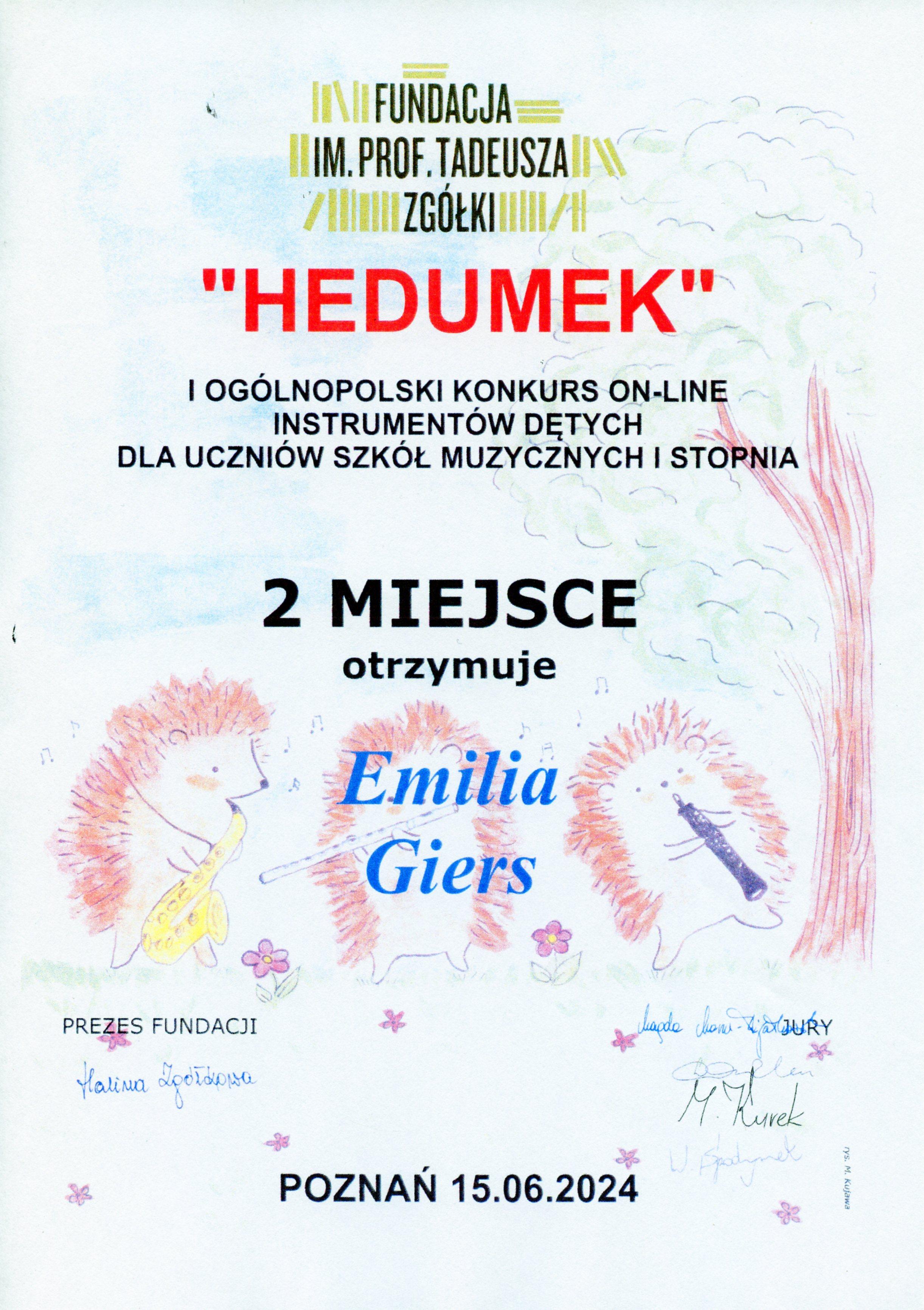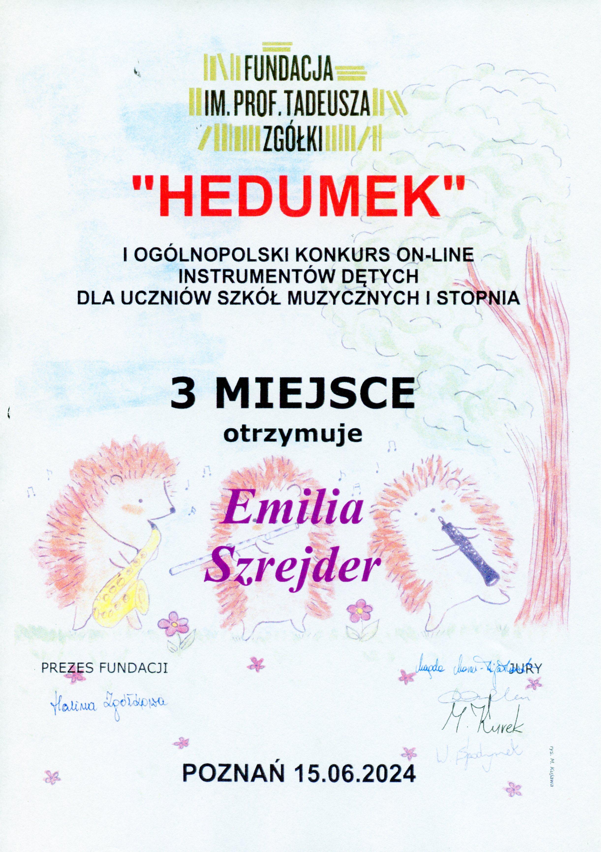 w dniu 15 czerwca 2024 r. odbył się I Ogólnopolski Konkurs On-line Instrumentów Dętych Dla Uczniów Szkół Muzycznych I stopnia „Hedumek” zorganizowany przez Fundację im. prof. Tadeusza Zgółki w Poznaniu. Udział wzięły trzy uczennice klasy fletu Agnieszki Panas.