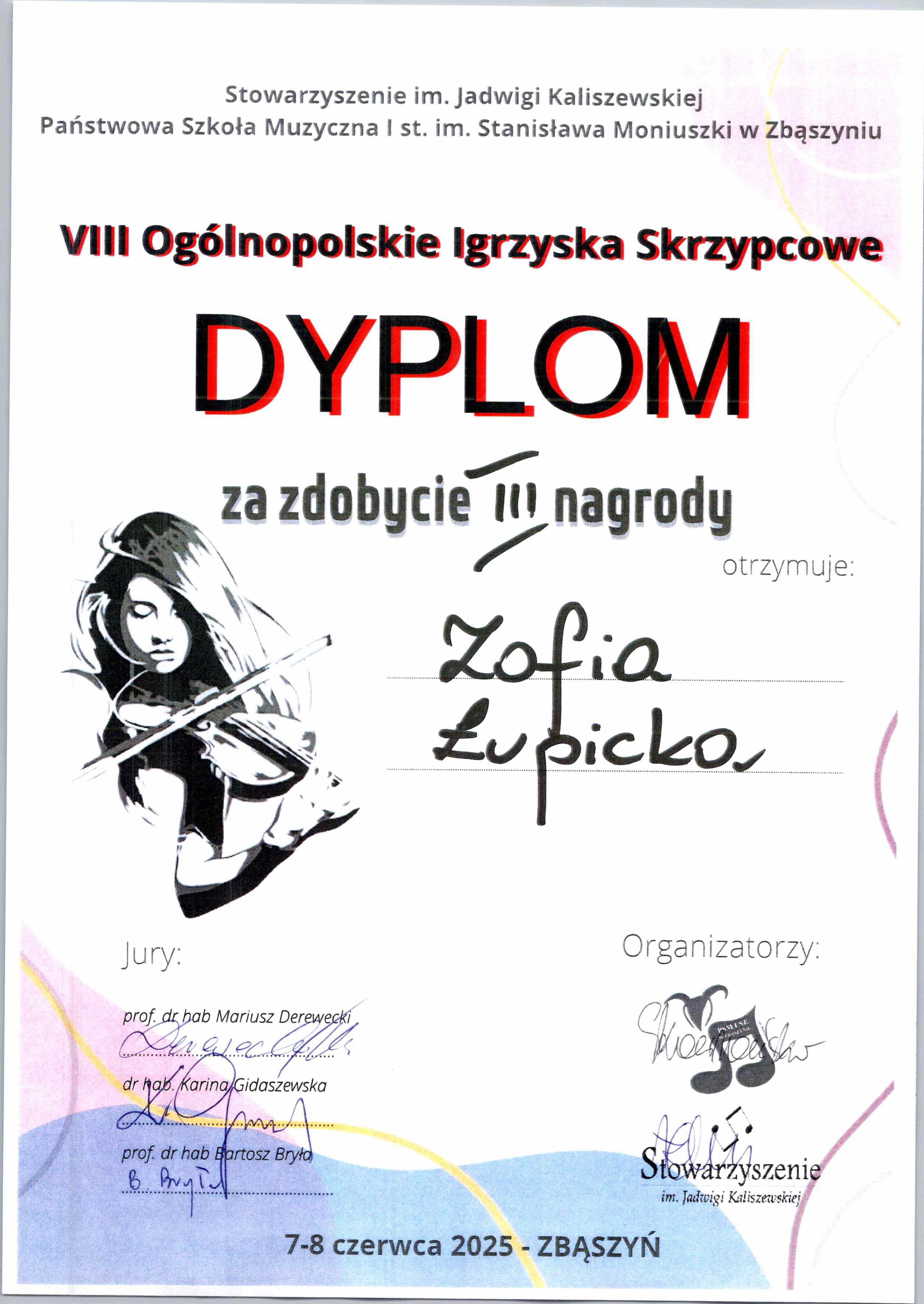 Zofia Łupicka z klasy skrzypiec Pauliny Kmieć zajęła III miejsca w VIII Ogólnopolskich Igrzyskach Skrzypcowych, które odbyły się w dniach 7-8 czerwca 2025 r. w Zbąszyniu. Gratulujemy.