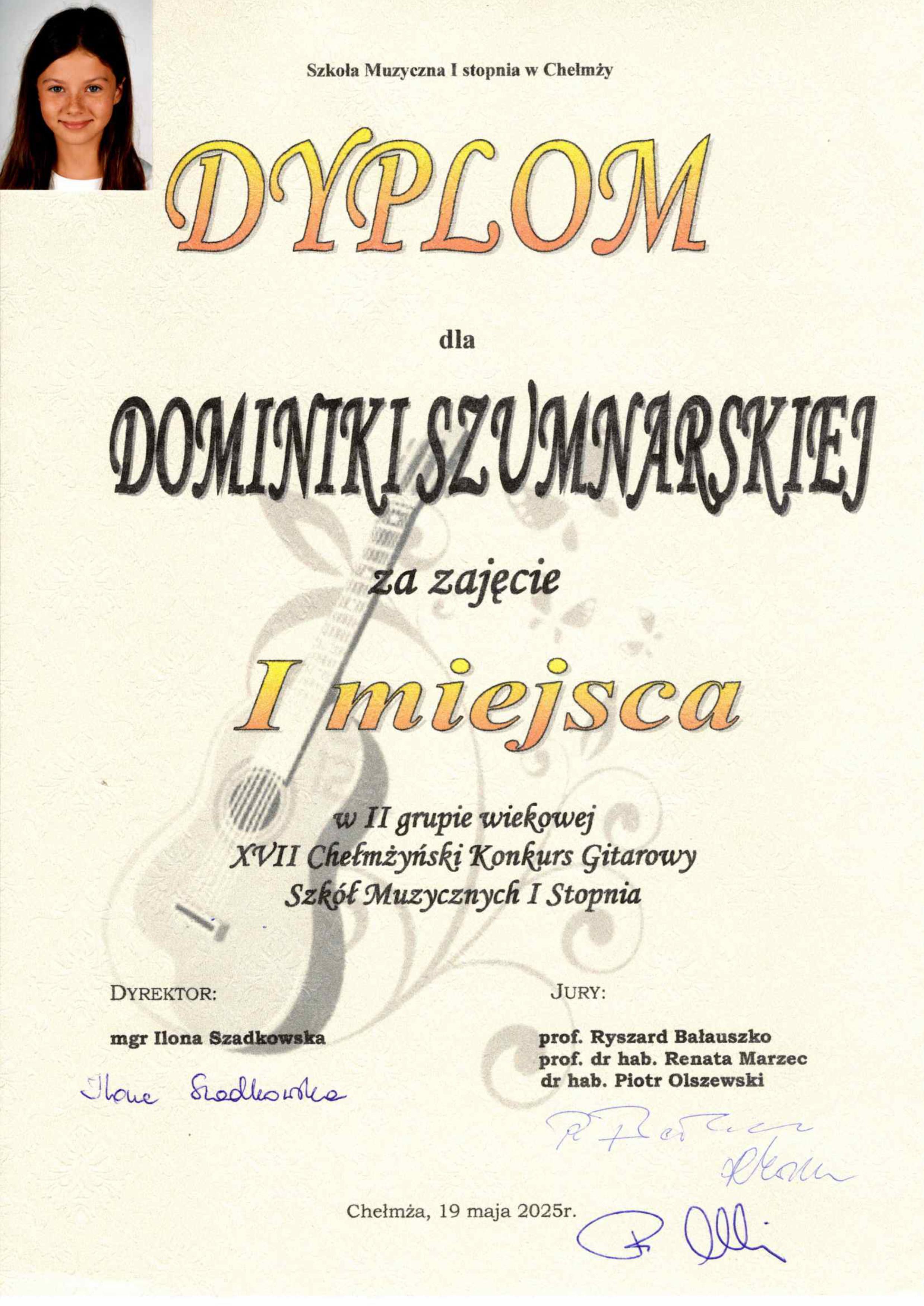 Dominika Szumnarska z klasy Krzysztofa Mieszały zajęła I miejsce w II grupie wiekowej na XVII Chełmżyńskim Konkursie Gitarowym Szkół Muzycznych I Stopnia. Gratulujemy sukcesu.