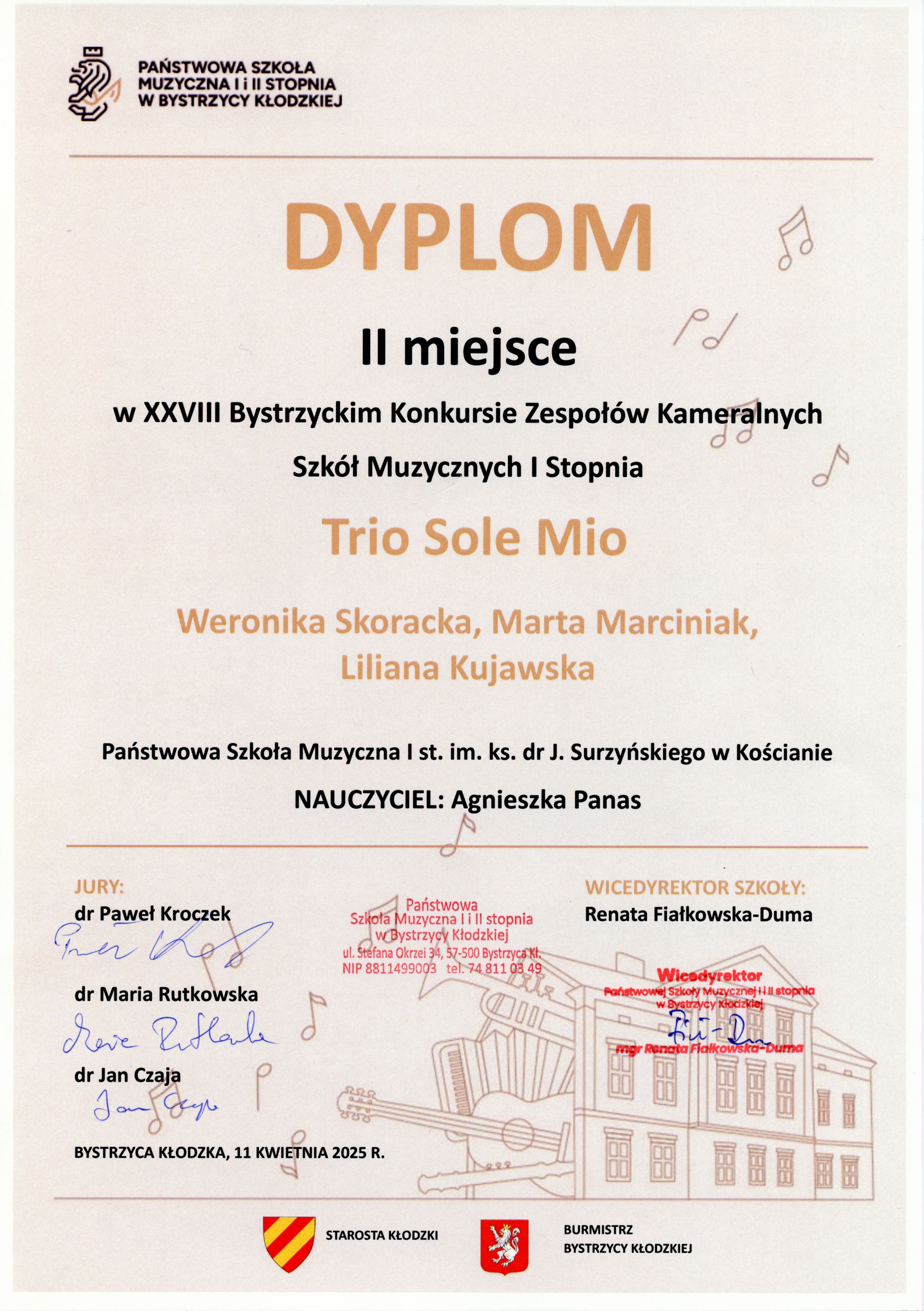 Trio Sole Mio zdobyło II nagrodę na XXVIII Bystrzyckim Konkursie Zespołów Kameralnych Szkół Muzycznych I st. w Bystrzycy Kłodzkiej, który odbył się w dniu 11 kwietnia 2025 r. W skład zespołu weszły Weronika Skoracka i Marta Marciniak z klasy fletu Agnieszki Panas oraz Liliana Kujawska z klasy fortepianu Adrianny Zielińskiej. Gratulujemy sukcesu.