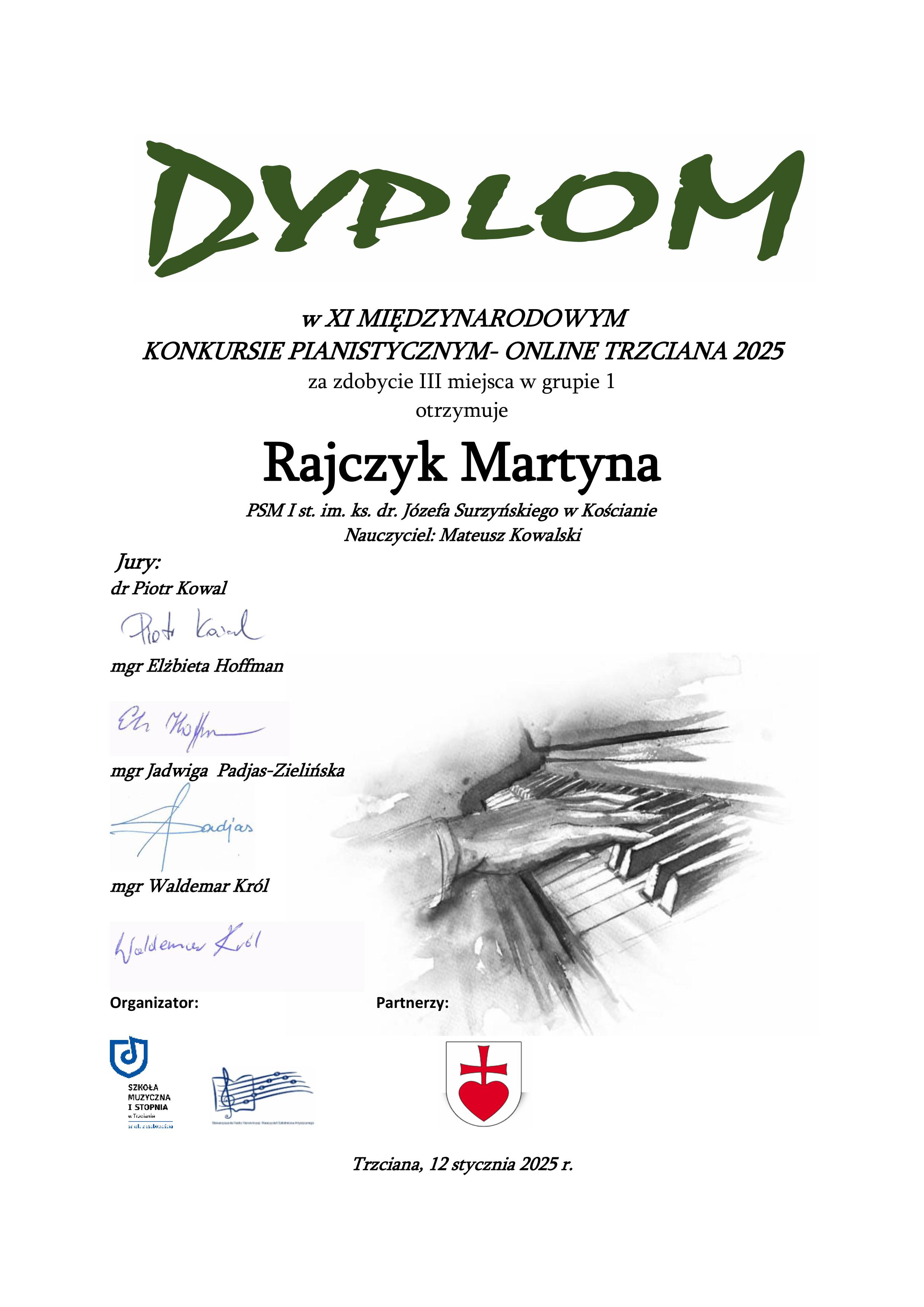 Martyna Rajczyk z klasy fortepianu Mateusza Kowalskiego zajęła III miejsce w XI Międzynarodowym Konkursie Pianistycznym on-line - Trzciana, 10-12 stycznia 2025 r.