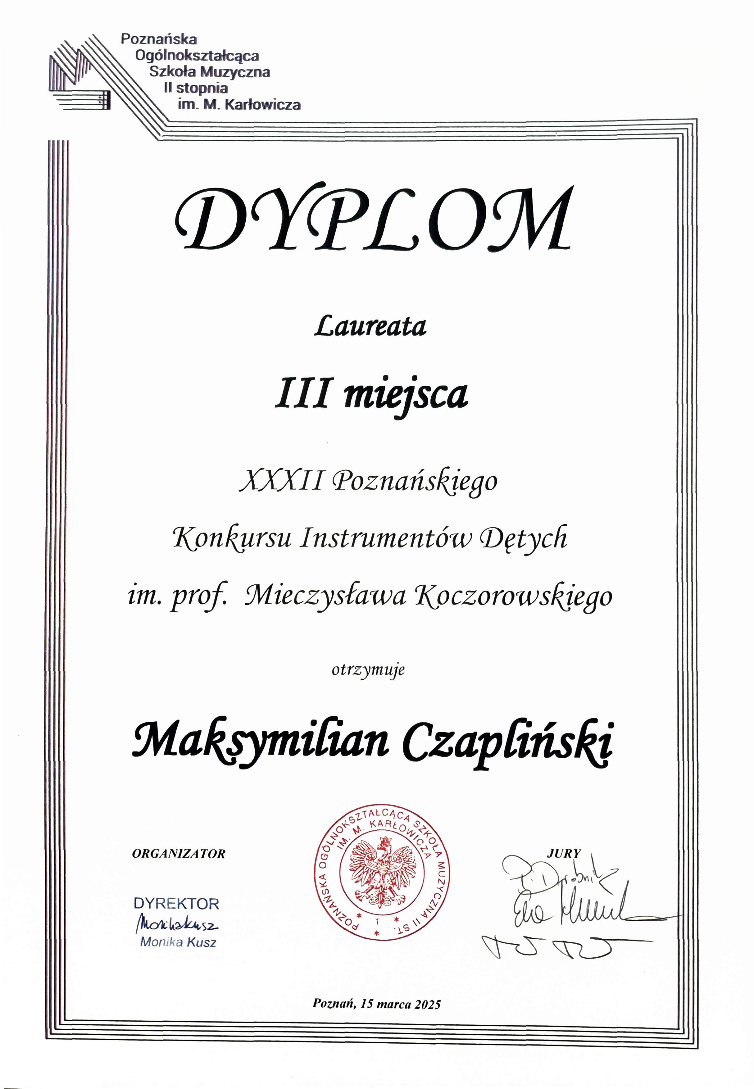 Maksymilian Czapliński z klasy klarnetu p. Miłosza Wojcieszaka zdobył III miejsce na XXXII Poznańskim Konkursie Instrumentów Dętych im. prof. Mieczysława Koczorowskiego, który odbył się dnia 15 marca 2025 r. Serdecznie gratulujemy i życzymy dalszych sukcesów!