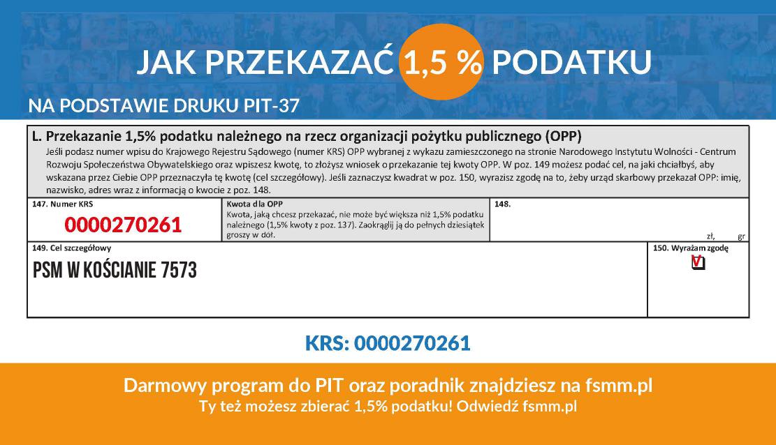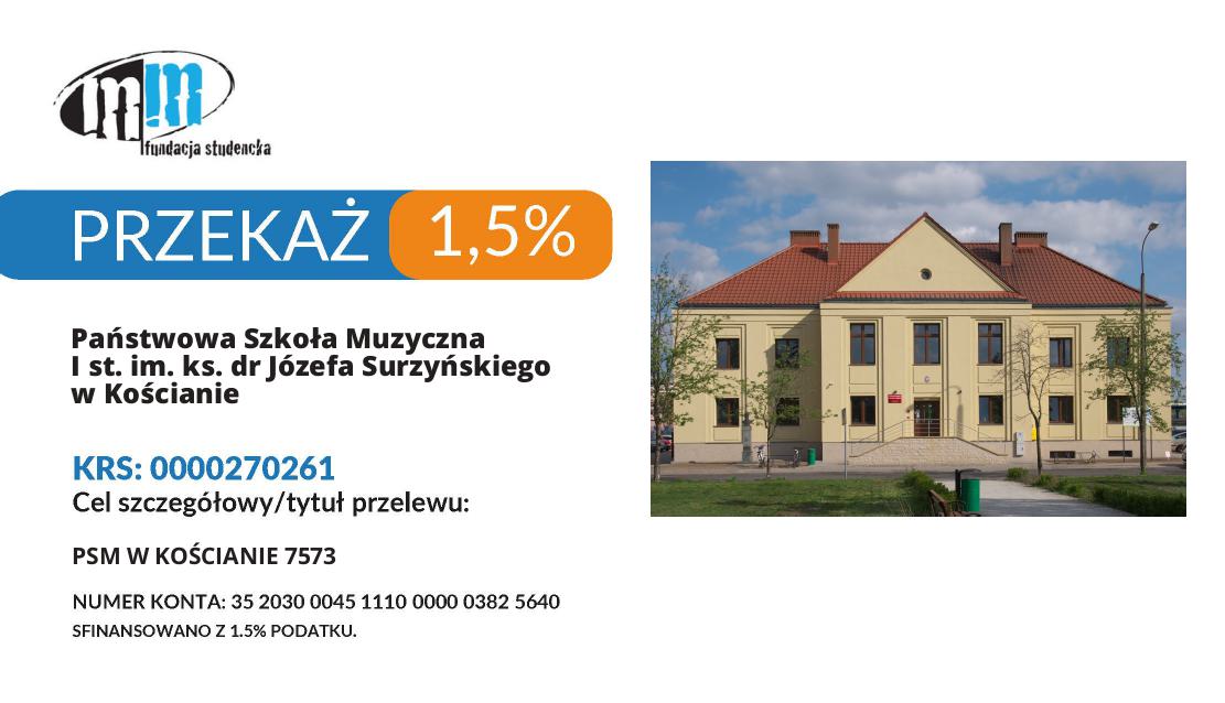 Prosimy o uwzględnienie w Państwa rozliczeniach podatkowych za 2024 rok 1,5% podatku i przekazanie go na cele statutowe szkoły.