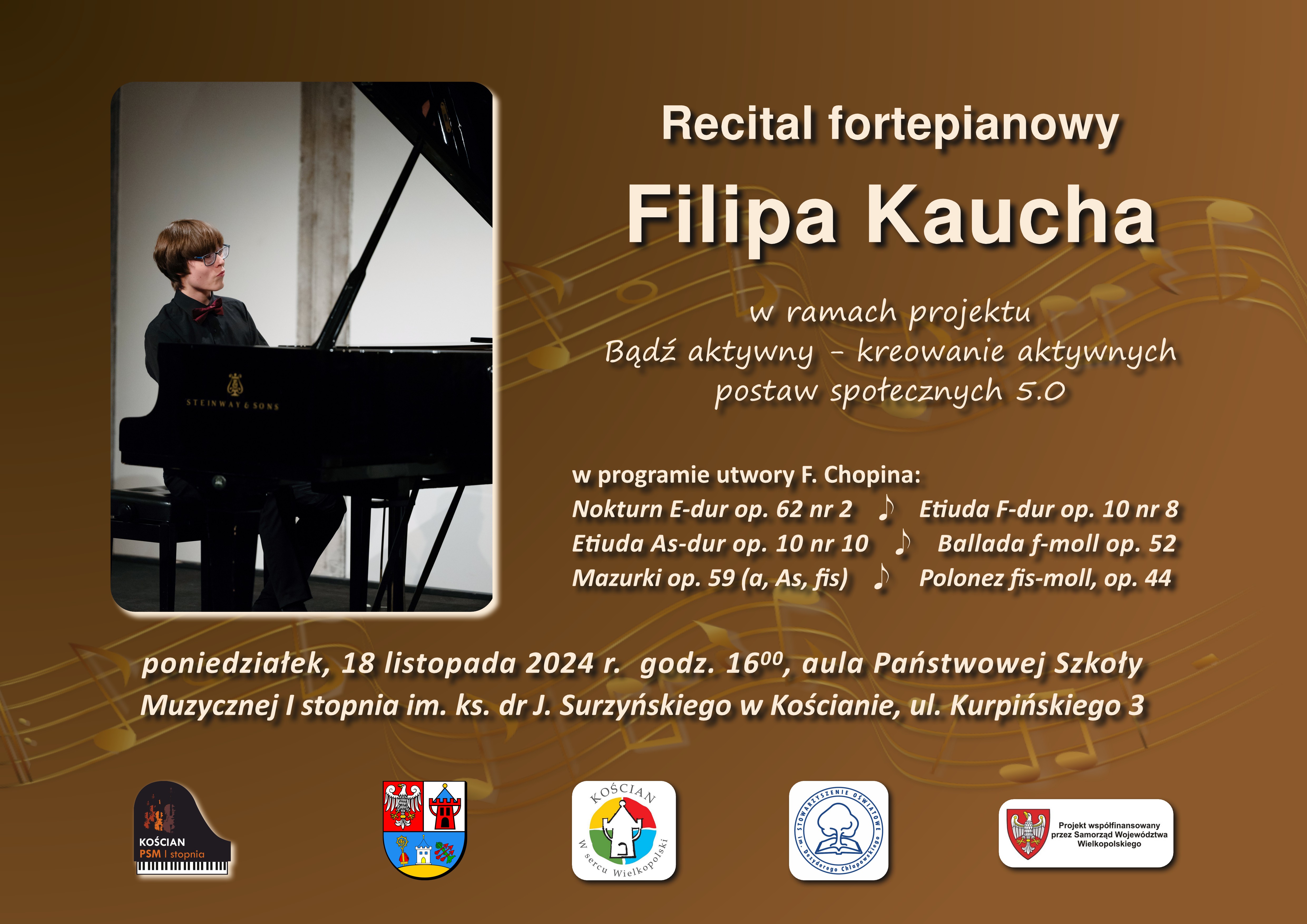 Recital fortepianowy naszego absolwenta Filipa Kaucha odbędzie się w poniedziałek 18 listopada 2024 r. o godz. 16:00 w auli PSM. W programoe utwory Fryderyka Chopina.