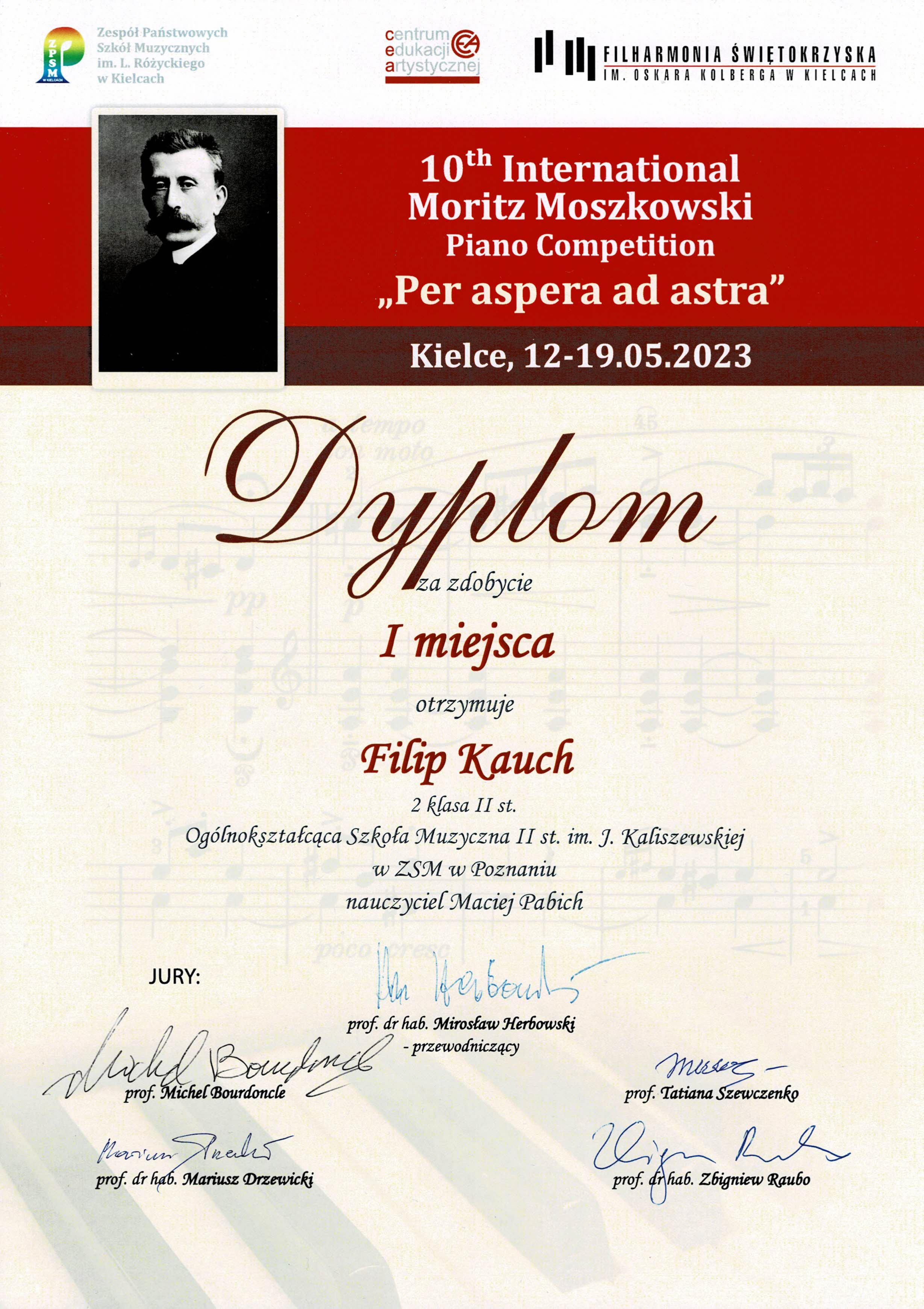 Absolwent naszej szkoły Filip Kauch został laureatem I nagrody w grupie B oraz zdobywcą nagrody specjalnej za najlepsze wykonanie utworu Maurycego Moszkowskiego na X Międzynarodowym Konkursie Pianistycznym im. Maurycego Moszkowskiego „Per aspera ad astra” w Kielcach, który odbywa się w dniach 13-16 kwietnia 2023 r. Konkurs jest bardzo prestiżowy i wpisany w kalendarz imprez organizowanych przez Centrum Edukacji Artystycznej w Warszawie.