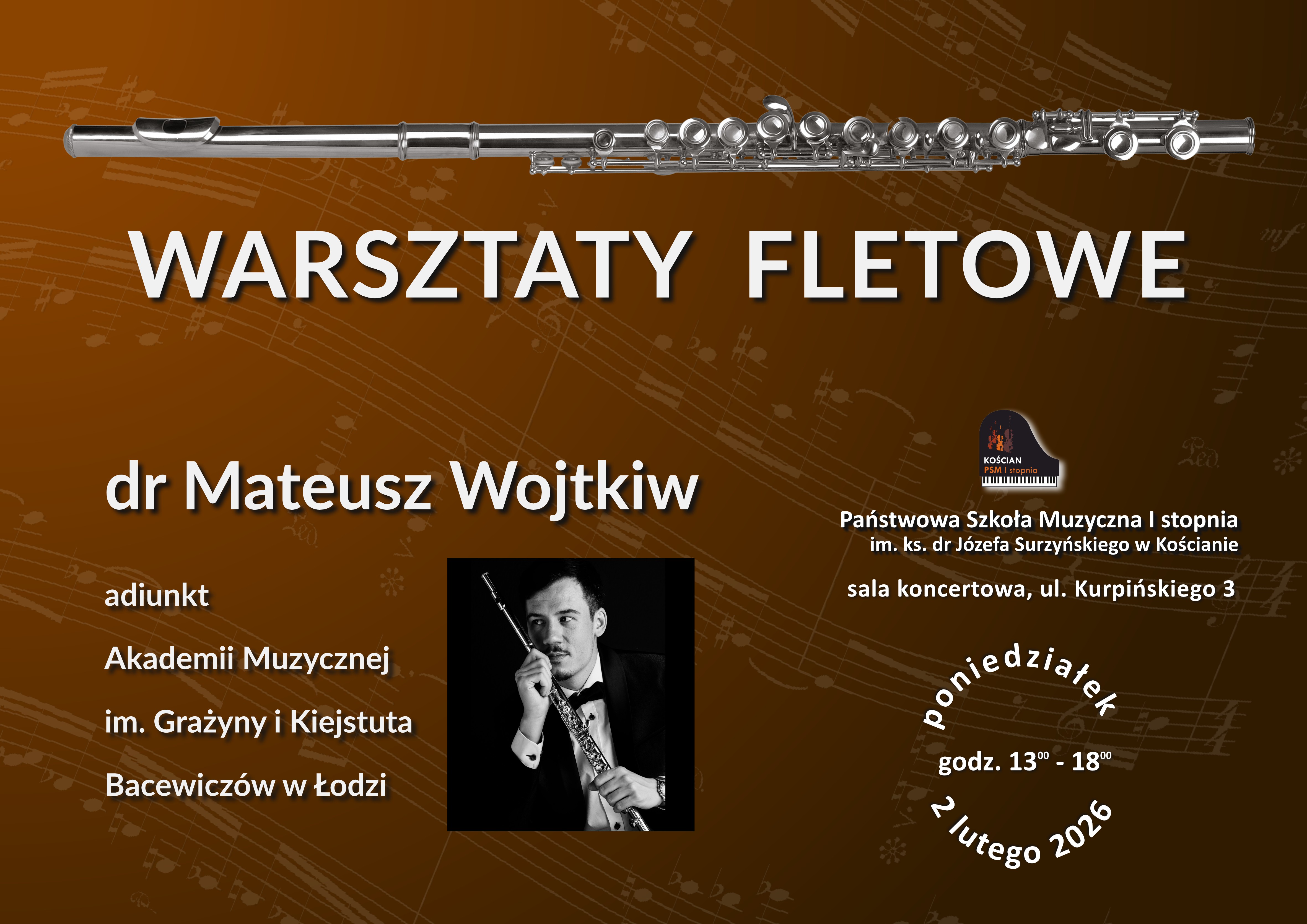 Warsztaty fletowe odbędą się w poniedziałek 2 lutego 2026 r. w godzinach od 13:00 do 18:00. Warsztaty poprowadzi dr Mateusz WOJTKIW, adiunkt Akademii Muzycznej im. Grażyny i Kiejstuta Bacewiczów w Łodzi